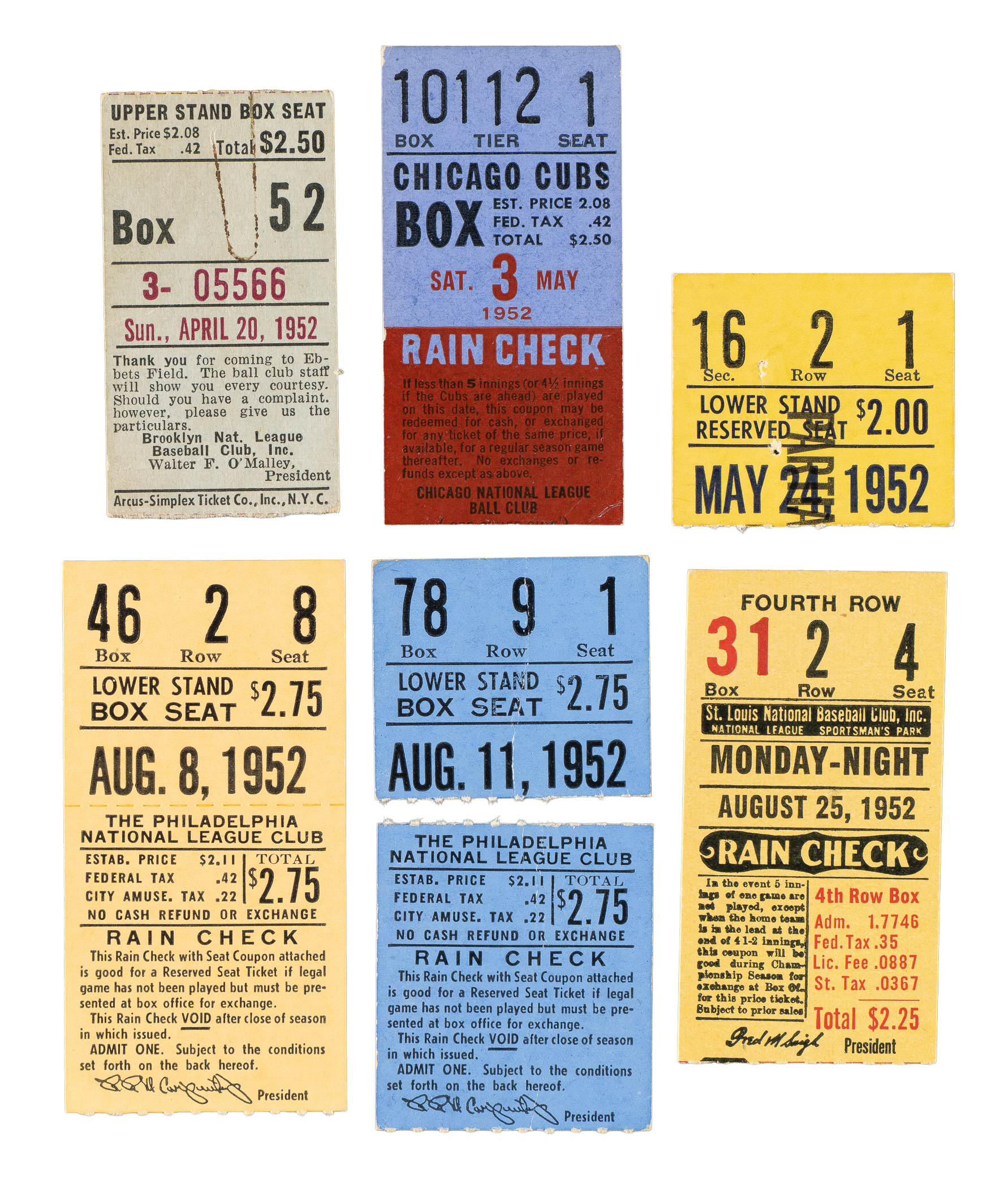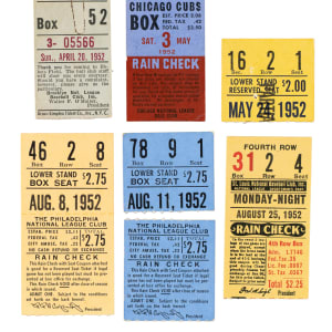 Collection of ten regular-season ticket stubs from the 1952 Brooklyn Dodgers season. Jackie Robinson appeared in all of the games listed in this group. Also included are games in which home runs were hit by Roy Campanella. Each stub has the date printed on the front, which is provided in the composite below. This collection consists of the following road games: April 20 vs. Giants, May 3 vs. Cubs, May 24 vs. Phillies, August 8 vs. Phillies, August 11 vs. Phillies, August 25 vs. Cardinals, August 26 vs. Cardinals, August 29 vs. Cubs, September 5 vs. Braves, and September 7 vs. Giants. The stubs, which vary in size, range from Poor to Vg condition. Total: 10 ticket stubs.