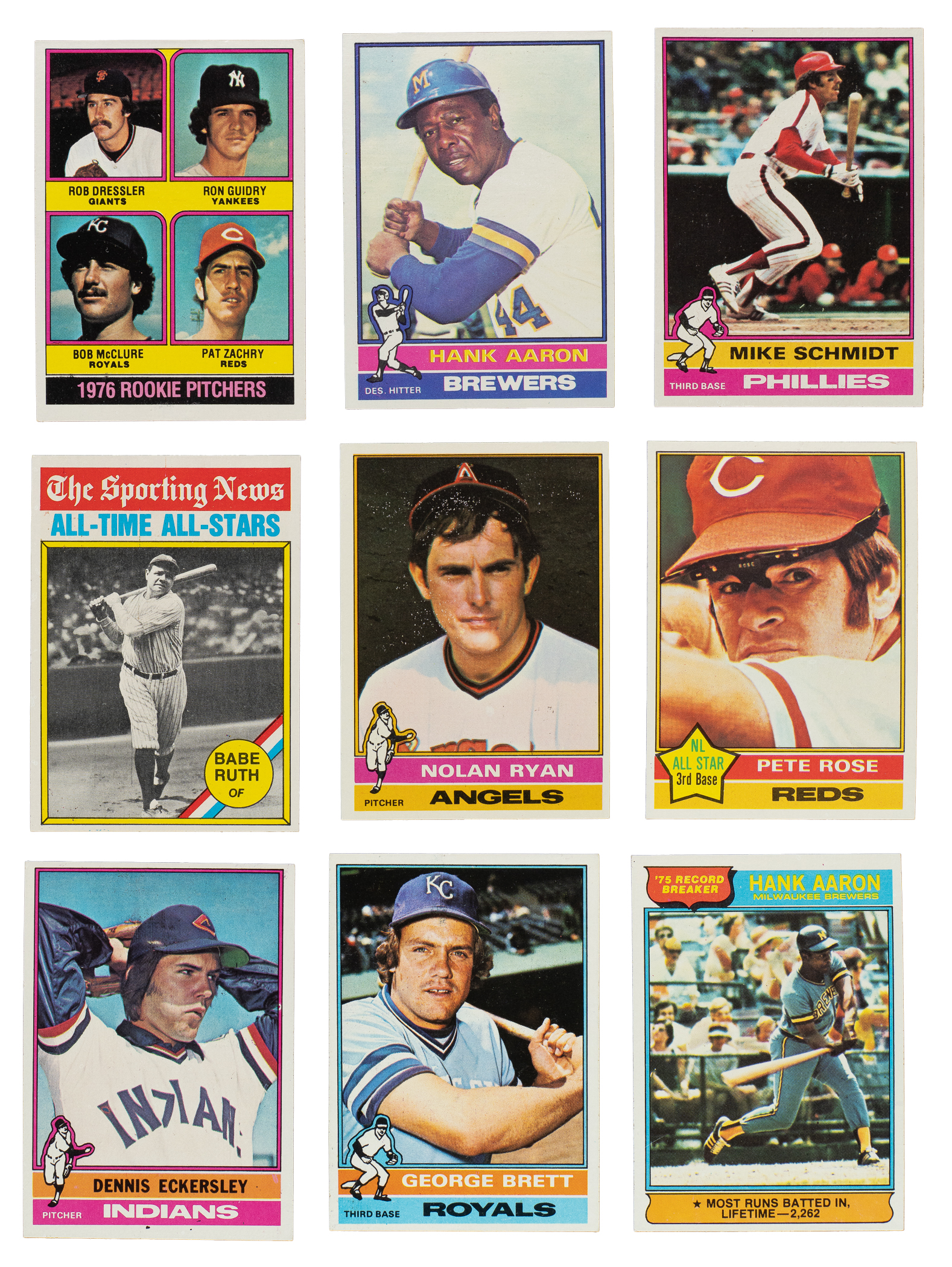 Presented is a very attractive mid- to high-grade 660-card complete set of 1976 Topps Baseball. The set is highlighted by dozens of stars and Hall of Famers, including Nolan Ryan, George Brett, Dennis Eckersley (rookie), and the final card of Hank Aaron. Condition is 36% Nr/Mt to Nr/Mt-Mt (approximately two-thirds Nr/Mt), 54% Ex to Ex-Mt, and 10% Vg to Vg-Ex. Keys: #1 Aaron RB (Ex-Mt), 19 Brett (Ex+), 98 Eckersley RC (Vg-Ex+), 240 Rose (Ex-Mt), 330 Ryan (Ex-Mt), 345 Ruth ATAS (Ex+), 480 Schmidt (Nr/Mt-Mt), 550 Aaron (Nr/Mt), and 599 Guidry RC (Ex). Total: 660 cards. The size/weight of this item requires that there will be an additional shipping charge for this lot.