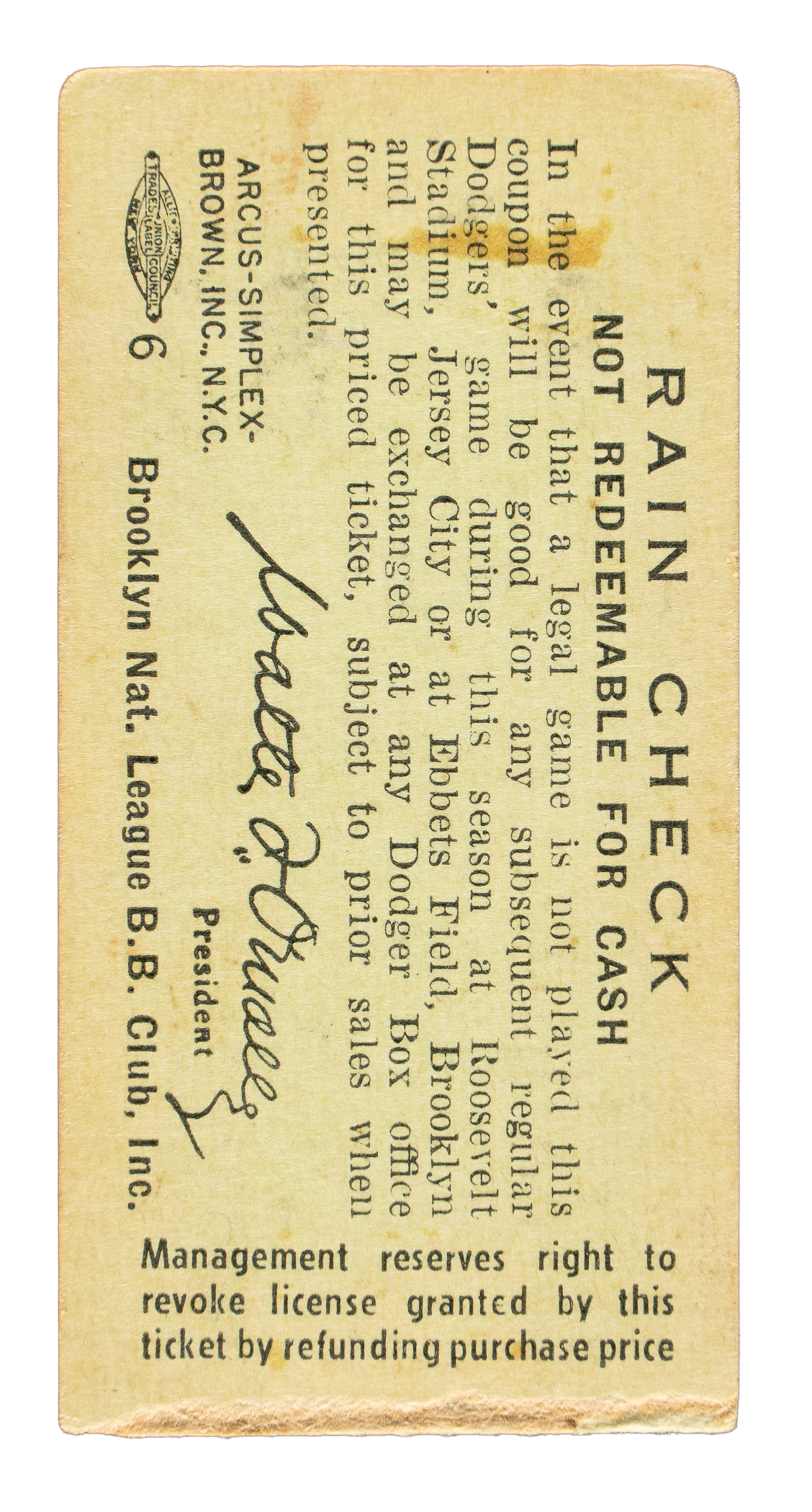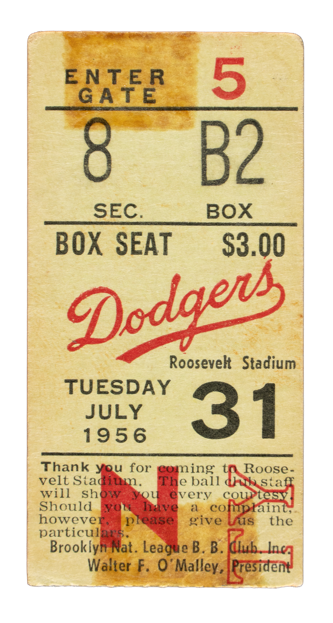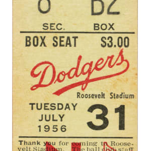 Brooklyn Dodgers ticket stub issued for a game against the Milwaukee Braves on July 31, 1956, played at Roosevelt Stadium in Jersey City, New Jersey. In an attempt to put pressure on the city of Brooklyn to build the Dodgers a new stadium, team owner Walter O'Malley had the Dodgers play 15 home games across the 1956 and 1957 seasons in New Jersey. Jackie Robinson carried the Dodgers to a 3-2 victory, blasting a two-run homer in the 2nd inning and later delivering a walk-off single in the bottom of the 9th. The ticket stub (1.25 x 2.5 inches) displays two patches of tape residue on the front and is in Good condition overall.