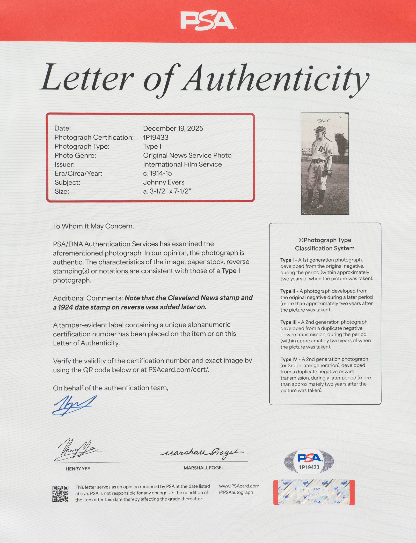 Original International Film Service photo capturing Hall of Famer Johnny Evers as a member of the Boston Braves, circa 1914-1915. Certified as an original Type I photograph by PSA/DNA. Per PSA/DNA, the "Cleveland News stamp and 1924 date stamp on reverse was added later on." The photo, which has been trimmed to its current dimensions of 3.5 x 7.5 inches, displays a pair of editorial notations ("Star" and "Evers") and shading to Evers' image along the front. Good condition overall.