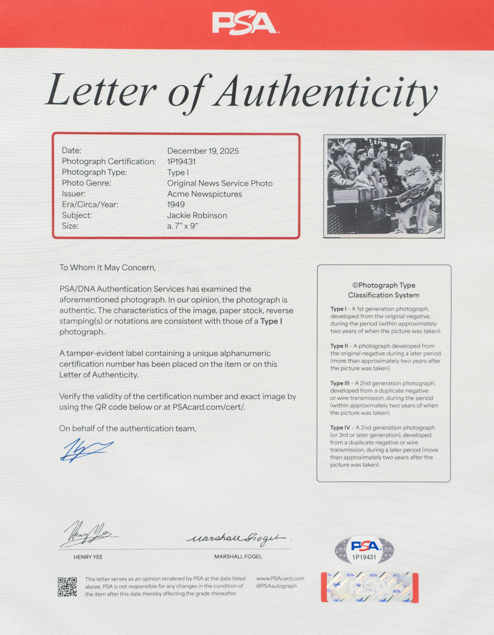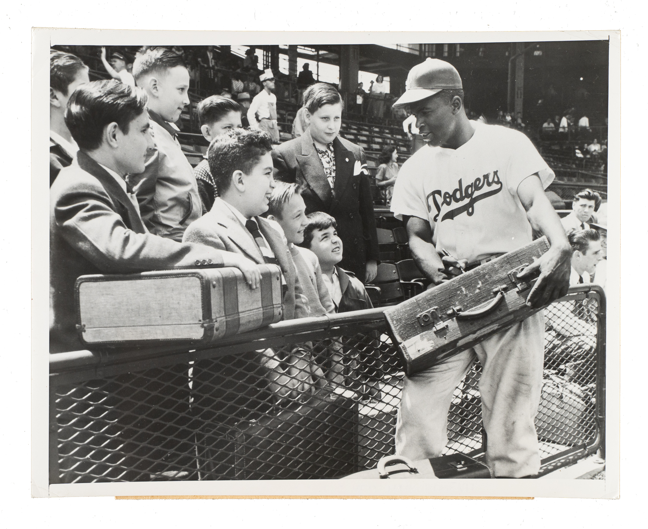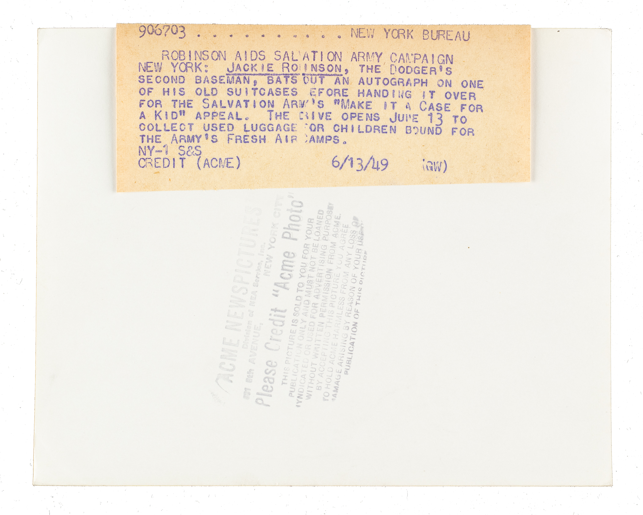 Original news photo of Brooklyn Dodgers Hall of Famer as a member of the Brooklyn Dodgers during the 1949 season. Certified as an original Type I photograph by PSA/DNA. Robinson is pictured mingling with several young fans. The original paper news caption and an "ACME Newspictures" credit stamp appear on the reverse. The photo (7 x 9 inches) is in Very Good to Excellent condition overall.