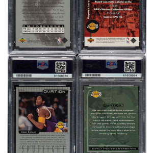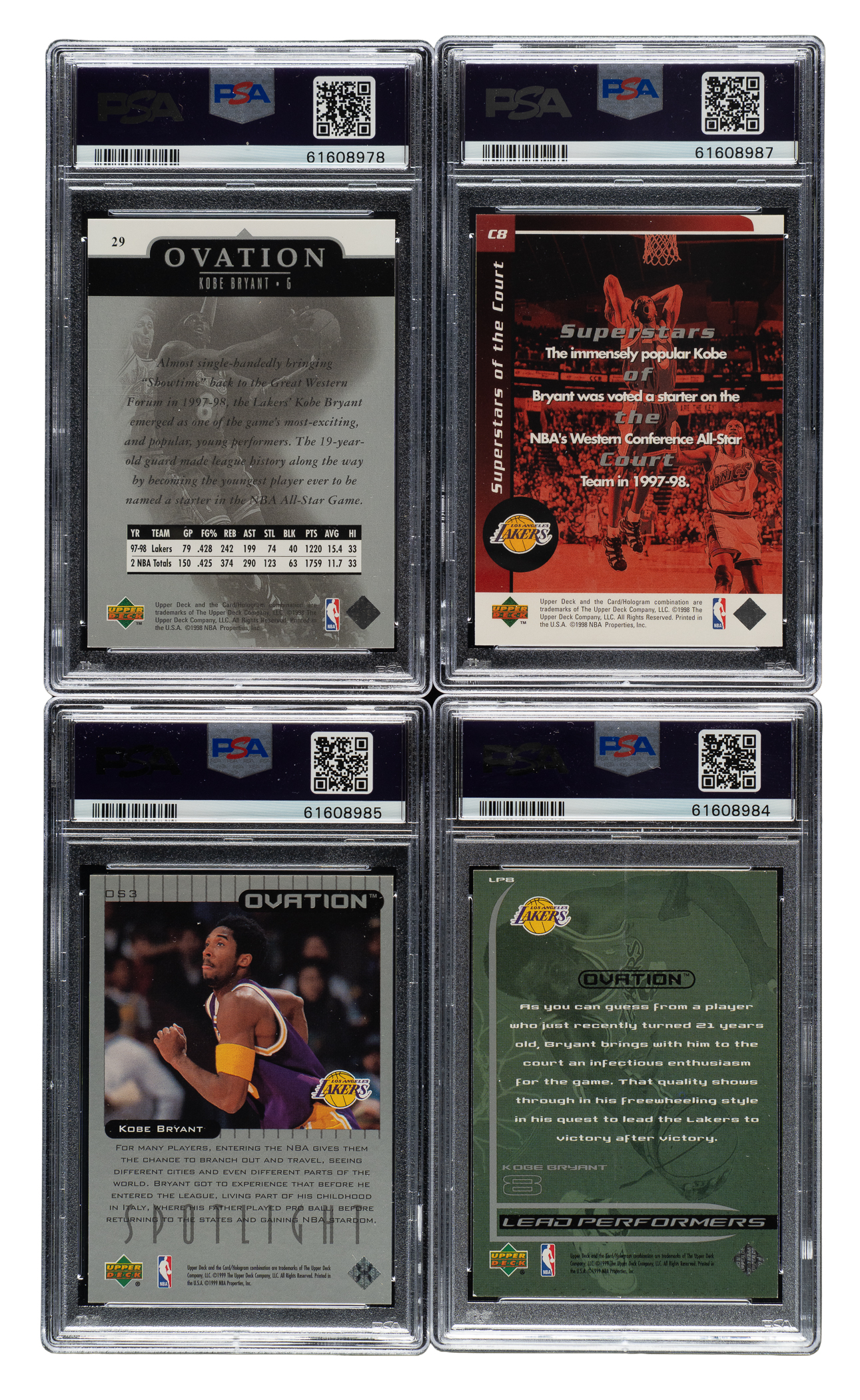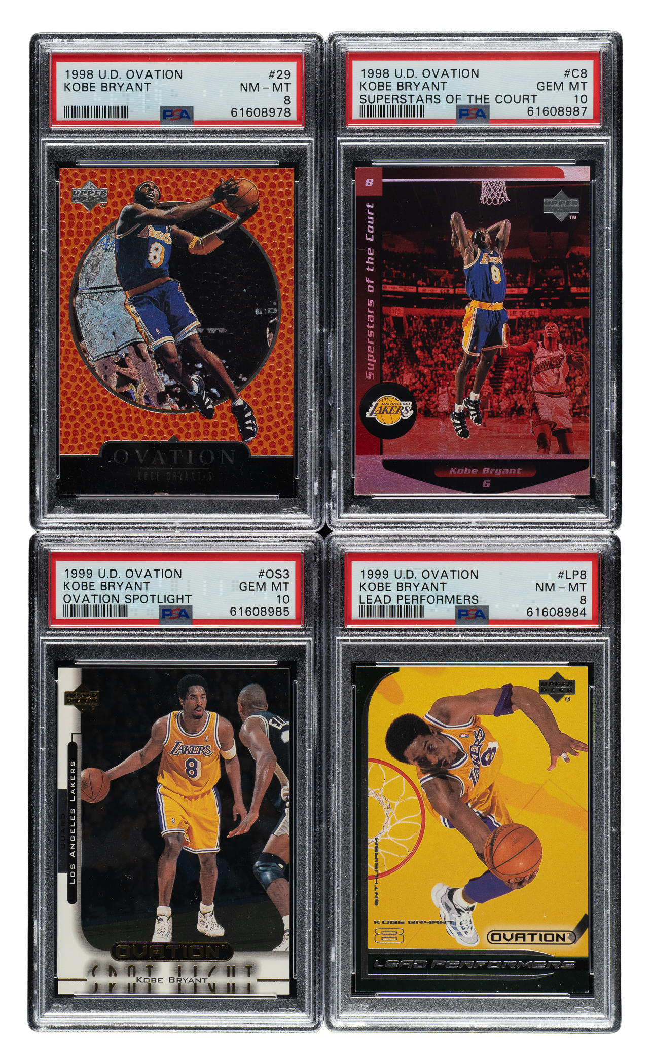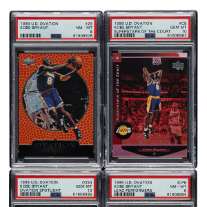 Collection of four 1998-1999 and 1999-2000 Upper Deck Ovation basketball cards, featuring Los Angeles Lakers basketball Hall of Famer Kobe Bryant. Each card has been graded and encapsulated by PSA. This collection consists of the following: 1) 1998-1999 Upper Deck Ovation #29 Kobe Bryant (NM-MT 8). 2) 1998-1999 Upper Deck Ovation Superstars of the Court #C8 Kobe Bryant (GEM MINT 10). 3) 1999-2000 Upper Deck Ovation Spotlight #OS3 Kobe Bryant (GEM MINT 10). 4) 1999-2000 Upper Deck Ovation Lead Performers #LP8 Kobe Bryant (NM-MT 8). Total: 4 cards.