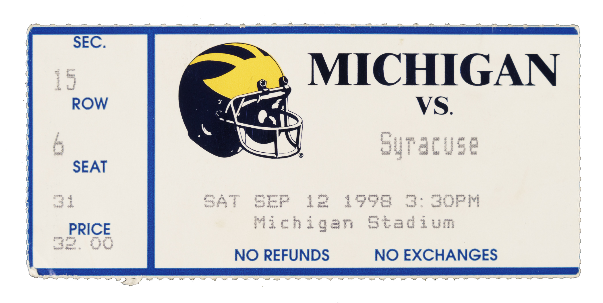 Michigan Wolverines ticket stub (4-3/8 x 2 inches) from a September 12, 1998 game against the Syracuse Orange where Tom Brady threw his first collegiate touchdown pass. Despite Brady's efforts, the Wolverines fell to the Orange 38-28. The Orange were led by fellow future NFL quarterback Donovan McNabb, who threw for 233 yards and 3 touchdowns. The ticket displays scattered light creasing and a few faint spots of discoloration on the reverse; Very Good condition overall.