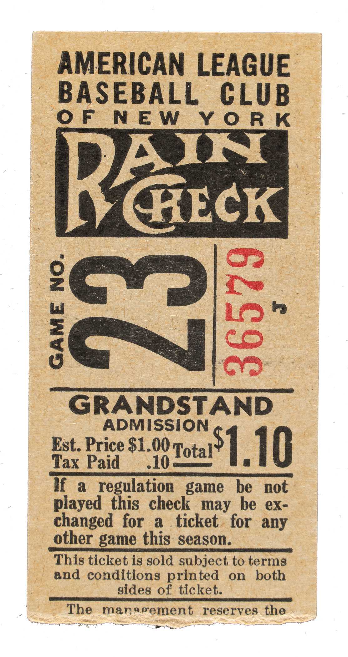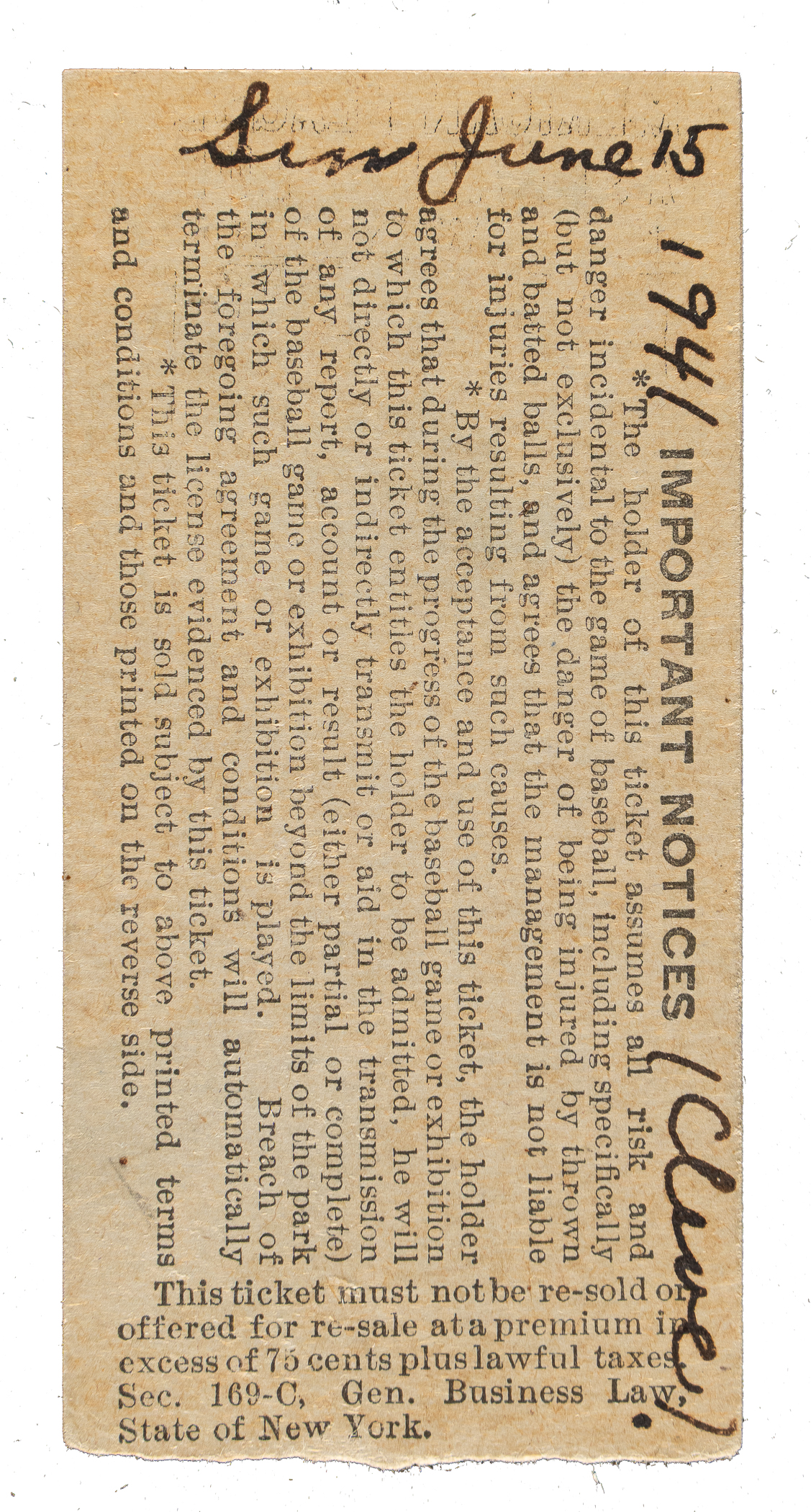 New York regular-season ticket stub issued for a game against the Cleveland Indians on June 15, 1941. Joe DiMaggio recorded a hit, extending his streak to 28 consecutive games on the way to his record-breaking 56-game hit streak. The ticket stub (1-3/8 x 2-3/4 inches) displays black ink notations on the reverse and is otherwise in Very Good to Excellent condition overall.