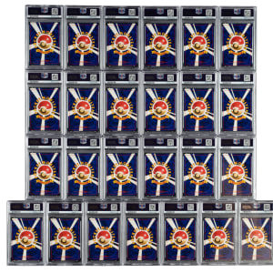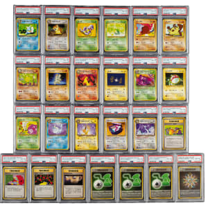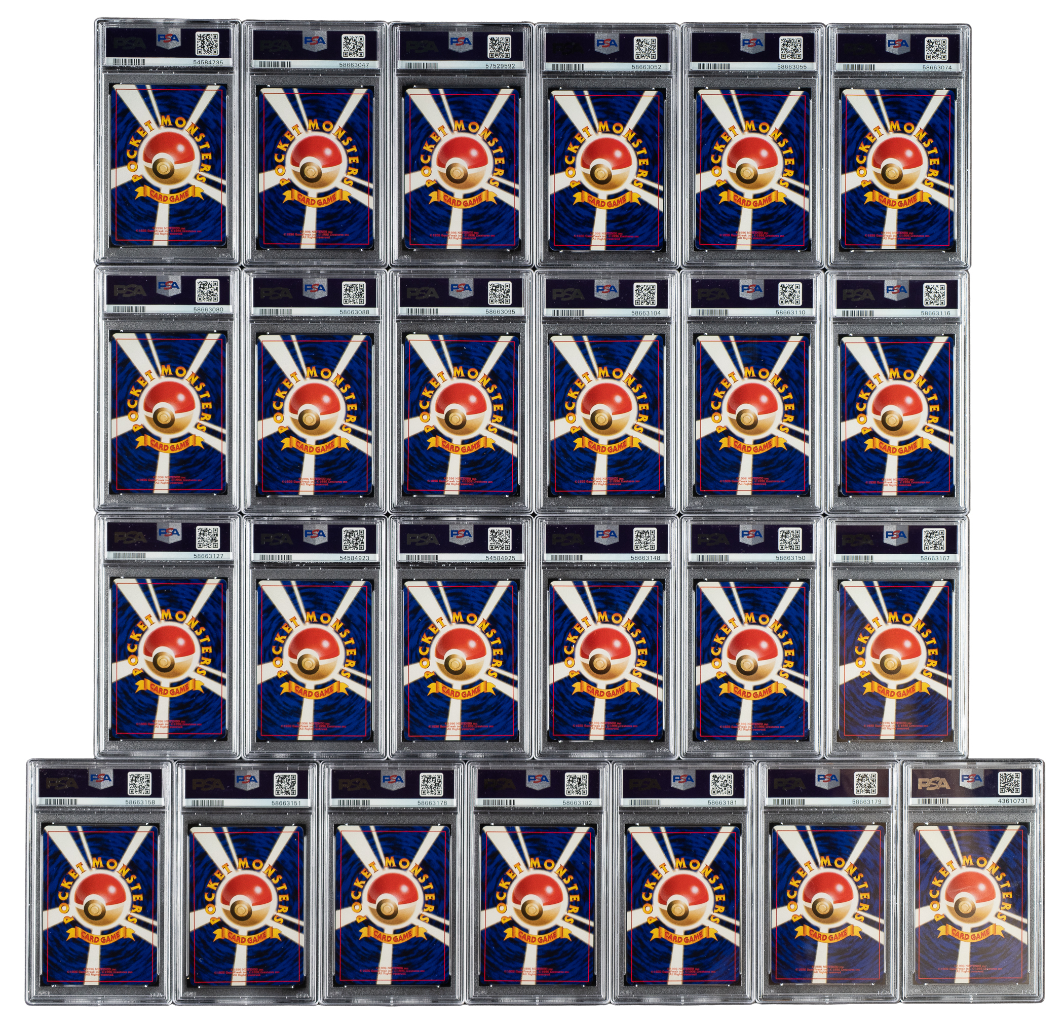 Collection of twenty five 1997 Pokemon Japanese Rocket cards, each graded and encapsulated NM-MT 8 by PSA. This collection consists of the following: #8, 20, 23, 43, 50, 56, 57, 66, 78, 81, 89, 100, 109, 134, 135, 137, 148, Challenge!, Goop Gas Attack, Sleep!, The Boss's Way, three Potion Energy, Rainbow Energy Holographic. Total 25 cards.