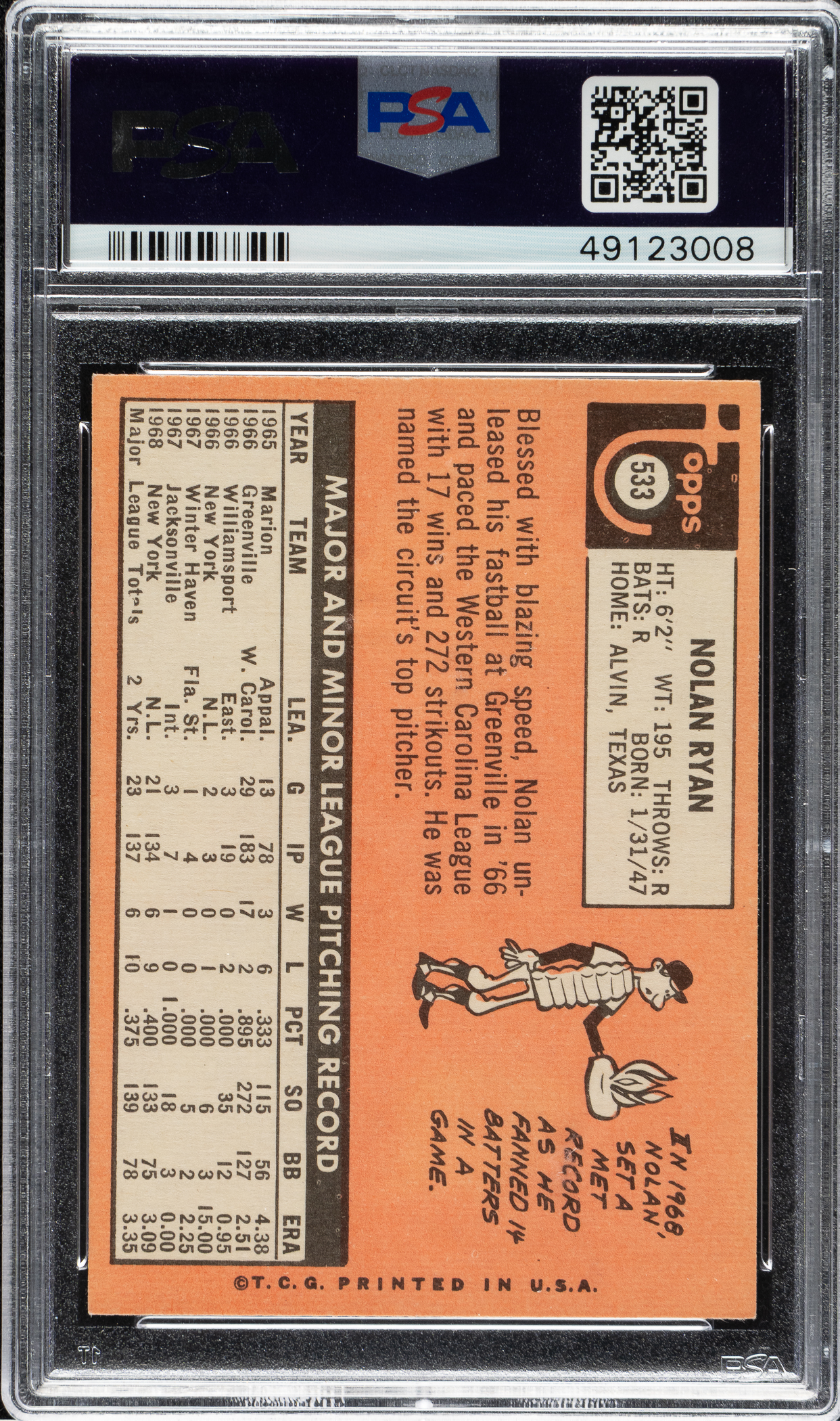 Graded MINT 9 by PSA. Superb example of Nolan Ryan from the classic 1969 Topps set featuring the New York Mets Hall of Famer in his second year in the Major Leagues. Only three examples grade higher out of 10,407 cards evaluated by PSA. This well-centered example boasts bold colors, outstanding clarity, and sharp corners. Clean reverse. A tremendous example.