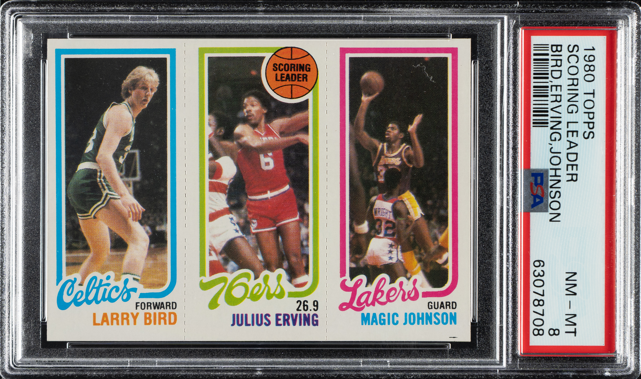 Graded NM-MT 8 by PSA. Hall of Famers Larry Bird (Boston Celtics), Julius Erving (Philadelphia 76ers), and Magic Johnson (Los Angeles Lakers).