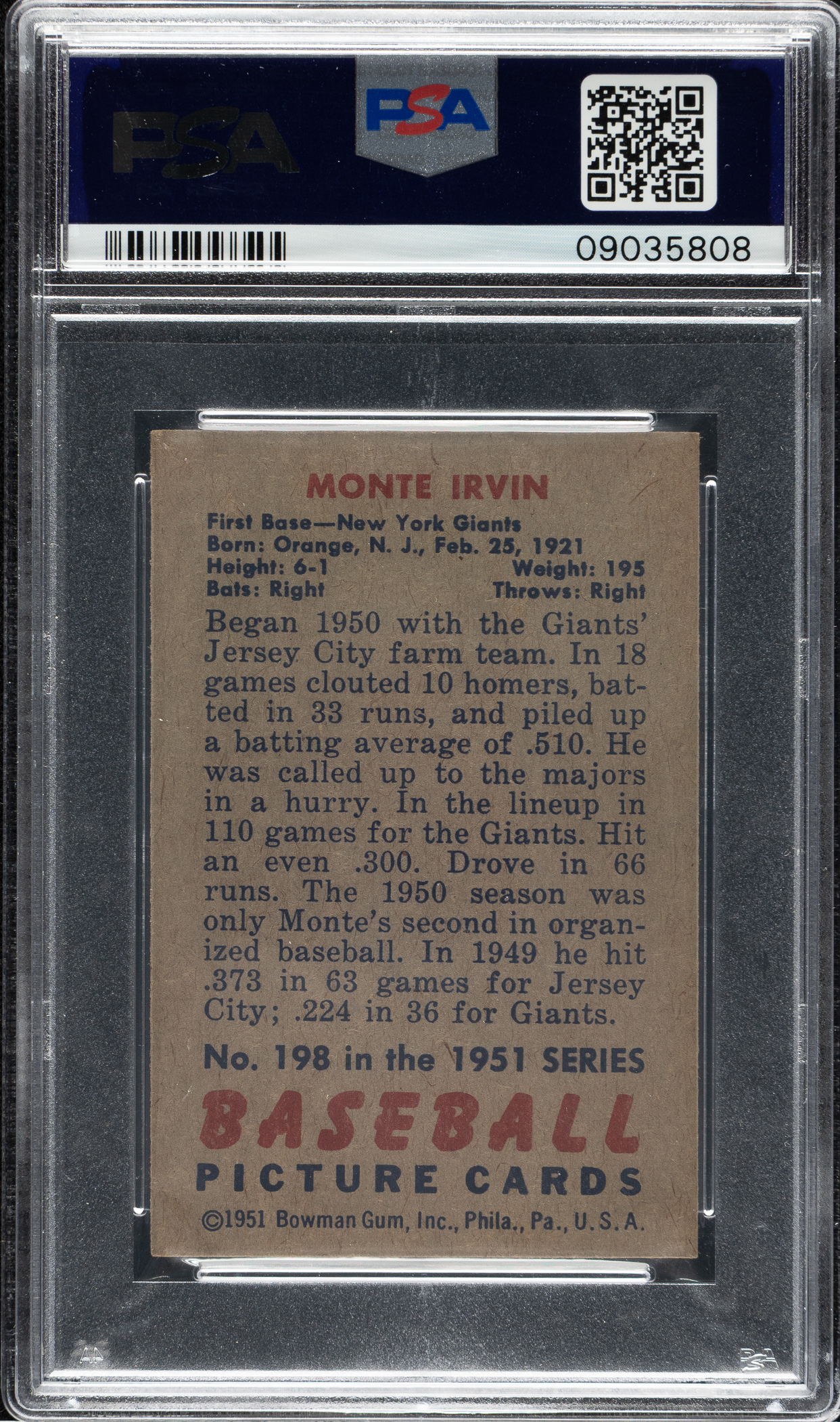 Graded NM 7 by PSA. New York Giants Hall of Famer Monte Irvin.