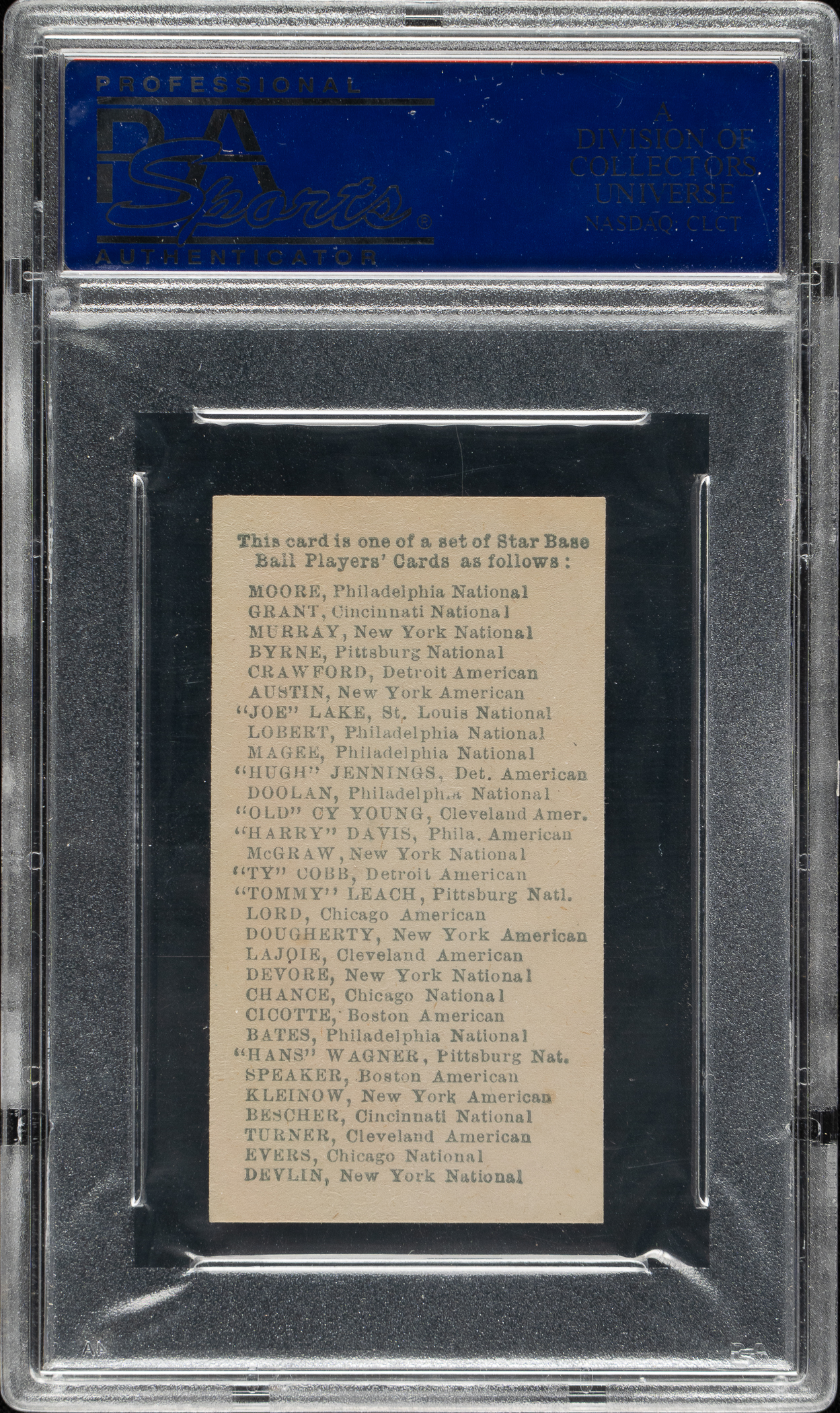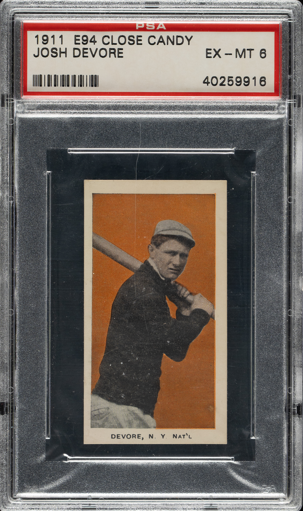 Graded EX-MT 6 by PSA. New York Giants. One of only two examples graded at this level with none higher! Although cards from this set are found with seven different background colors, collectors have come to appreciate orange backgrounds not only for their aesthetics but for their rarity (they are thought by many to be the scarcest). While an exact count of orange background E94s known to exist may never be complete, advanced collectors of the set have documented only 15 total cards with this background color. This is a remarkable high-grade example of this profound rarity!