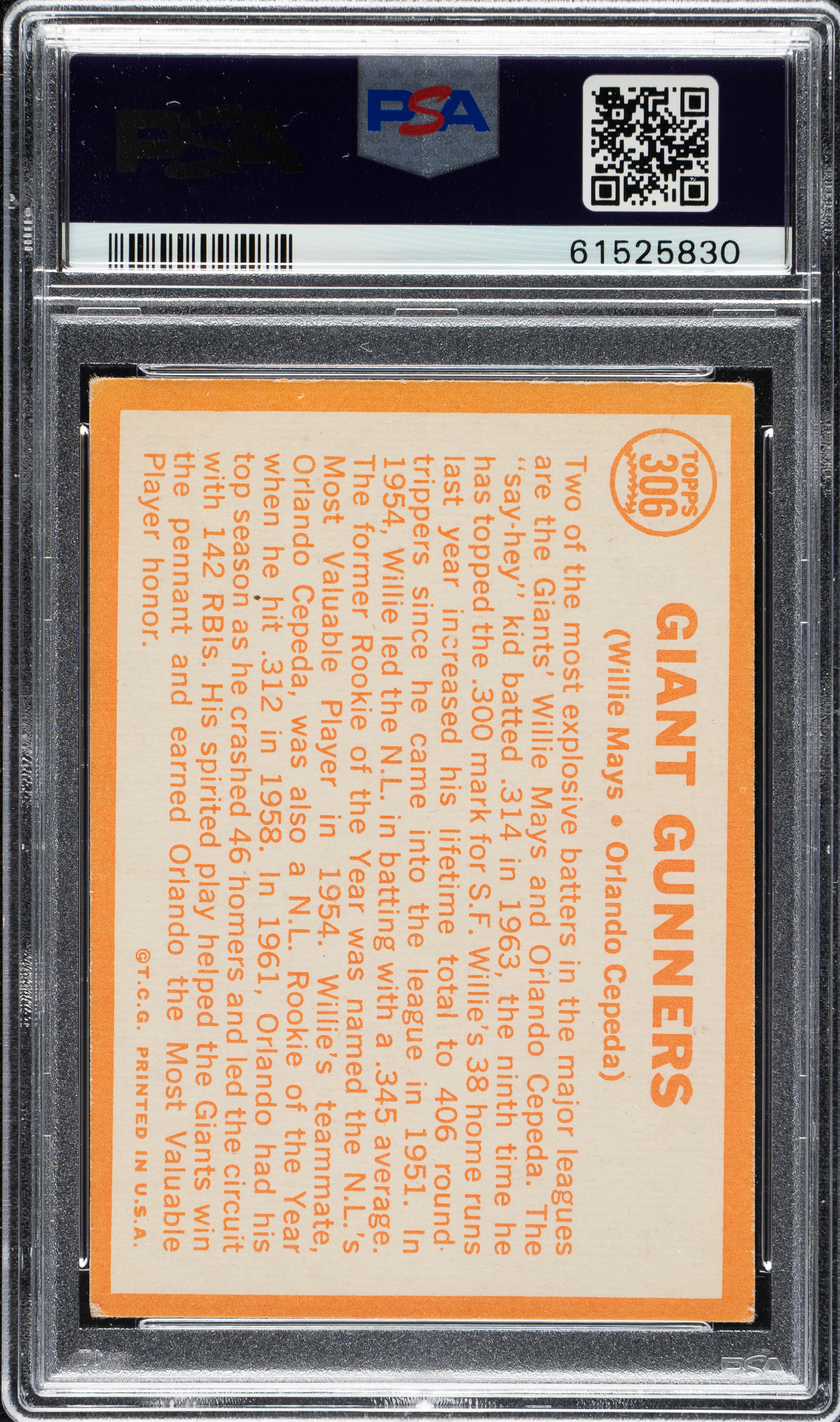 Graded VG-EX 4 by PSA. San Francisco Giants Hall of Famers Willie Mays and Orlando Cepeda.