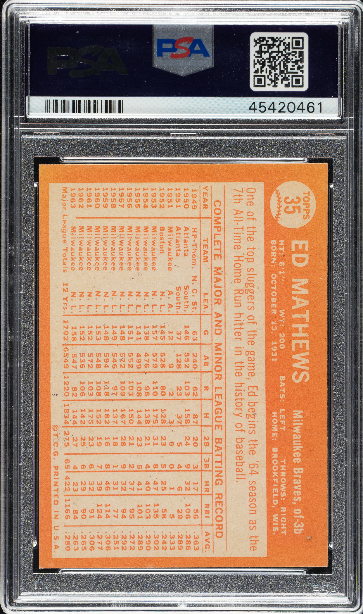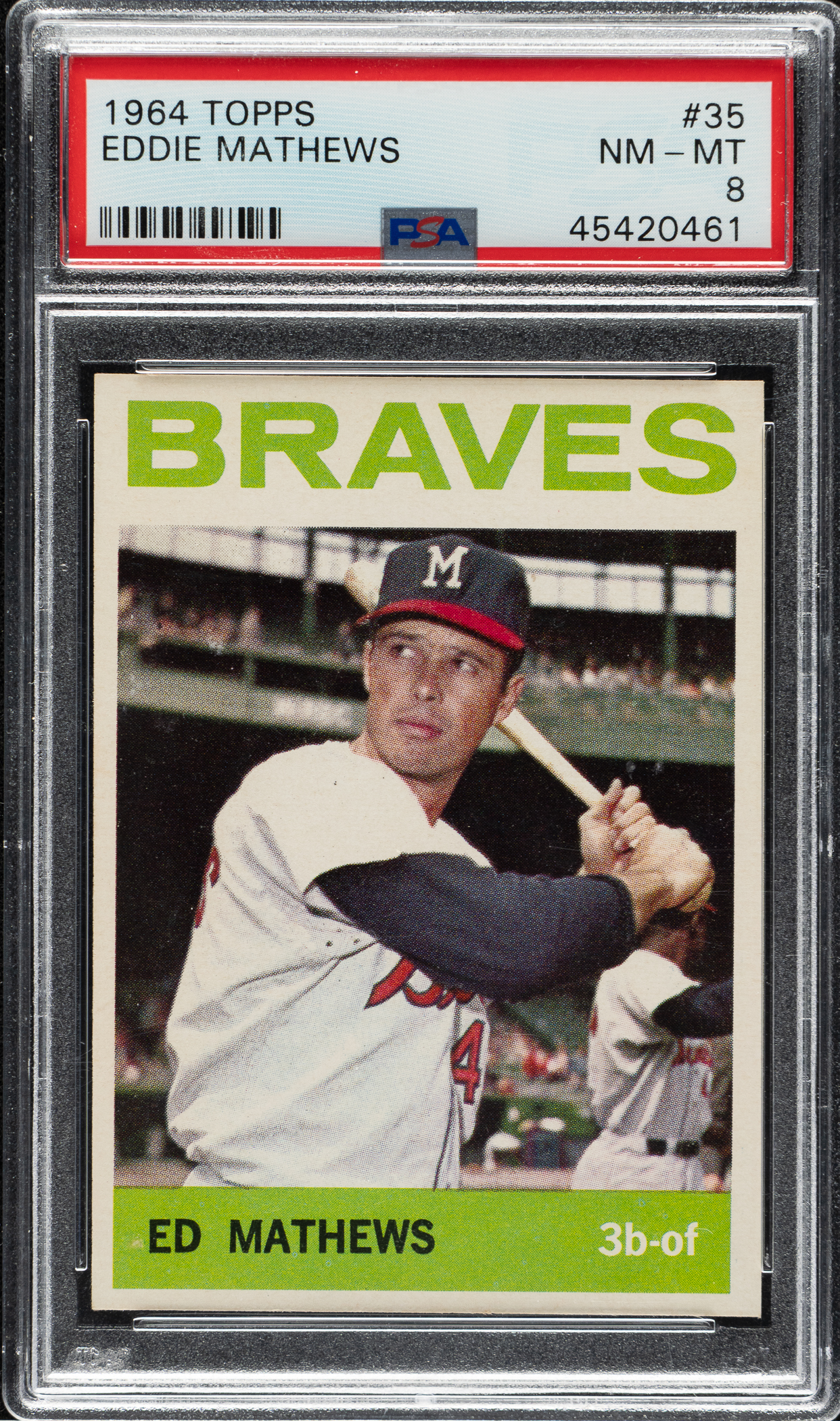 Graded NM-MT 8 by PSA. Milwaukee Braves Hall of Famer Eddie Mathews.