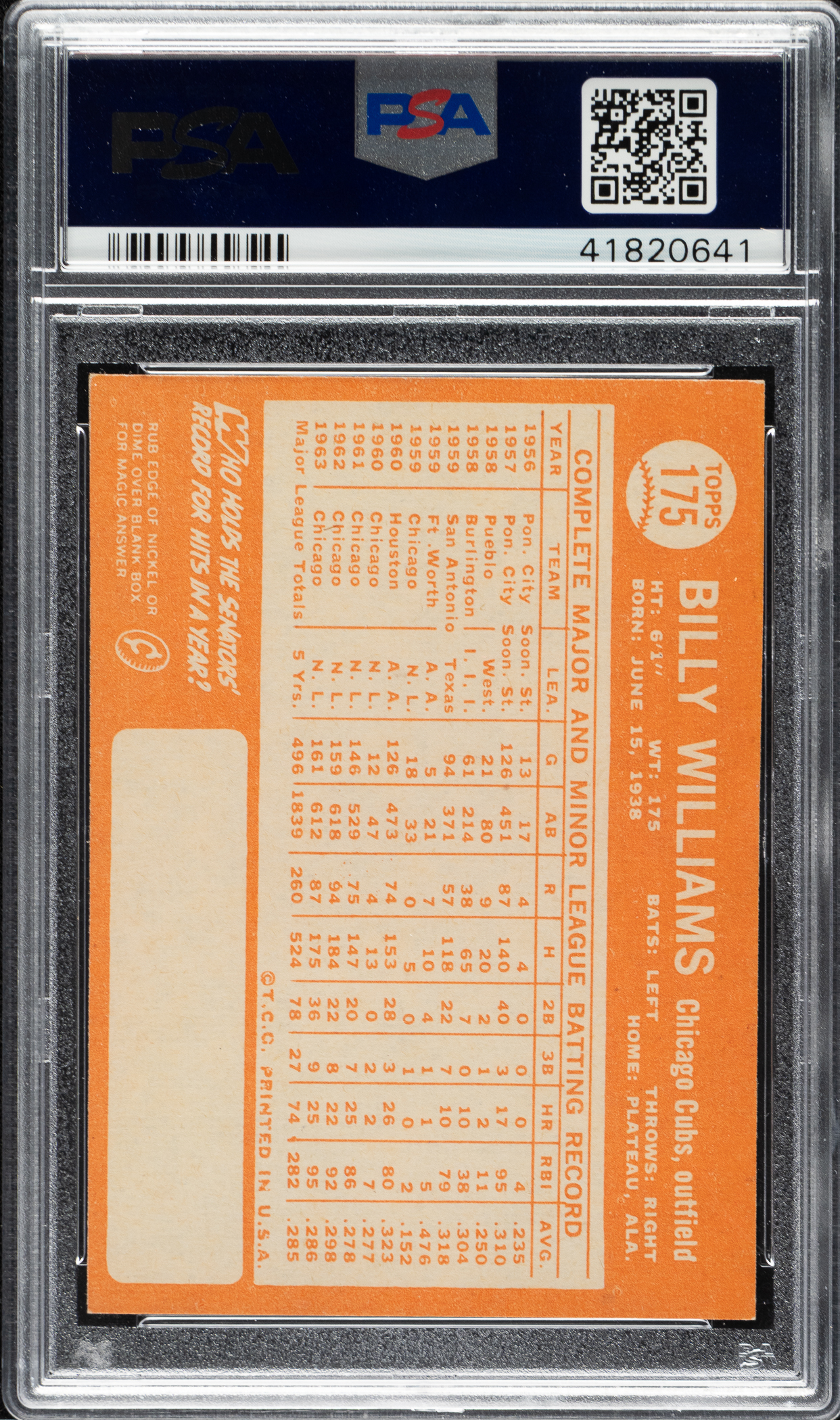 Graded NM-MT 8 by PSA. Chicago Cubs Hall of Famer Billy Williams.