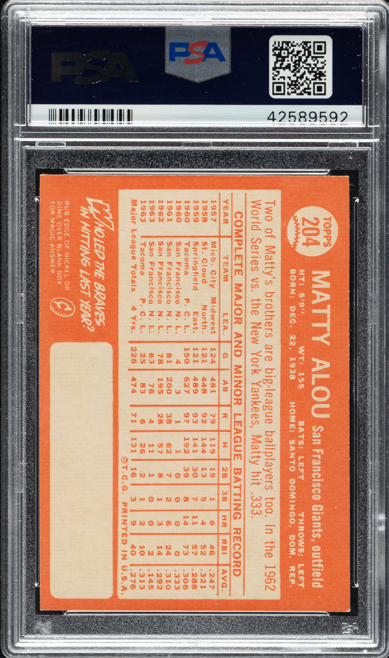 Lot # 1964: 1964 Topps #204 Matty Alou PSA NM-MT 8