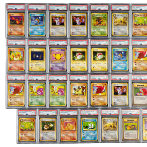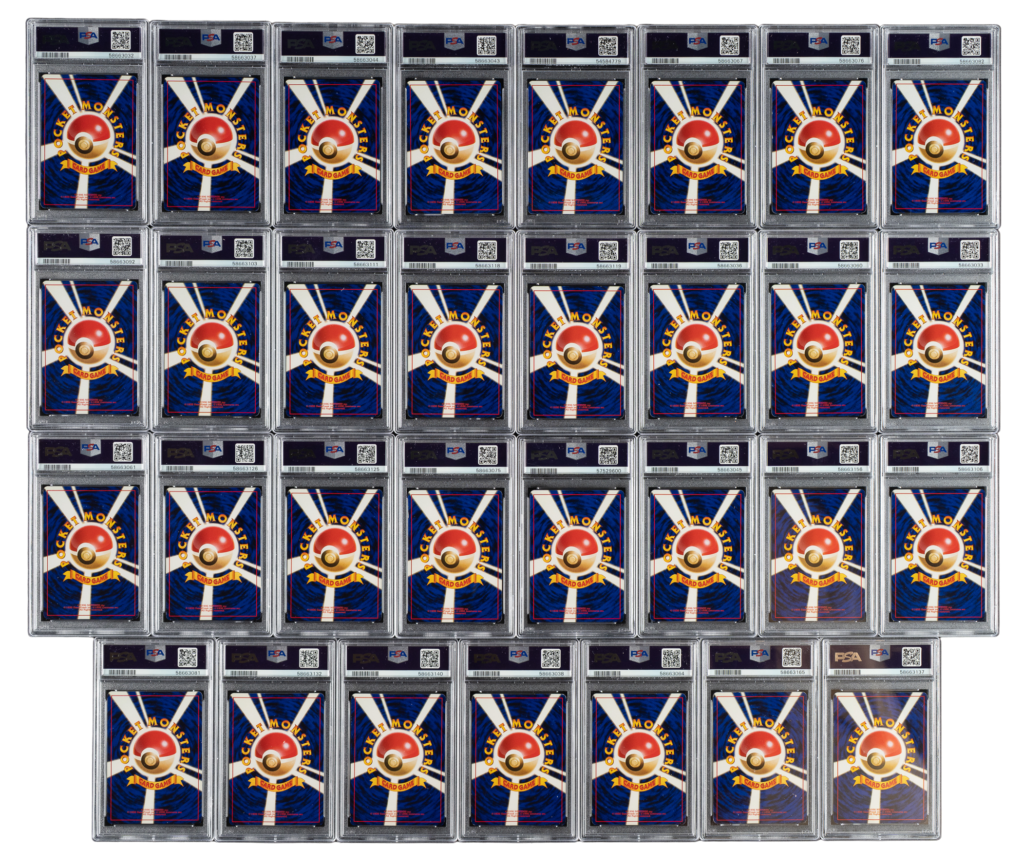 Collection of thirty-one 1997 Pokemon Japanese Rocket cards, each professionally graded and encapsulated by PSA. PSA Grading Composite: NM 7 (13 cards): #4, 7, two 19, 44, 53, two 57, 77, 81, 96, and two 100. EX-MT 6 (6 cards): 7, two 50, 56, and two 109. EX 5 (4 cards): #5, 50, 88, and Goop Gas Attack. VG-EX 4 (4 cards): #19, 57, 133, and 136. VG 3 (3 cards): #8, 53, and 135. GOOD 2 (1 cards); Challenge!. Total 31 cards.