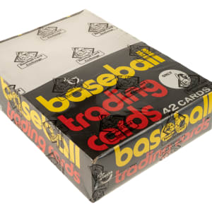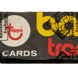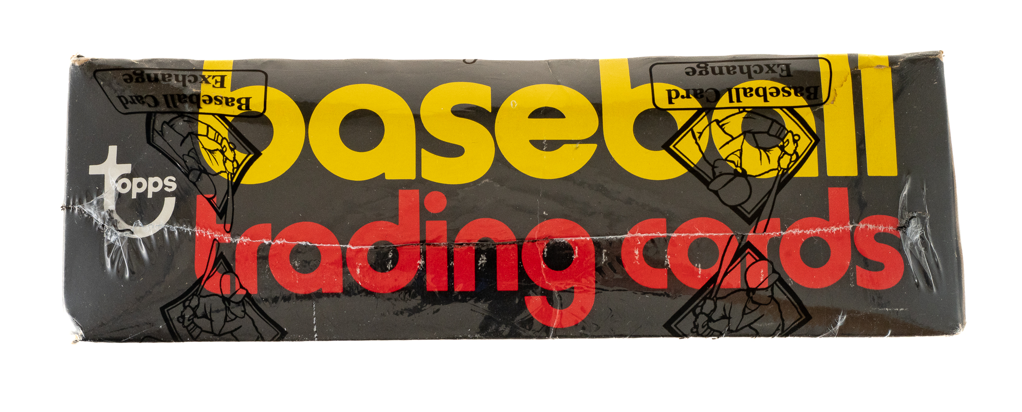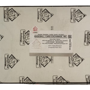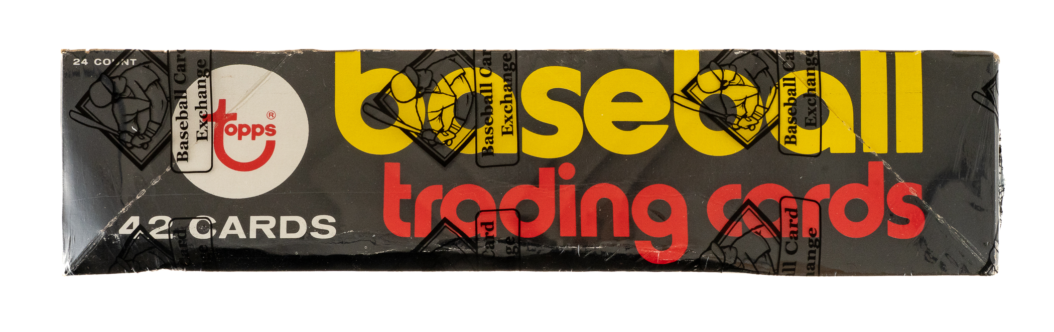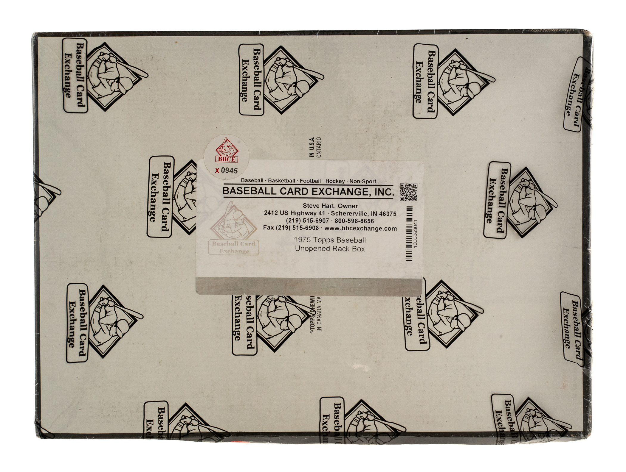 Presented is an extremely rare 1975 Topps baseball complete, original unopened rack pack box, one of the most elusive treasures of all 1970s Topps unopened-pack collecting. This is the first example we have ever offered! The box houses 24 packs with each pack containing 42 cards, for a total of 1,008 cards. The 1975 Topps set includes the rookie cards of Hall of Famers George Brett, Robin Yount, Gary Carter, and Jim Rice, and many other stars, including Schmidt, Aaron, Ryan, Winfield, and Jackson. The colored flush-to-the-border design of the 1975 Topps set makes this issue particularly challenging to collect in extremely high grade. The store display box is bright and bold with light shelf wear, including a bit of creasing on the side panels. The box comes shrink-wrapped by Baseball Card Exchange (owned by Steve Hart, the foremost expert on unopened material). This is an incredible and extremely rare unopened rack box from this very popular set.