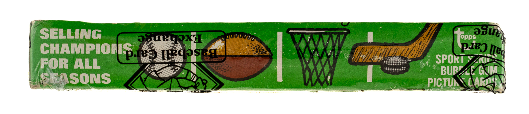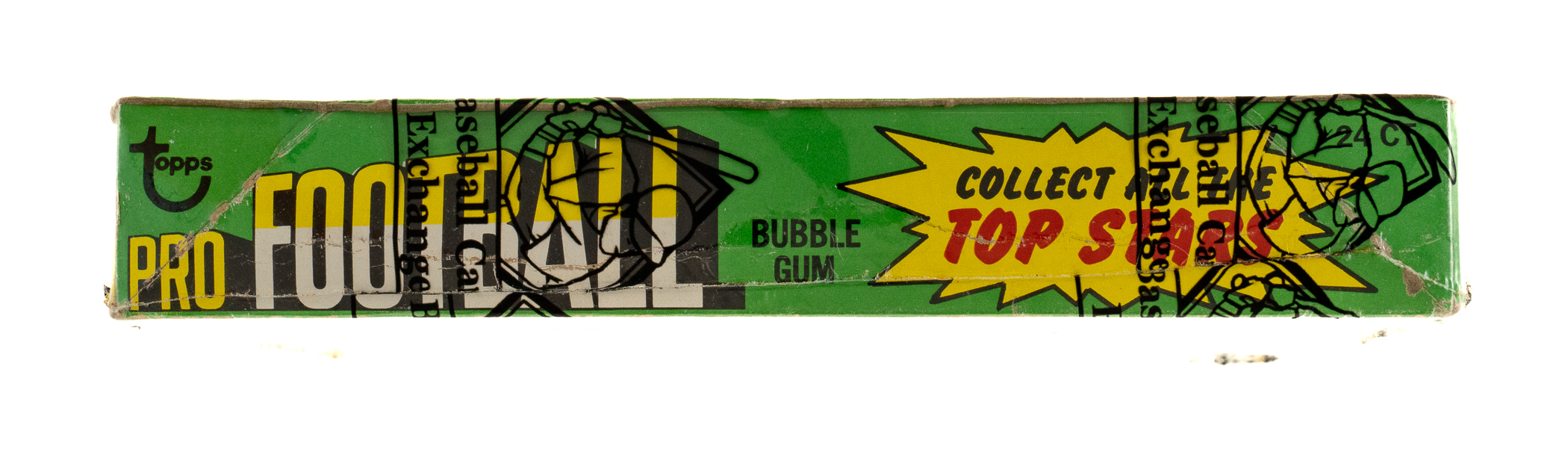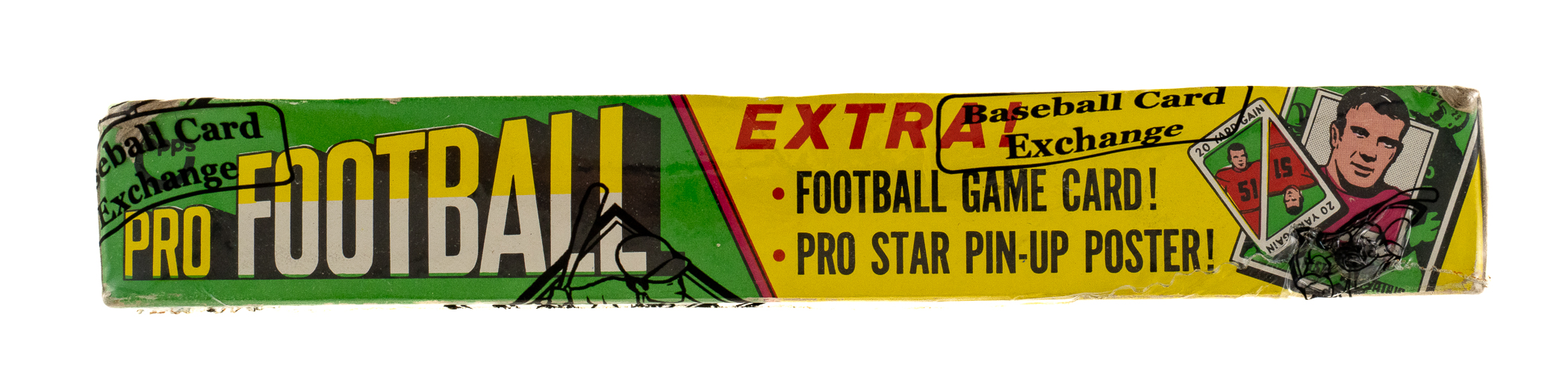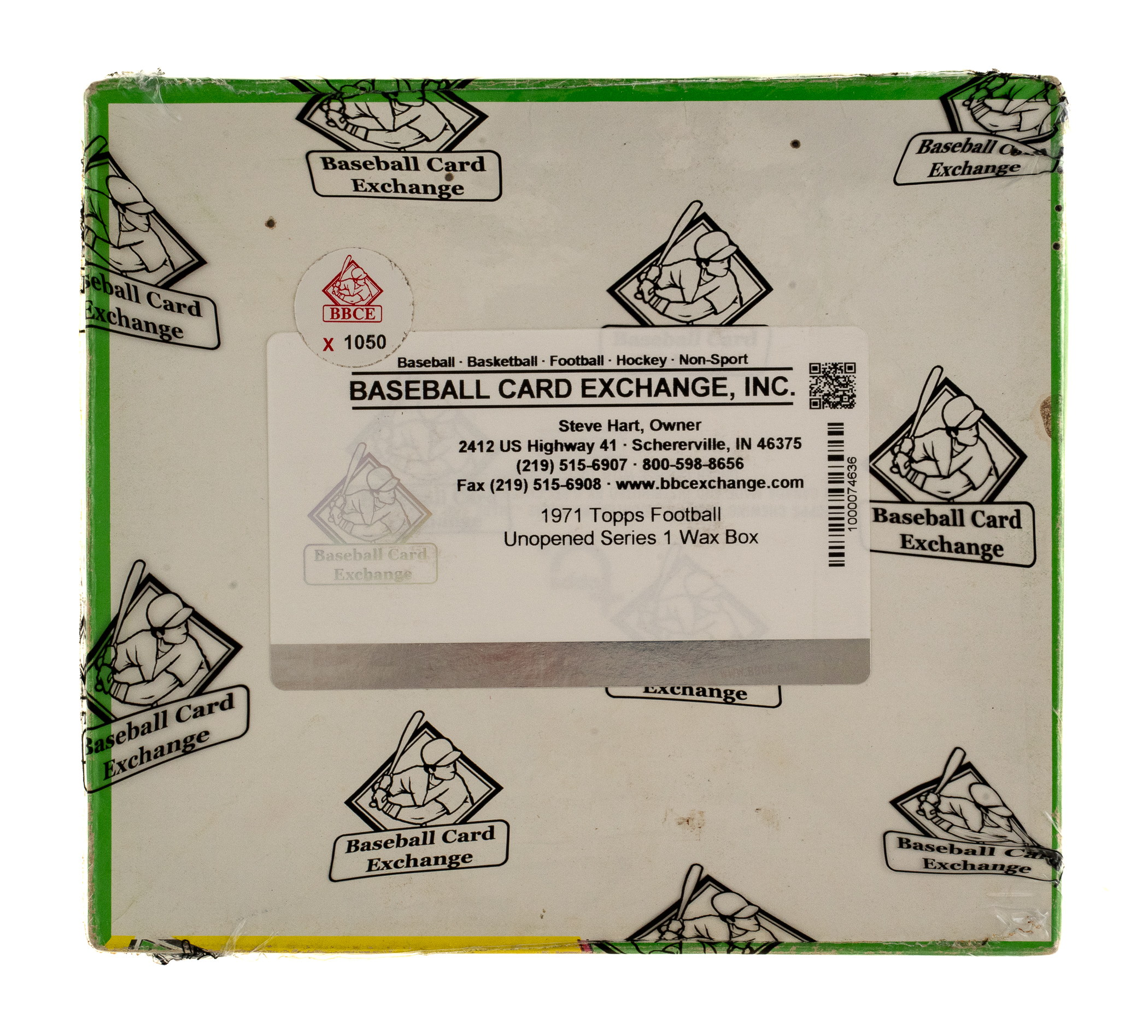 Presented is an extremely rare, complete, original unopened wax box of 1971 Topps football. The box houses 24 packs with each pack containing 10 cards for a total of 240 cards. This is a first-series box (#1-132), a series that includes Johnny Unitas, Dick Butkus, Willie Lanier (rookie), Mel Renfro, Lance Alworth as well as numerous other stars and Hall of Famers. This is the first unopened wax box from this series that we have offered in the past 22 years! This is a particularly significant year for an unopened wax box, as cards from 1971 Topps football are naturally very difficult to find in high grade due to their easily damaged color-border design. The box comes shrink-wrapped by Baseball Card Exchange (owned by Steve Hart, the foremost expert on unopened material). The display box has survived in outstanding condition with bright colors and minor shelf wear visible, including the perforated portion of the lid pushed in a bit. This is a stunning, complete, unopened wax box.