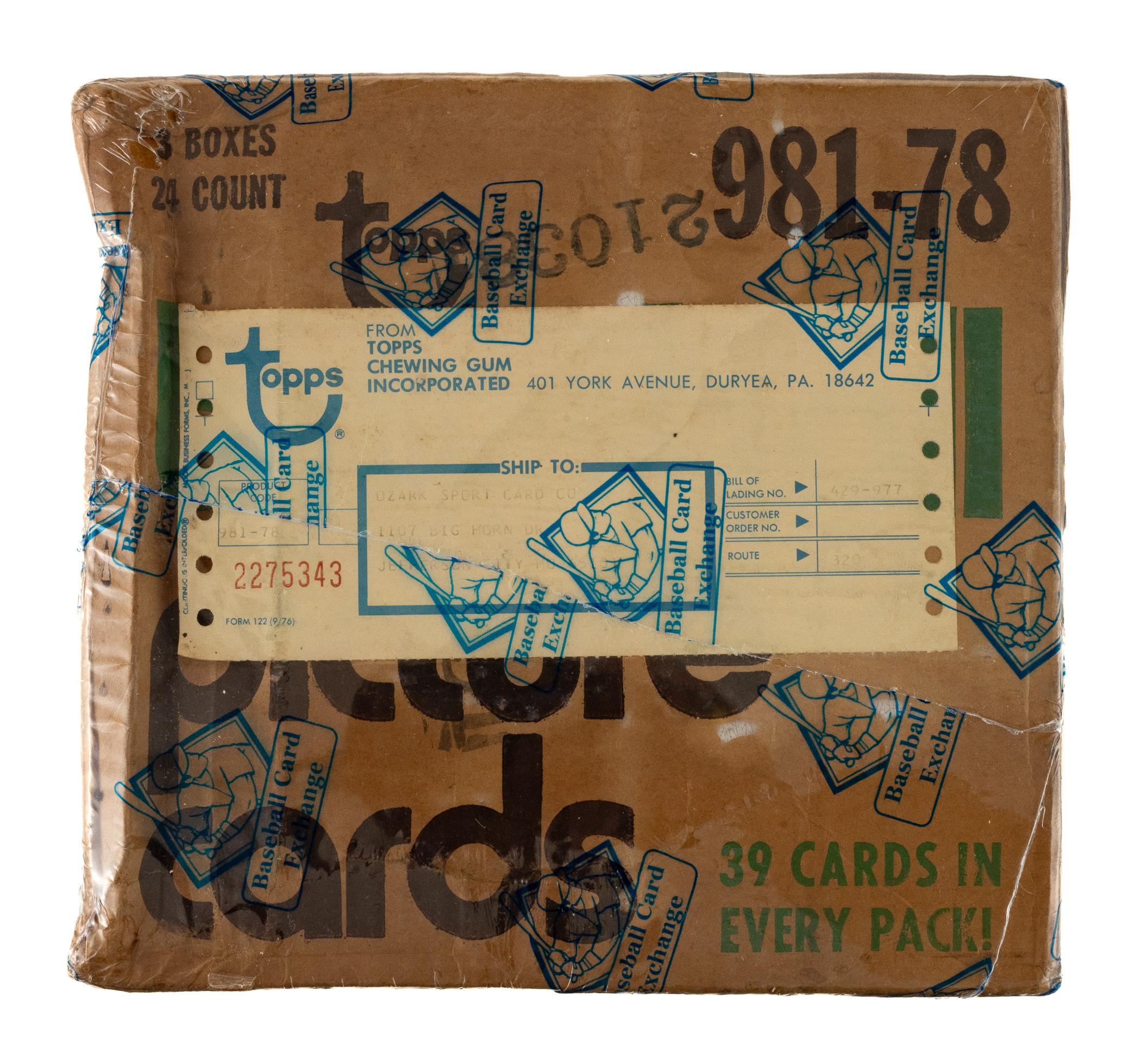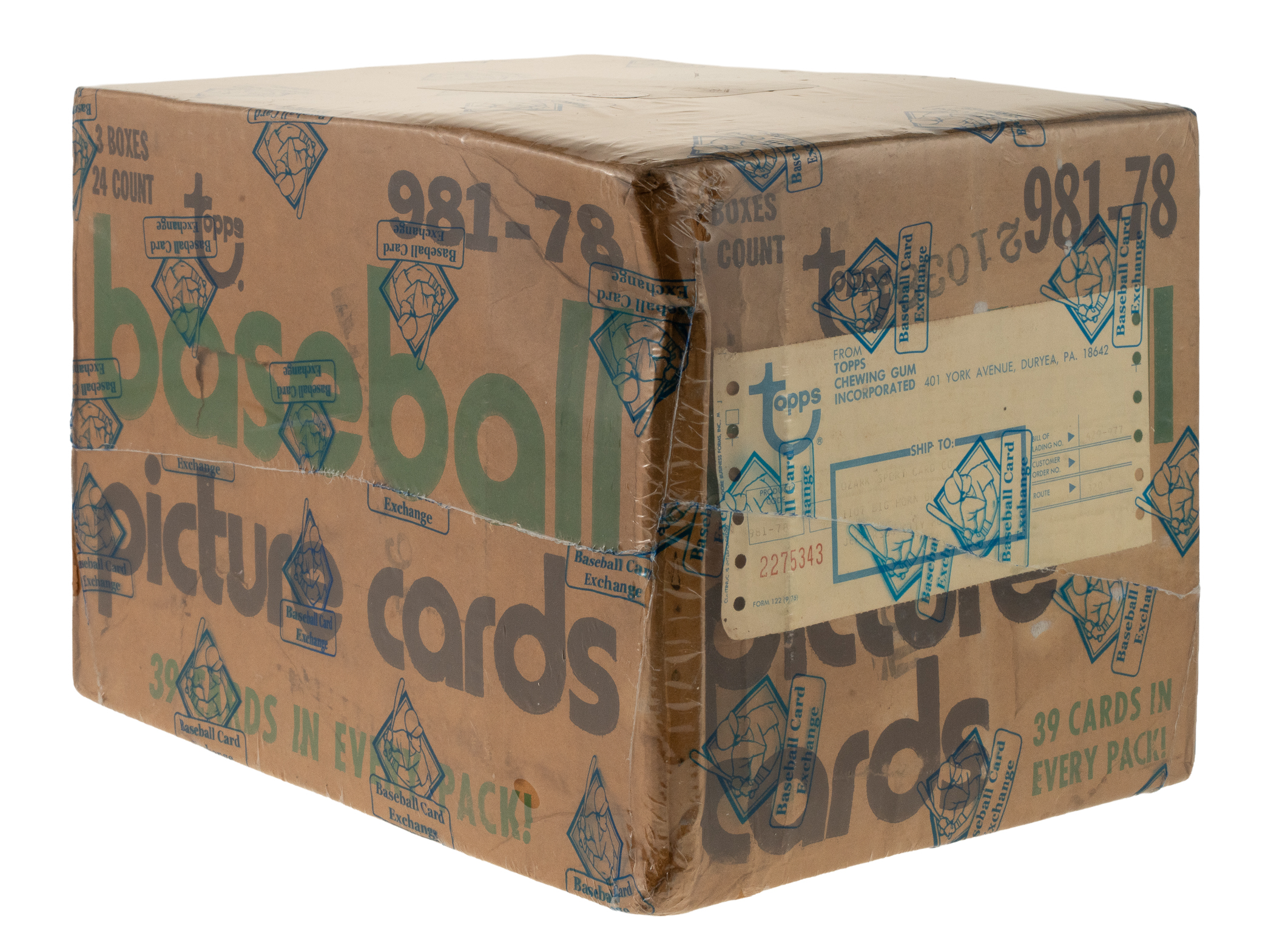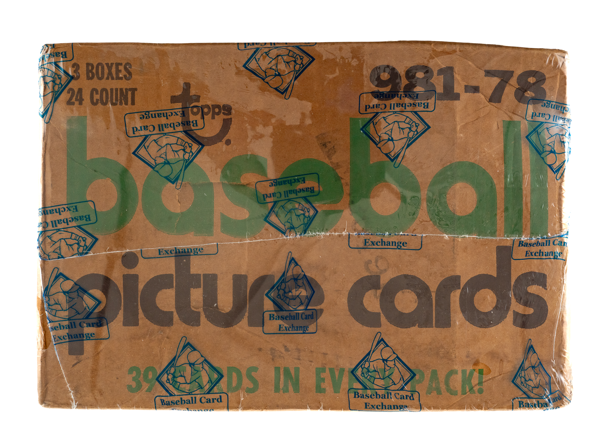 Complete, original rack box case of 1978 Topps baseball, which contains three unopened boxes with 24 packs per box, for a total of 72 packs. With each pack containing 39 cards, the case represents a total of 2,808 cards. This case comes shrink-wrapped by Baseball Card Exchange (owned by Steve Hart, the foremost expert on unopened material). Each box inside comes individually shrink-wrapped by BBCE and is noted to have originated from a sealed case (FASC designation on label). The "factory sealed" distinction is particularly important and makes the offered case even more impressive. The 1978 Topps set includes rookie cards of Eddie Murray, Paul Molitor, and Alan Trammell, and key cards of George Brett and Nolan Ryan. The original outer case displays moderate wear. A tremendous opportunity to acquire this extraordinary and rarely seen rack case from the popular 1978 Topps baseball issue. The size/weight of this item requires that there will be an additional shipping charge for this lot.