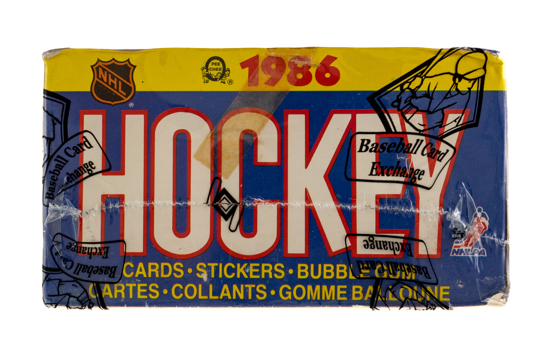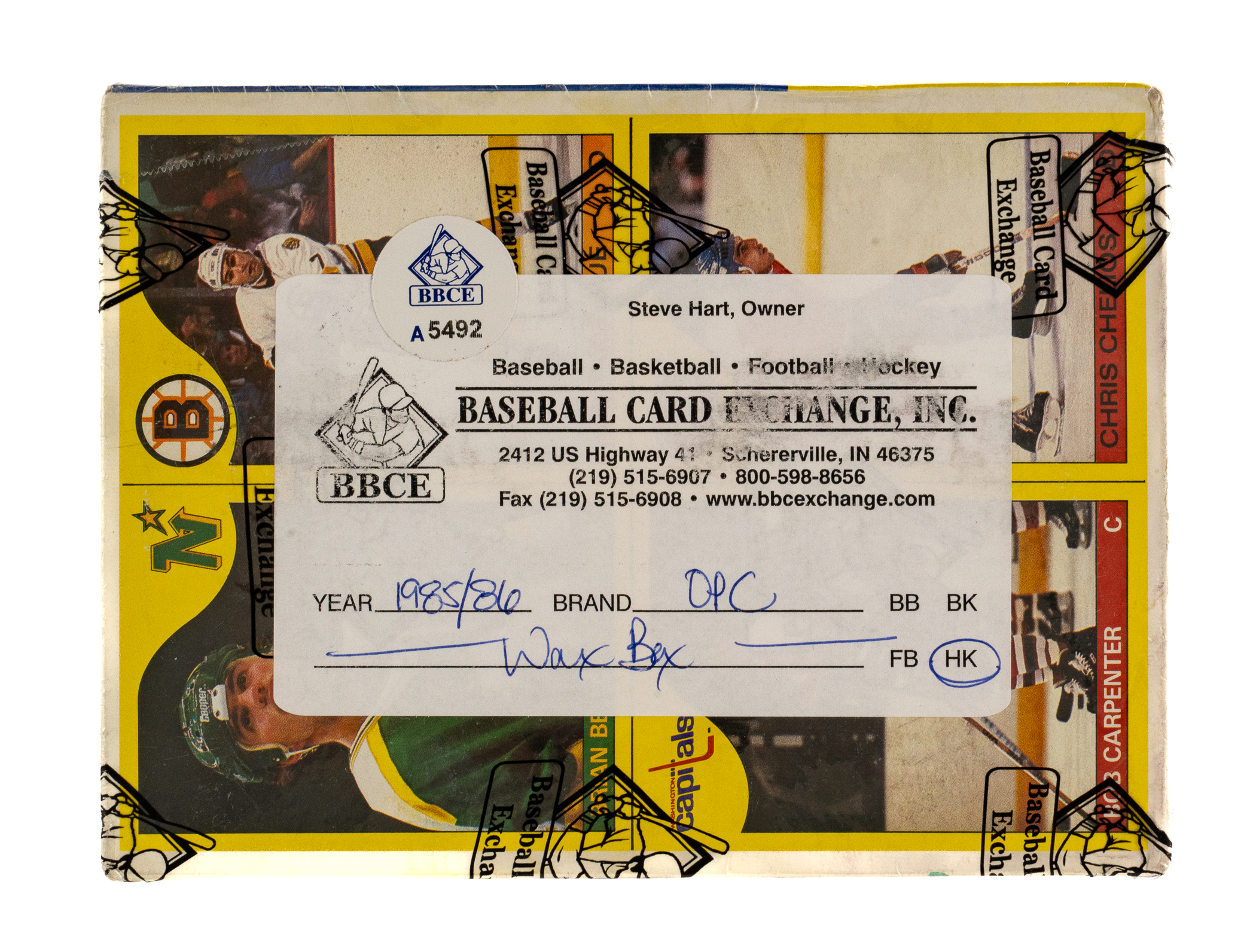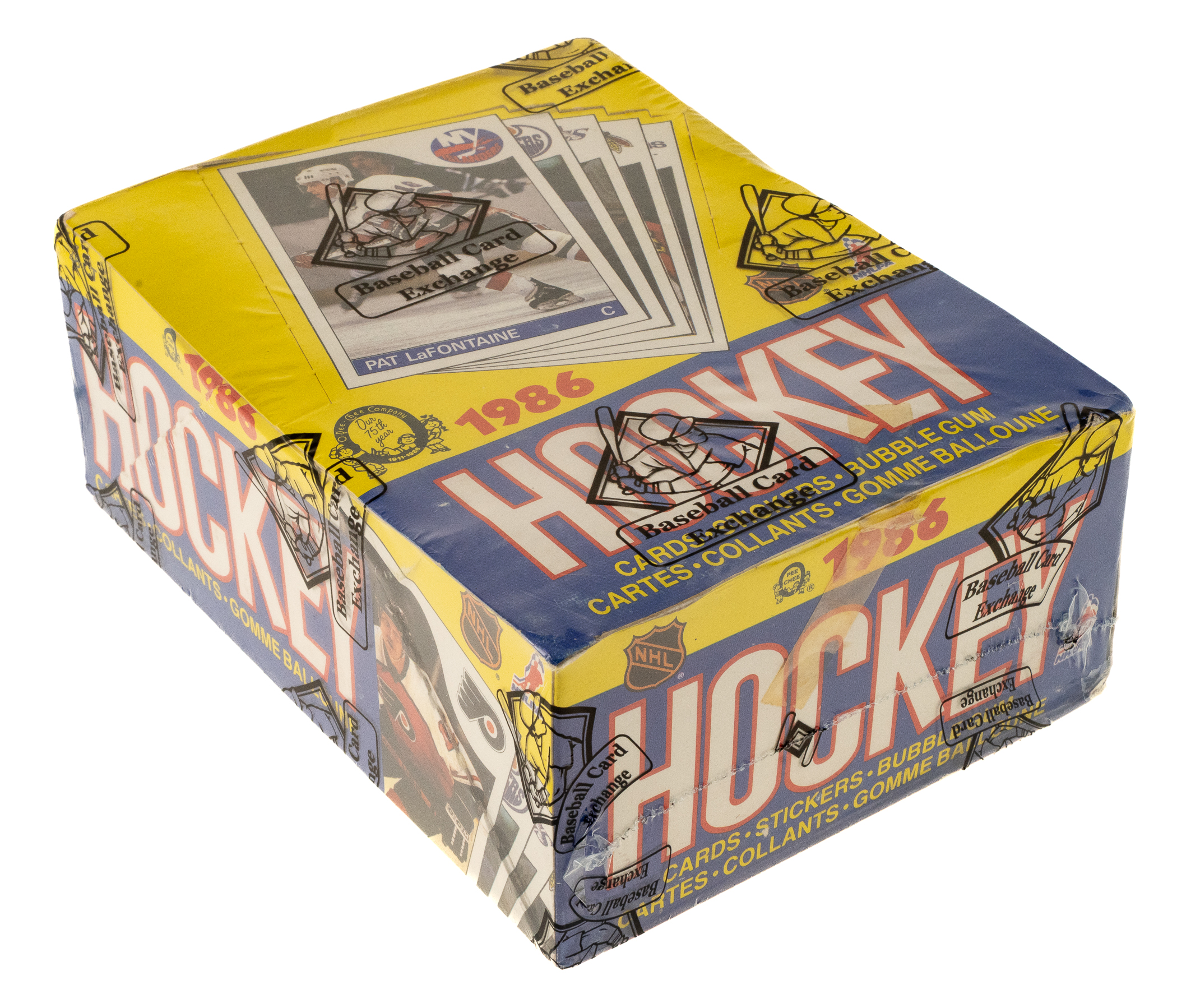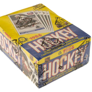 Complete, original unopened wax box of 1985-1986 O-Pee-Chee Hockey containing 48 unopened wax packs. This is only the eighth unopened wax box from this series we have offered in the past 22 years! The 1985-1986 O-Pee-Chee Hockey set includes the rookie card of Hall of Famer Mario Lemieux and many other Hall of Famers including Gretzky, MacInnis, Yzerman, and Bourque. Given the meteoric rise of high-grade rookie cards recently, including the incredible $78,000 public auction sale of a GEM MINT 10 O-Pee-Chee Lemieux in February 2021, it is hard not to consider the increased value prospects of a completely original unopened wax box of this classic issue. This box comes shrink-wrapped by Baseball Card Exchange (which is owned by Steve Hart, the foremost expert on unopened material). The store display box is bright and bold with light shelf wear, including a bit of creasing on a side panel.