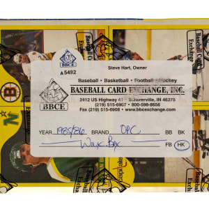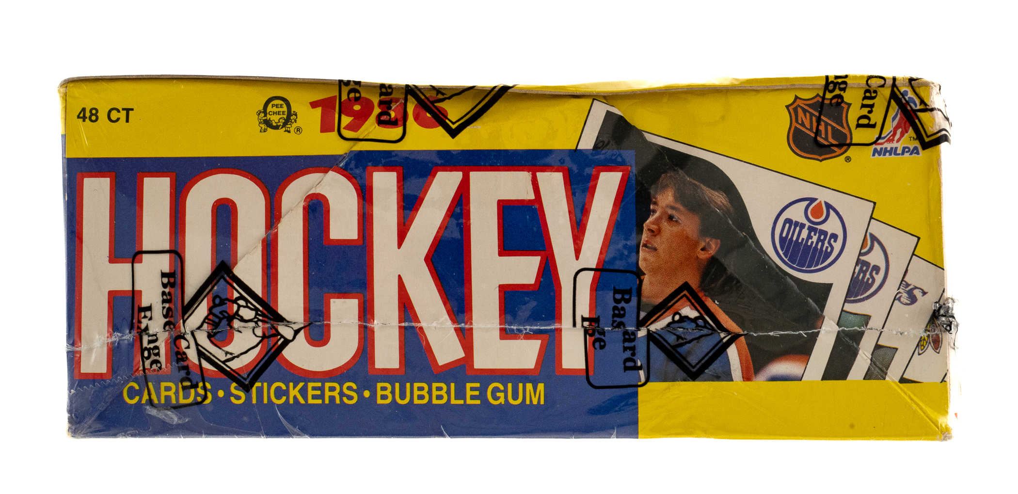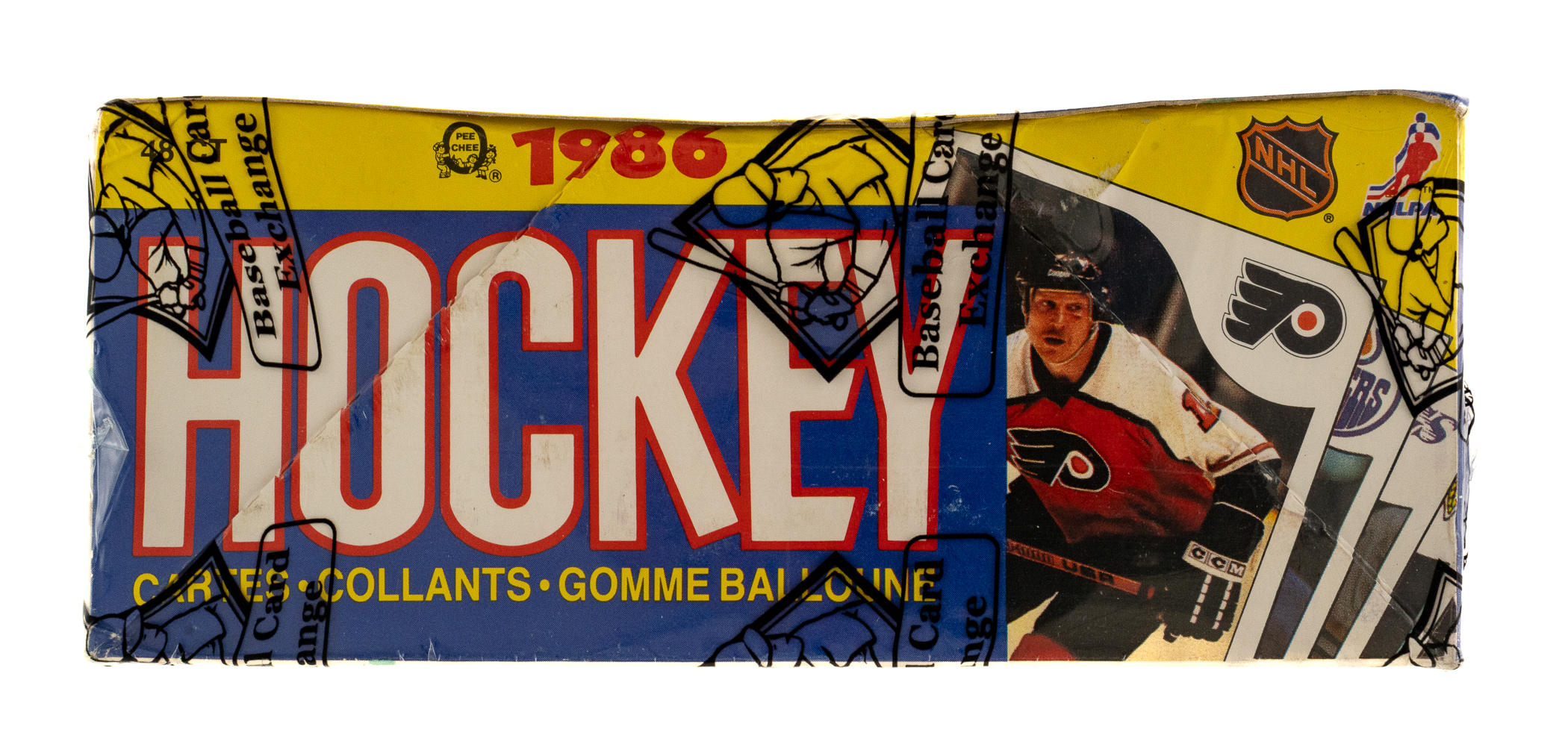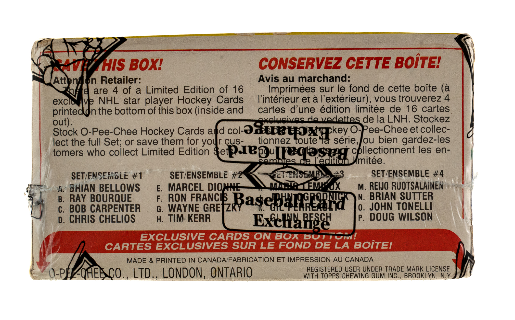 Complete, original unopened wax box of 1985-1986 O-Pee-Chee Hockey containing 48 unopened wax packs. This is only the eighth unopened wax box from this series we have offered in the past 22 years! The 1985-1986 O-Pee-Chee Hockey set includes the rookie card of Hall of Famer Mario Lemieux and many other Hall of Famers including Gretzky, MacInnis, Yzerman, and Bourque. Given the meteoric rise of high-grade rookie cards recently, including the incredible $78,000 public auction sale of a GEM MINT 10 O-Pee-Chee Lemieux in February 2021, it is hard not to consider the increased value prospects of a completely original unopened wax box of this classic issue. This box comes shrink-wrapped by Baseball Card Exchange (which is owned by Steve Hart, the foremost expert on unopened material). The store display box is bright and bold with light shelf wear, including a bit of creasing on a side panel.