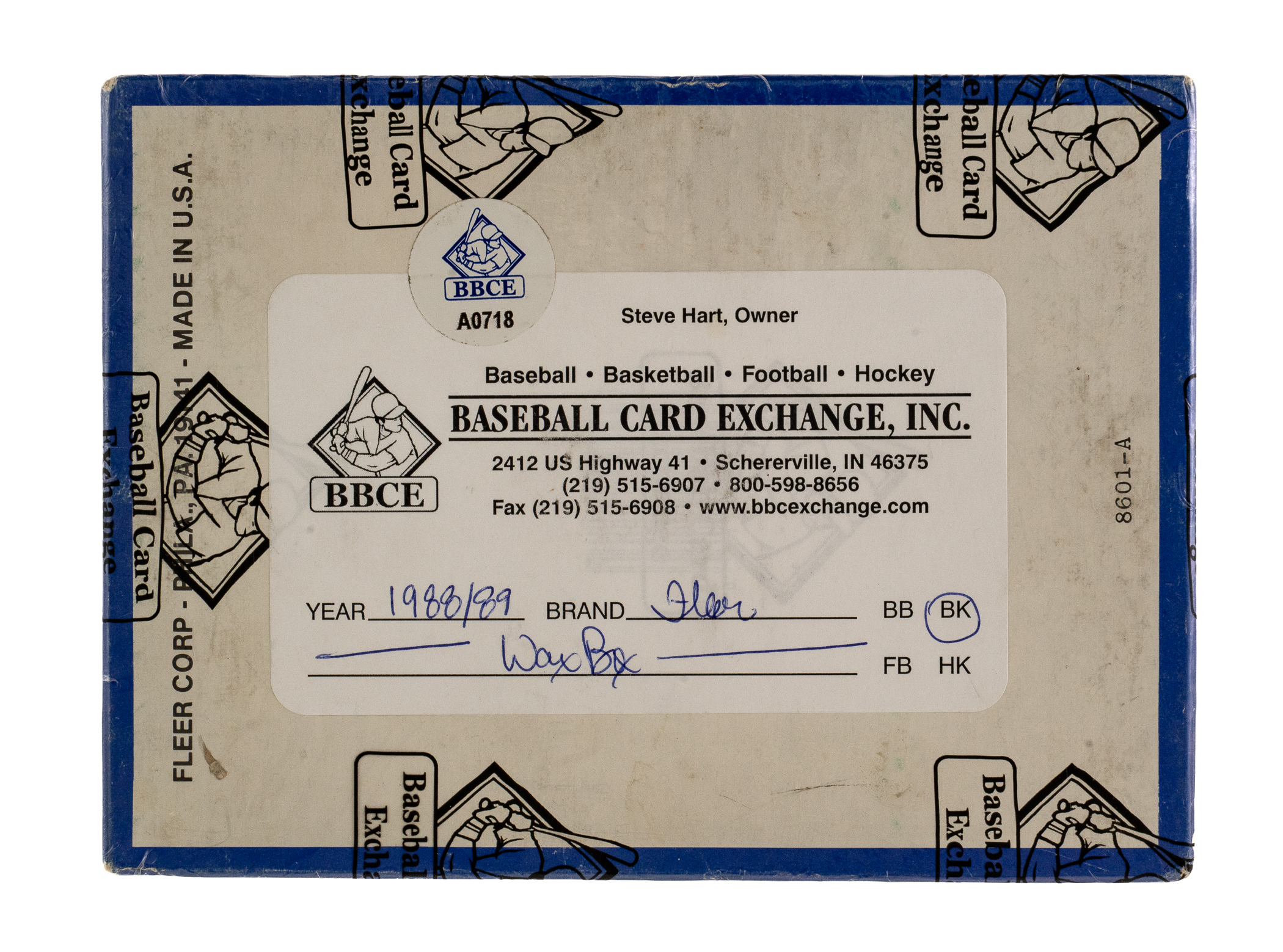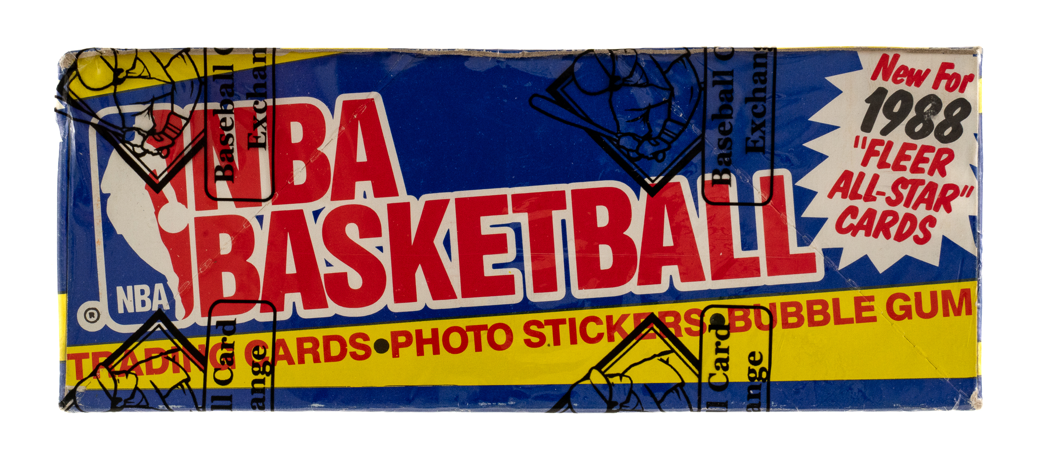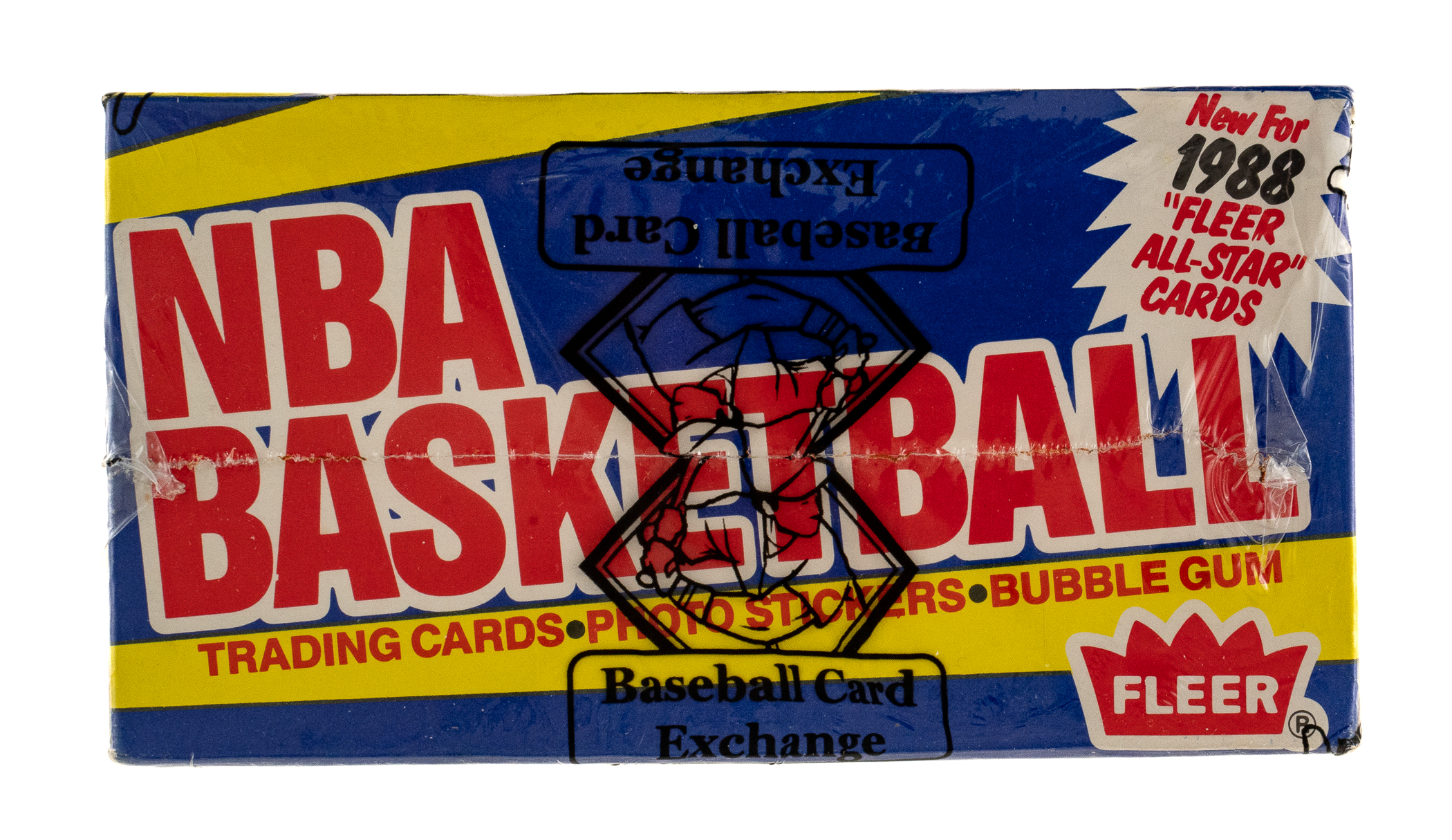 Complete, original unopened wax box of 1988-1989 Fleer basketball. The box comes shrink-wrapped by Baseball Card Exchange (owned by Steve Hart, the foremost expert on unopened material). The box contains 36 wax packs, each containing 12 cards and one sticker for a total of 432 cards and 36 stickers. The 1988-1989 Fleer set includes the rookie cards of Hall of Famers Reggie Miller, Scottie Pippen, Dennis Rodman, and John Stockton, as well as cards of several other Hall of Famers, including Larry Bird, Magic Johnson, Michael Jordan, and Patrick Ewing. The box, which displays minimal shelf wear, has an inventory sticker affixed to the lid.