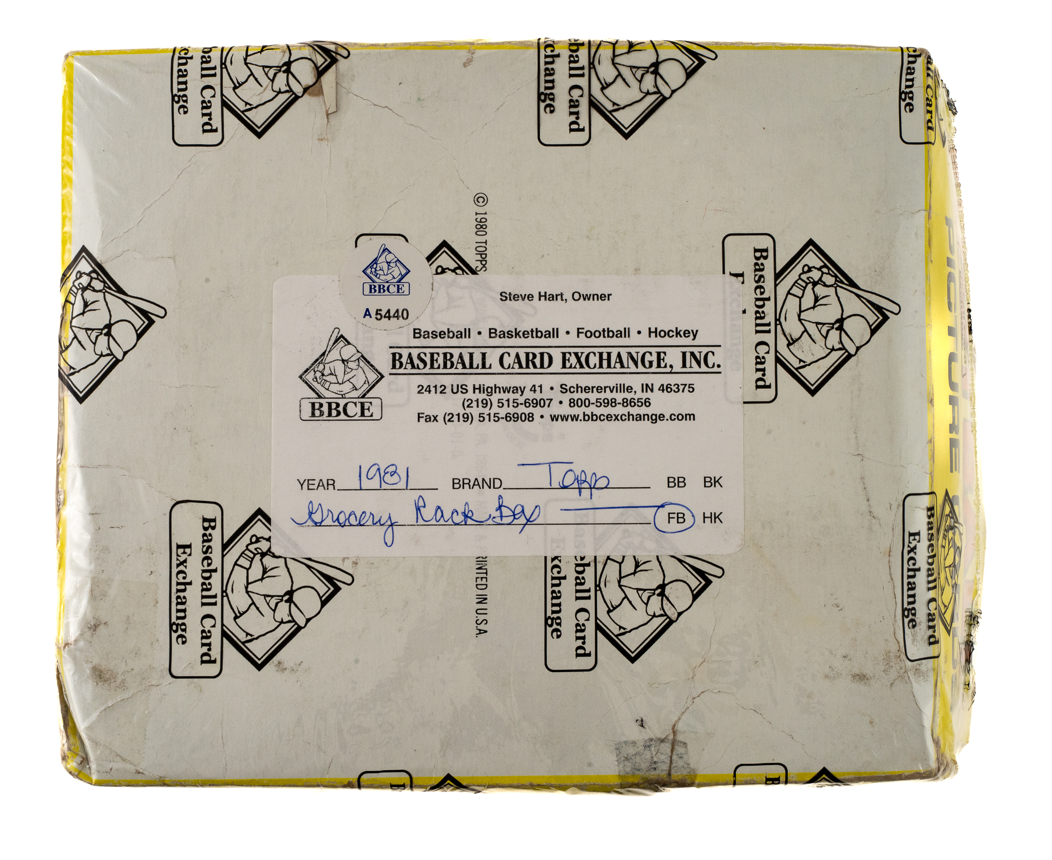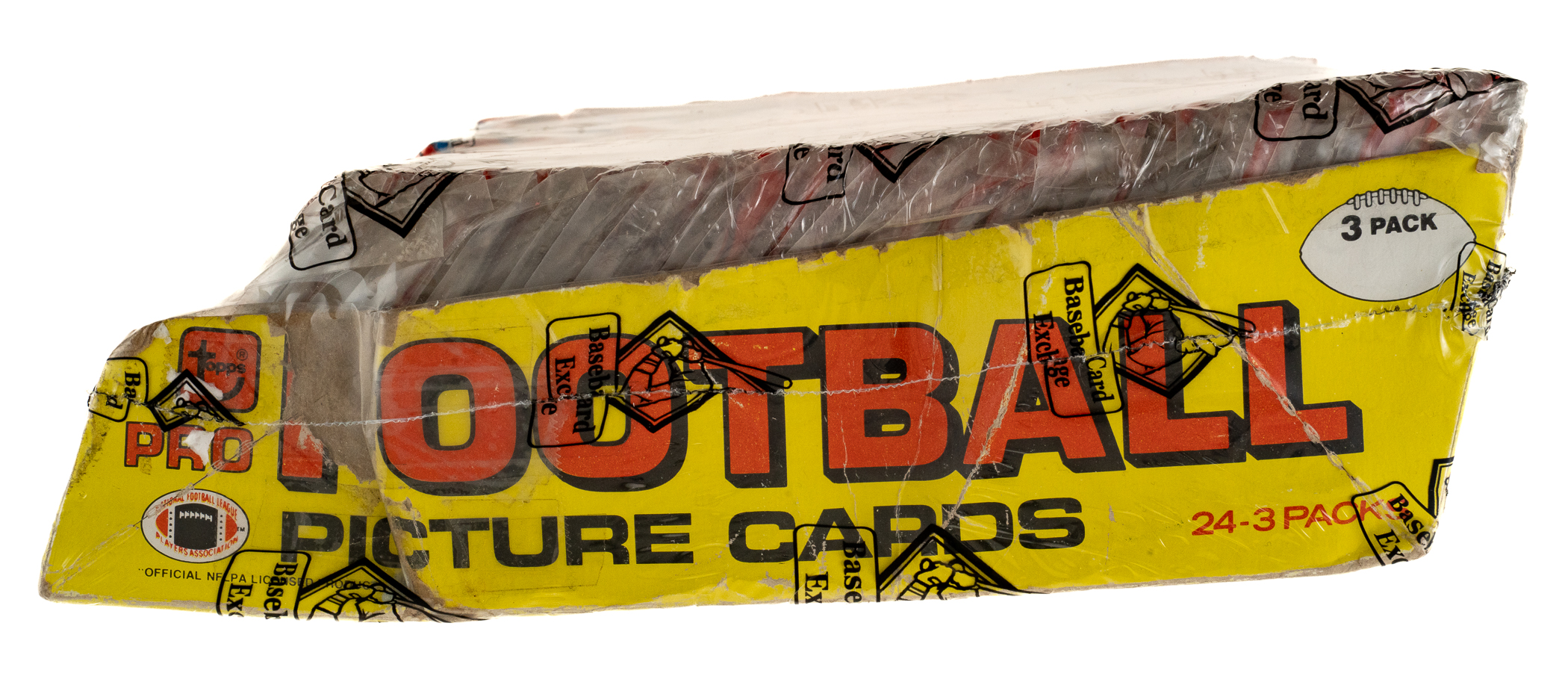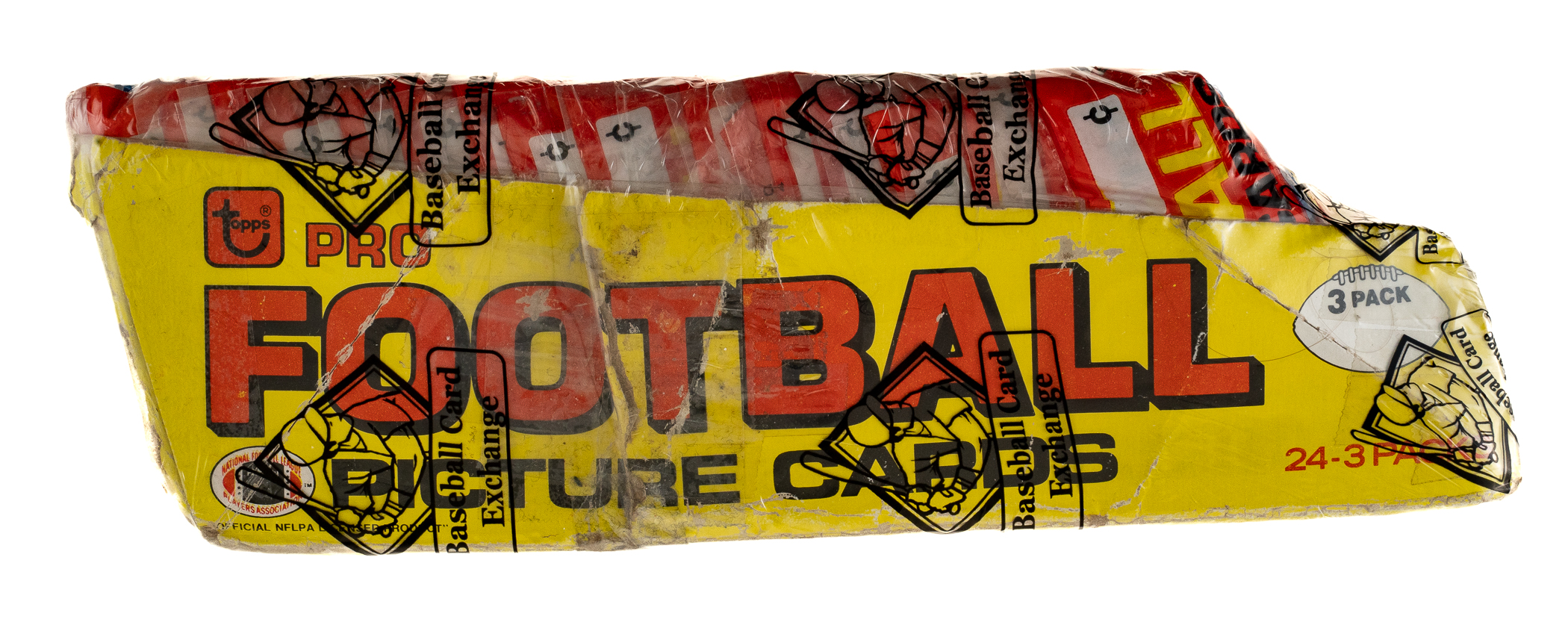 Outstanding collection of 24 grocery rack packs from the 1981 Topps football series housed in their original "tray-style" box. Each rack pack contains 36 cards arranged in three 12-card cello packs for a total of 864 cards. The 1981 Topps set features rookie cards of Hall of Famers Joe Montana, Art Monk, Kellen Winslow, and Dan Hampton, as well as numerous other stars and Hall of Famers, including Walter Payton, Jack Lambert, and Terry Bradshaw. The rack packs come shrink-wrapped by Baseball Card Exchange (owned by Steve Hart, the foremost expert on unopened material) in a 24-count group. The packs appear to be in Excellent condition. This is a very attractive collection of original unopened grocery rack packs from this very popular 1980s football set.