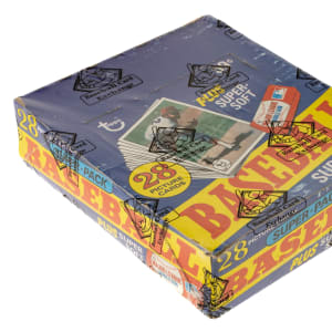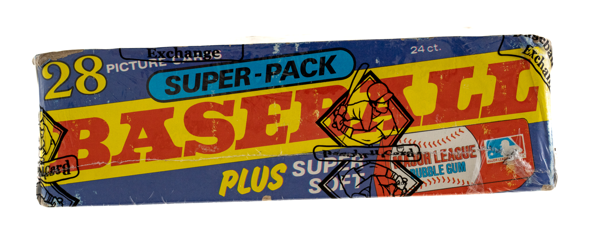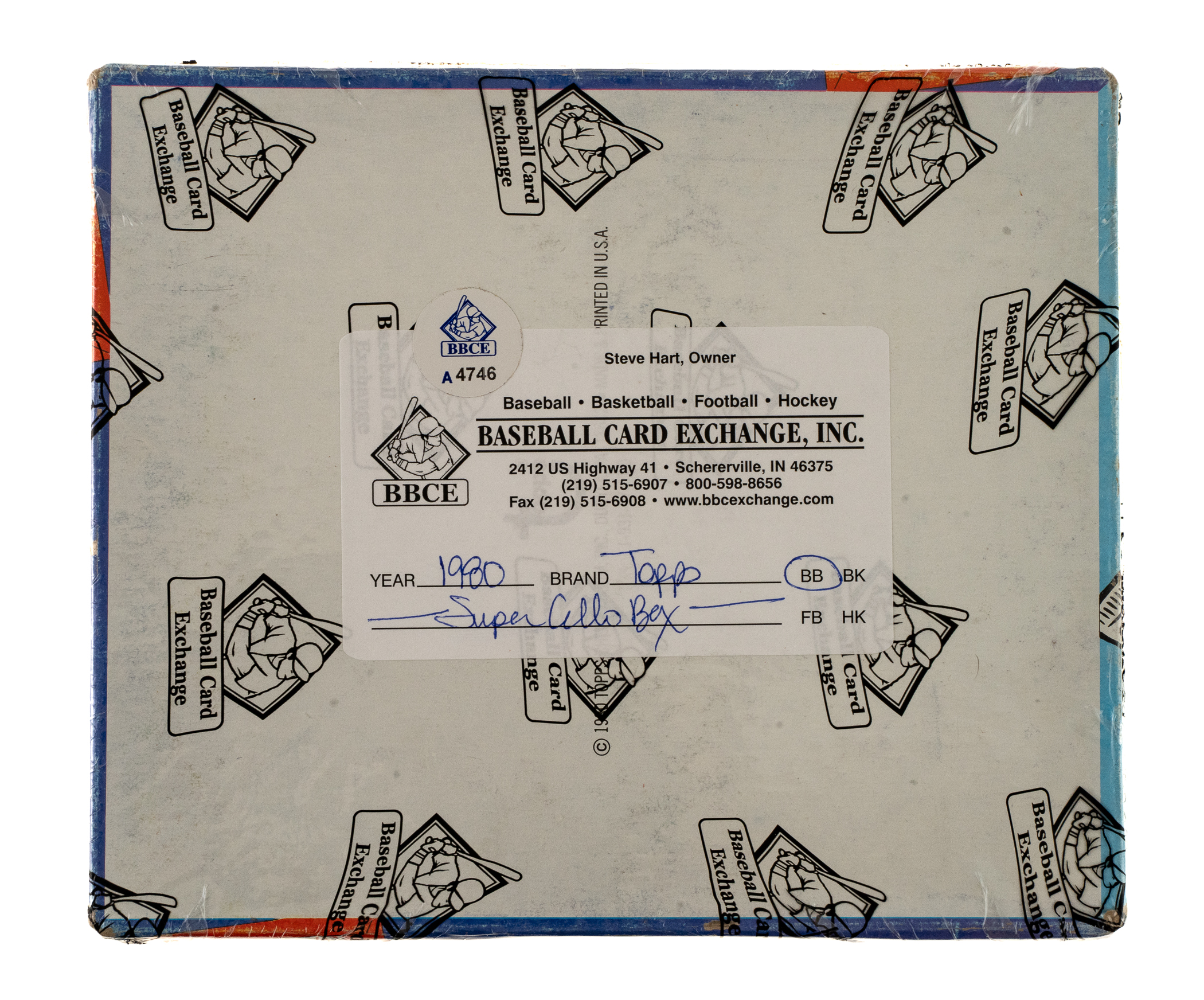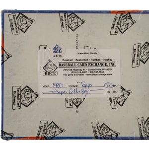 Complete, original unopened "Super" cello box of 1980 Topps baseball. The box houses 24 cello packs, with each pack containing 28 cards for a total of 672 cards. The 1980 Topps set includes the rookie card of Rickey Henderson and many other Hall of Famers including Nolan Ryan, George Brett, and Ozzie Smith. The store display box shows moderate shelf wear. The box comes shrink-wrapped by Baseball Card Exchange (owned by Steve Hart, the foremost expert on unopened material).