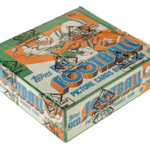 Complete, original unopened cello box of 1981 Topps football. The box houses 24 packs with each pack containing 27 cards for a total of 648 cards. The 1981 Topps football set features rookie cards of Hall of Famers Joe Montana, Art Monk, Kellen Winslow, and Dan Hampton. The store display box is bright and bold with moderate shelf wear, including a bit of creasing on the back panel. This box comes shrink-wrapped by Baseball Card Exchange (owned by Steve Hart, the foremost expert on unopened material).
