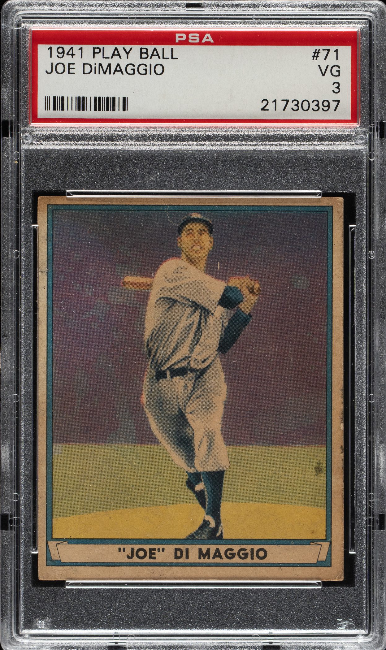 Graded VG 3 by PSA. Mid-grade 1941 Play Ball of New York Yankees Hall of Famer Joe DiMaggio. This example has a crisp image of DiMaggio. Downgraded due to minor soiling and a few small creases. This card tends to be very difficult to find in high grade because it is #71 of 72 cards in the set. A presentable example of one of the key cards from the 1941 Play Ball set and one of the iconic cards of the era.
