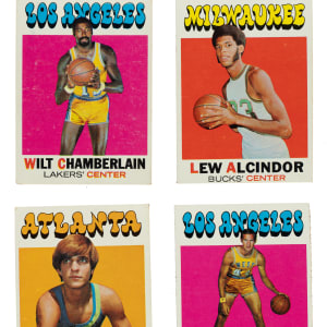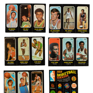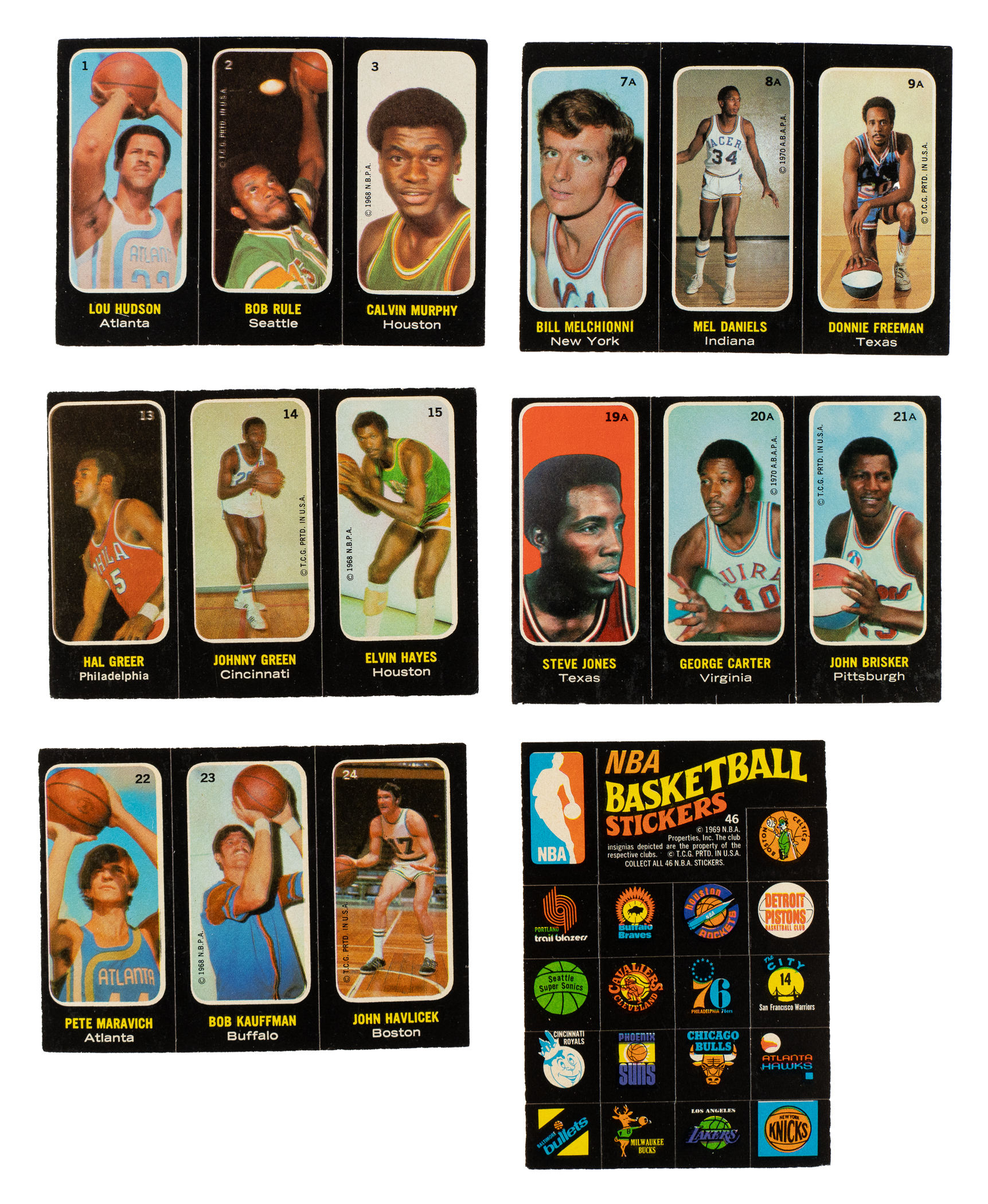 Presented is a complete set of 1971-1972 Topps basketball, consisting of 233 different cards. Included are the following six trio stickers (four Ex and two Vg-Ex): #1/2/3 Murphy, 7a/8a/9a, 13/14/15 Hayes, 19a/20a/21a, 22 Maravich/23/24 Havlicek, and #46 Team Logos. The 1971-1972 Topps set is very popular among collectors for its bright colors and funky text, both telltale signs of an early 1970s issue. The set is loaded with stars and Hall of Famers, including Pete Maravich, Oscar Robertson, and rookie cards of Rick Barry, Dave Cowens, Bob Lanier, Larry Brown, Nate Archibald, and Dan Issel. This was also the first year that Topps included cards of ABA (American Basketball Association) players. Condition is 20% Ex-Mt to Nr/Mt, 64% Vg-Ex to Ex, and 16% Gd to Vg (mostly Vg). Keys: #1 Robertson (Vg-Ex), 2 Bradley (Ex-Mt), 10 Baylor (Vg+), 20 Haywood RC (Ex due to centering), 29 Archibald RC (wax on reverse, otherwise Nr/Mt), 35 Havlicek (Ex), 47 Cowens RC (Ex-Mt), 50 West (Ex-Mt), 55 Maravich (Gd), 63 Lanier RC (Ex), 65 Frazier (Ex+), 70 Chamberlain (Vg), 91 Tomjanovich RC (Ex+ due solely to centering), 100 Alcindor (Vg), 120 Hayes (Vg), 138 NBA Scoring Ldrs (Vg+), 152 L. Brown RC (Ex), 170 Barry RC (Nr/Mt+), 195 Daniels RC (Vg-Ex), 200 Issel RC (Vg-Ex+), 224 Dampier RC (Ex-Mt), and 225 R. Brown RC (Ex). A very attractive mid- to high-grade complete set of this popular 1970s Topps basketball issue, loaded with stars and Hall of Famers. Total: 233 cards plus six stickers. The size/weight of this item requires that there will be an additional shipping charge for this lot.