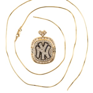 Rare New York Yankees pendant, produced by Balfour, issued in commemoration of the club's 1999 World Championship season. The 14K-gold pendant, which is nearly identical in design to the front of the club's 1999 World Championship ring, is one of the most impressive and generously diamond-studded pieces of jewelry ever produced. Twenty-five small diamonds decorate the team's familiar "NY" logo on the front, which in turn rests upon a blue stone. Approximately 48 small diamonds surround the logo. The year "1999" is displayed on the pendant's bezel. "Balfour 14K" is engraved on the reverse. These pendants were produced exclusively for the players' wives and female staff members (although not all received one), and they are actually rarer than their ring counterparts. This is not only the first example of a 1999 Yankees World Championship pendant we have offered, but just the second we can recall seeing at public auction. It is also one of the most attractive pendants dating from club's late 1990s to early 2000s dynasty. Near Mint condition. Together with a 22-inch gold chain stamped 14k (which needs to be repaired).