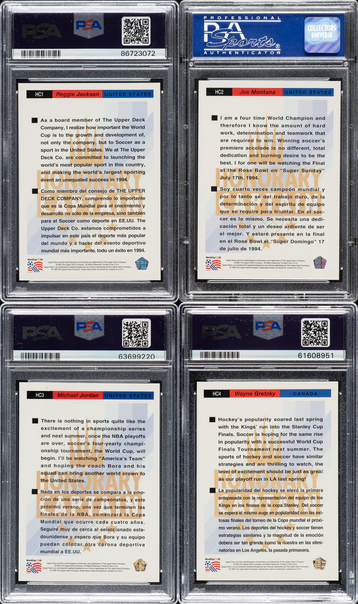 Complete set of 1993 Upper Deck World Cup Preview English/Spanish Honorary Captains Gold cards, each graded and encapsulated MINT 9 by PSA. Includes the following: #HC1 Jackson, HC2 Montana, HC3 Jordan, and HC4 Gretzky. Total: 4 cards.