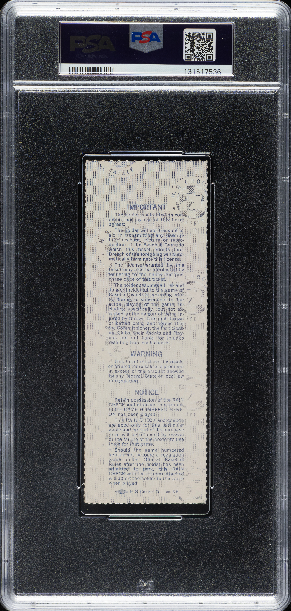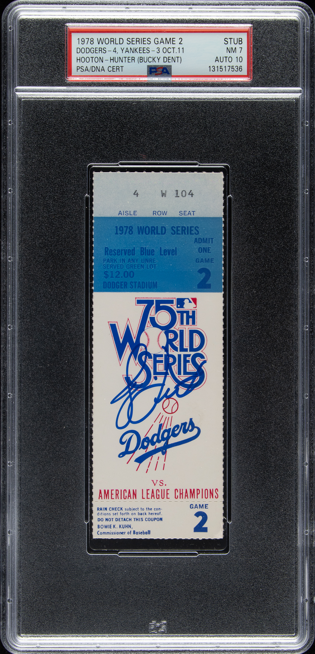PSA/DNA has encapsulated the ticket, grading the signature GEM MINT 10 and the ticket NM 7. New York Yankees vs. Los Angeles Dodgers.