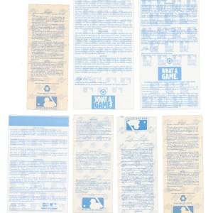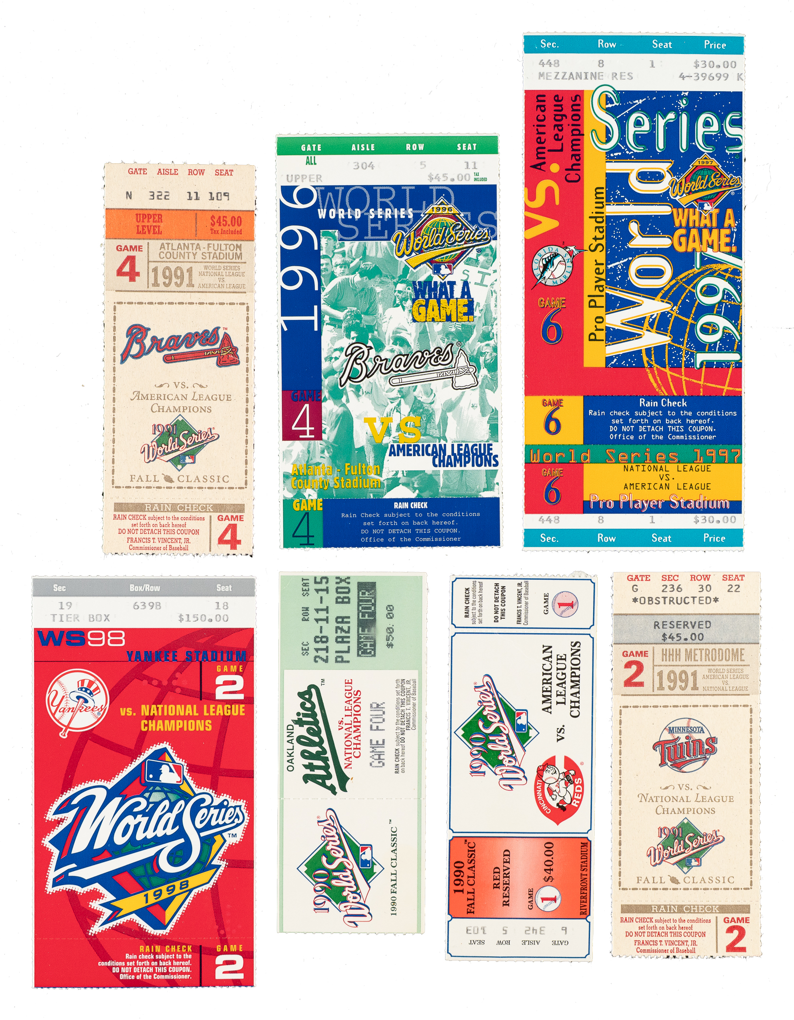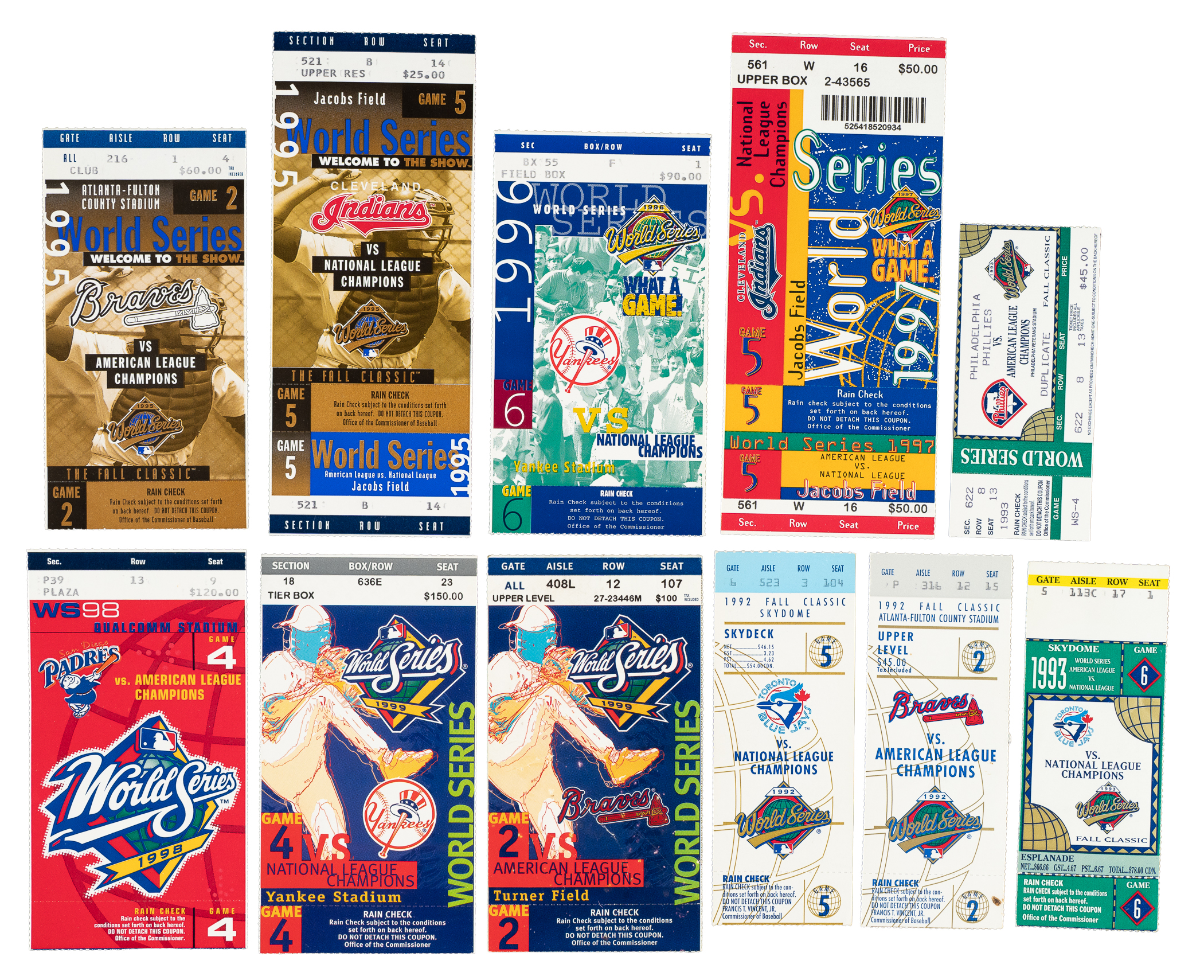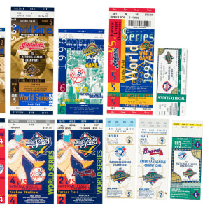 Outstanding collection of 18 World Series ticket stubs, spanning the years 1990 to 1999. This collection is particularly noteworthy because it includes one home ticket from each team that competed in the World Series from those seasons (there was no World Series in 1994 due to the strike). The condition of the tickets largely ranges from Very Good to Excellent, with a few lesser. This collection consists of the following: 1) 1990 Game 1. 2) 1990 Game 4. 3) 1991 Game 2. 4) 1991 Game 4. 5) 1992 Game 2. 6) 1992 Game 5. 7) 1993 Game 4. 8) 1993 Game 6. 9) 1995 Game 2. 10) 1995 Game 5. 11) 1996 Game 4. 12) 1996 Game 6. 13) 1998 Game 5. 14) 1997 Game 6. 15) 1998 Game 2. 16) 1998 Game 4. 17) 1998 Game 2. 18) 1998 Game 4. Total: 18 ticket stubs.
