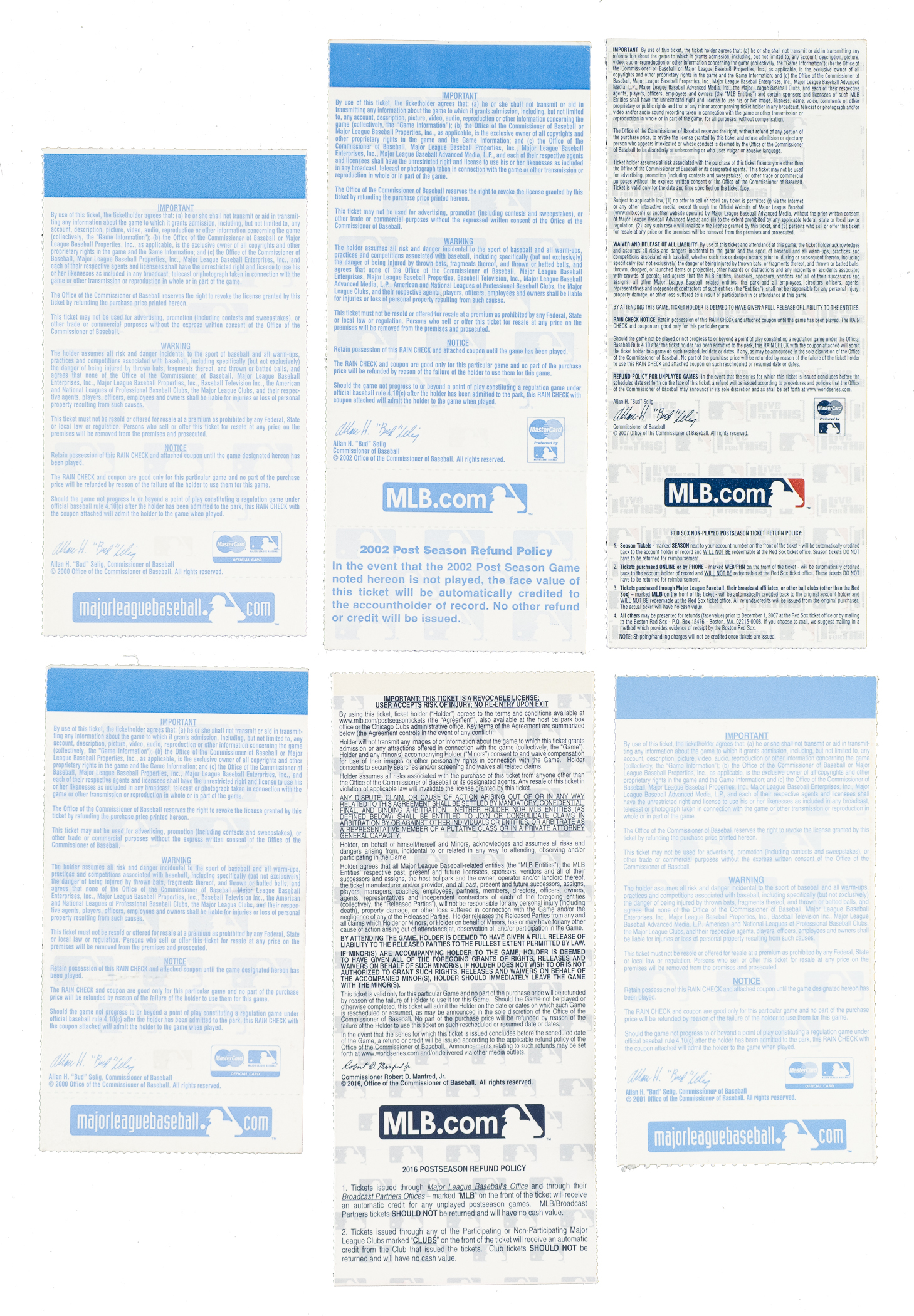 Complete run of 40 World Series full tickets and stubs, spanning the years 2000 to 2019. This collection is especially noteworthy because it includes one home ticket from each team that competed in the World Series from those seasons. The condition of the tickets largely ranges from Excellent to Near Mint, with a few lesser. This collection consists of the following: 1) 2000 Game 2 (stub). 2) 2000 Game 3 (stub). 3) 2001 Game 3 (stub). 4) 2001 Game 6 (stub). 5) 2002 Game 1 (stub). 6) 2002 Game 3 (full). 7) 2003 Game 2 (stub). 8) 2003 Game 3 (full). 9) 2004 Game 2 (full). 10) 2004 Game 3 (stub). 11) 2005 Game 1 (full). 12) 2005 Game 4 (full). 13) 2006 Game 1 (full). 14) 2006 Game 3 (full). 15) 2007 Game 1 (full). 16) 2007 Game 4 (full). 17) 2008 Game 1 (full). 18) 2008 Game 5 (full). 19) 2009 Game 1 (full). 20) 2009 Game 3 (full). 21) 2010 Game 2 (full). 22) 2010 Game 5 (full). 23) 2011 Game 2 (full). 24) 2011 Game 4 (full). 25) 2012 Game 2 (full). 26) 2012 Game 3 (full). 27) 2013 Game 2 (full). 28) 2013 Game 5 (full). 29) 2014 Game 2 (full). 30) 2014 Game 3 (full). 31) 2015 Game 1 (full). 32) 2015 Game 4 (full). 33) 2016 Game 4 (full). 34) 2016 Game 6 (full). 35) 2017 Game 3 (full). 36) 2017 Game 6 (full). 37) 2018 Game 2 (full). 38) 2018 Game 3 (full). 39) 2019 Game 4 (full). 40) 2019 Game 6 (full). Total 40 tickets.