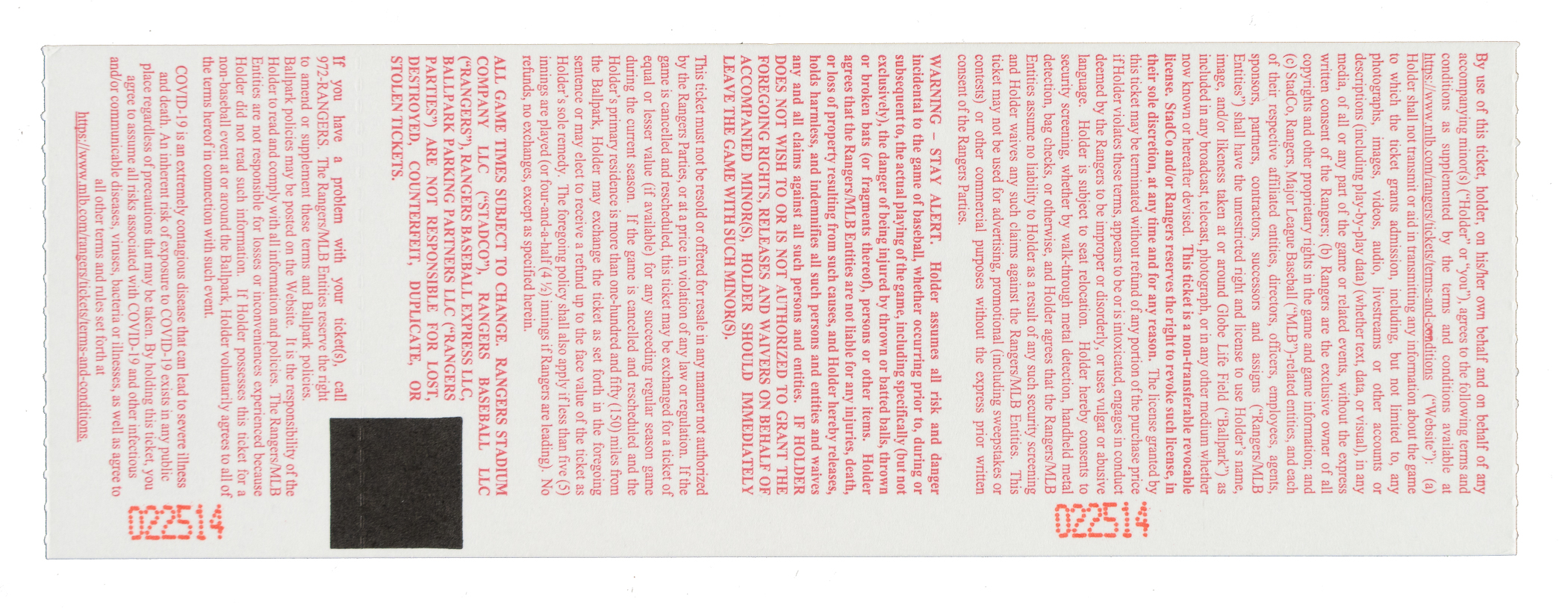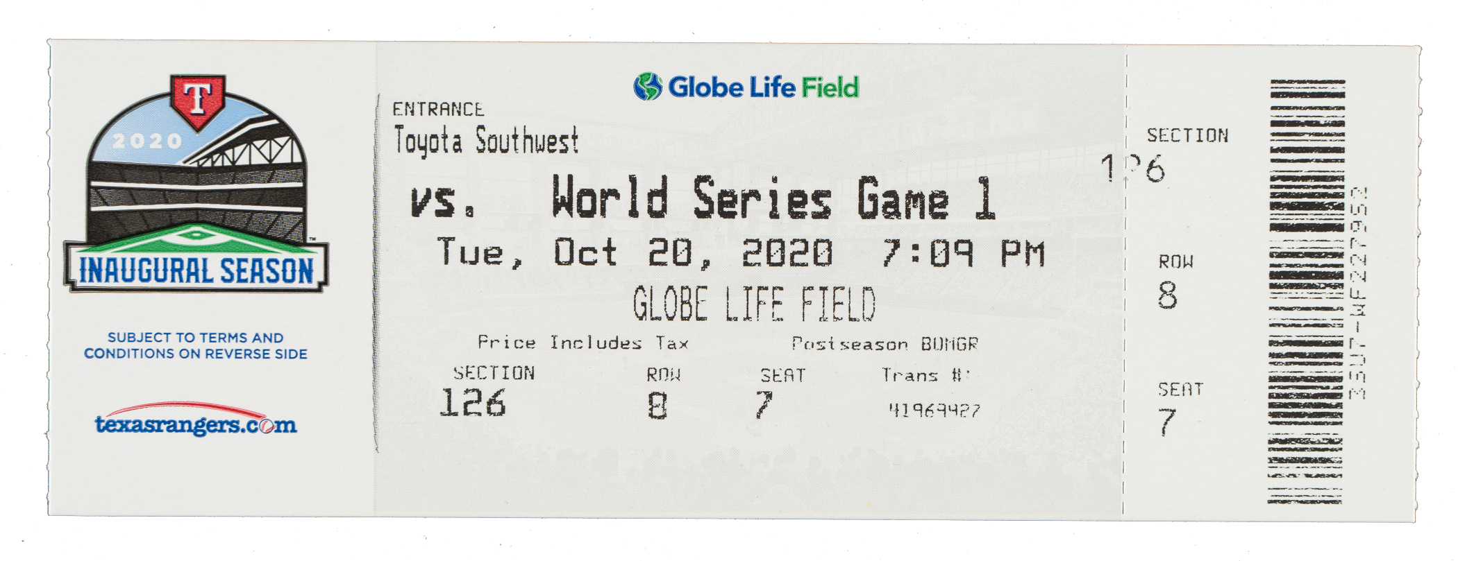 Souvenir reprint full ticket (5-5/8 x 2 inches) for Game 1 of the 2020 World Series between the Los Angeles Dodgers and Tampa Bay Rays on October 20th. While a handful of original tickets are known to exist, they are incredibly rare. Souvenir reprint tickets (i.e., the offered example) were printed by the ballpark in the weeks following the World Series at the request of fans. The 2020 Major League Baseball season was abbreviated to just 60 regular-season games due to the COVID-19 pandemic. An expanded 16-team playoff was played at neutral-site ballparks before the season concluded with the World Series at Globe Life Field in Arlington, Texas. This marked the first time since 1944, when the St. Louis Browns faced the St. Louis Cardinals at Sportsman's Park, that a World Series was played exclusively at a single ballpark. Due to the pandemic, only 11,500 fans (roughly 29% of ballpark capacity) were allowed per game. The Dodgers defeated the Rays 8-3 in Game 1, behind a strong start from Clayton Kershaw and home runs from Cody Bellinger and Mookie Betts. Near Mint to Mint condition overall.