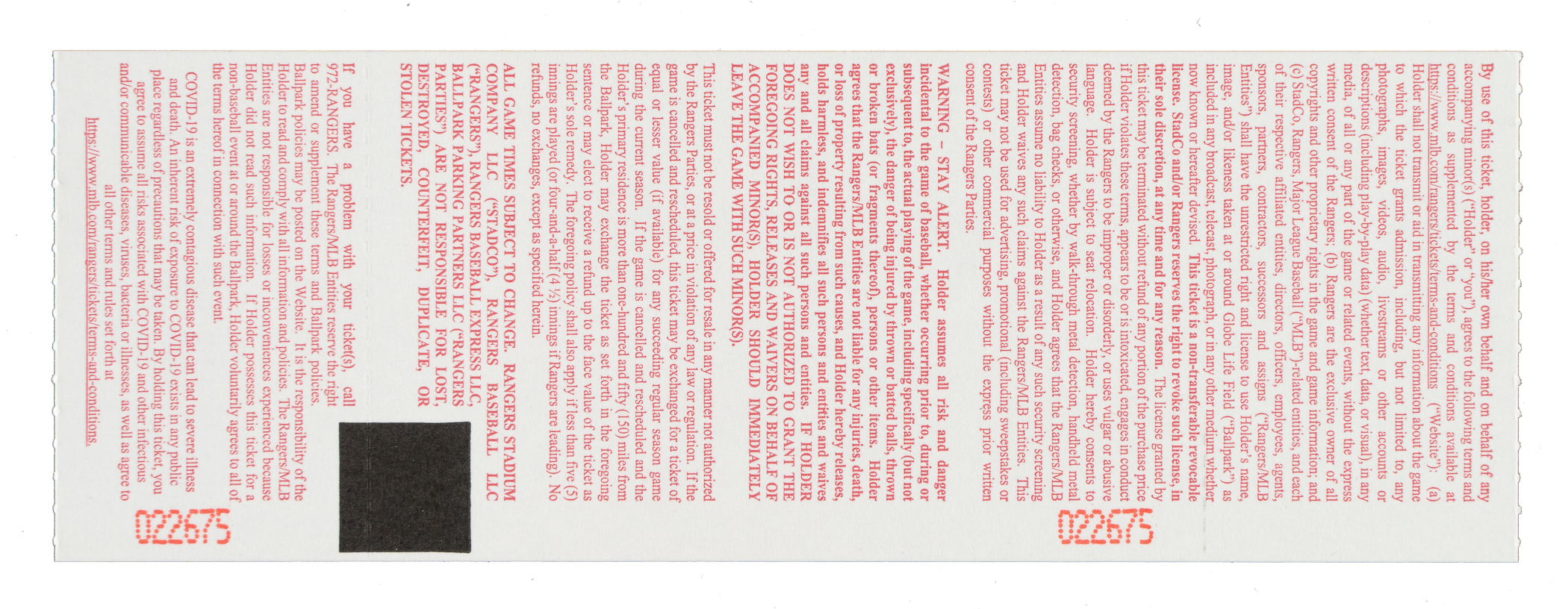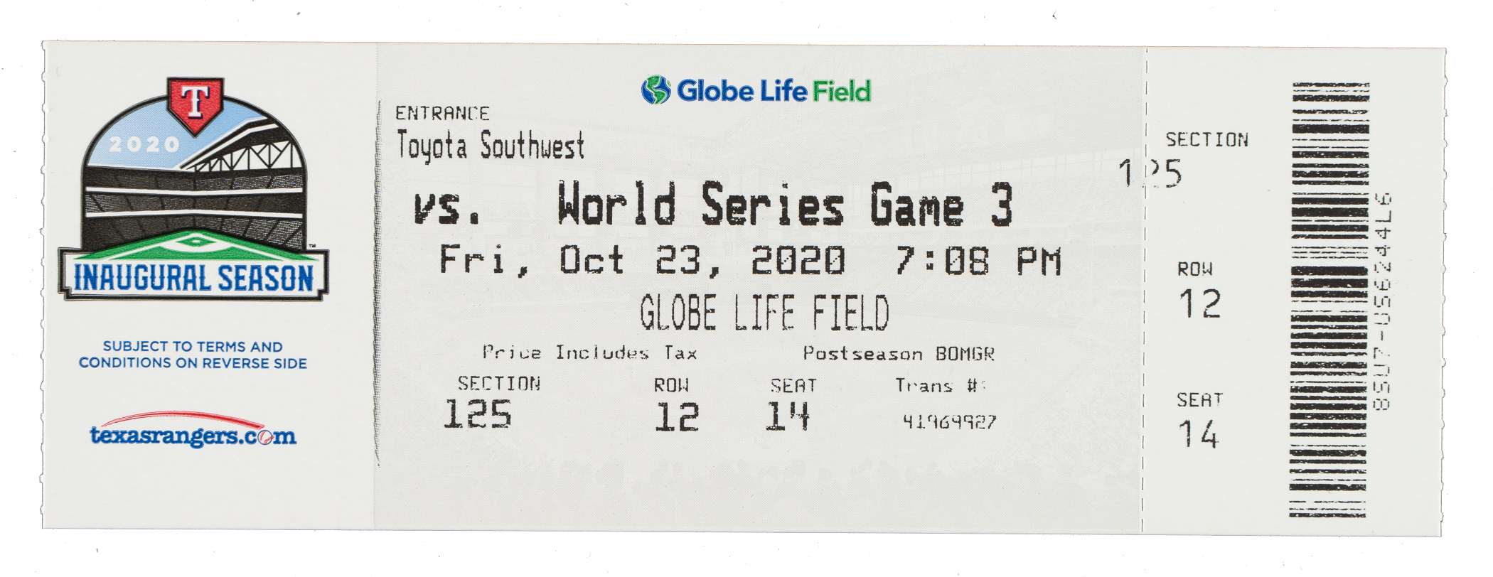 Souvenir reprint full ticket (5-5/8 x 2 inches) for Game 1 of the 2020 World Series between the Los Angeles Dodgers and Tampa Bay Rays on October 23rd. While a handful of original tickets are known to exist, they are incredibly rare. Souvenir reprint tickets (i.e., the offered example) were printed by the ballpark in the weeks following the World Series at the request of fans. The 2020 Major League Baseball season was abbreviated to just 60 regular-season games due to the COVID-19 pandemic. An expanded 16-team playoff was played at neutral-site ballparks before the season concluded with the World Series at Globe Life Field in Arlington, Texas. This marked the first time since 1944, when the St. Louis Browns faced the St. Louis Cardinals at Sportsman's Park, that a World Series was played exclusively at a single ballpark. Due to the pandemic, only 11,500 fans (roughly 29% of ballpark capacity) were allowed per game. The Dodgers defeated the Rays 6-2 in Game 3, behind a strong start from Walker Buehler and home runs from Justin Turner and Austin Barnes. Near Mint to Mint condition overall.
