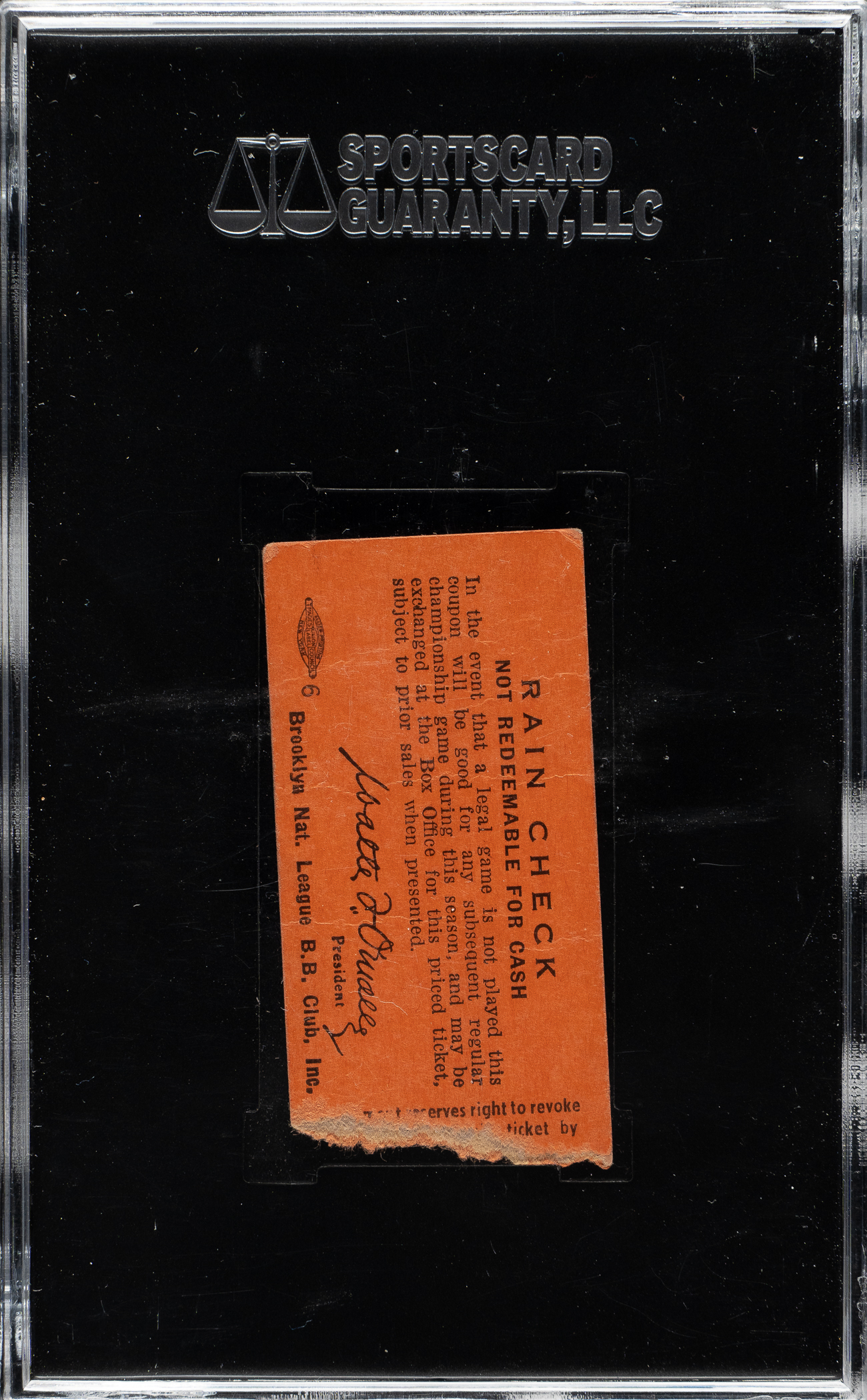 Brooklyn Dodgers regular-season ticket stub issued for a doubleheader against the Chicago Cubs on July 22, 1953. The Dodgers won both games, 9-3 and 11-1. Gil Hodges homered for the victors in both contests. Encapsulated as Authentic by SGC, ticket stub (1-1/4 x 2-3/8) displays scattered creasing and presents in Good condition overall.