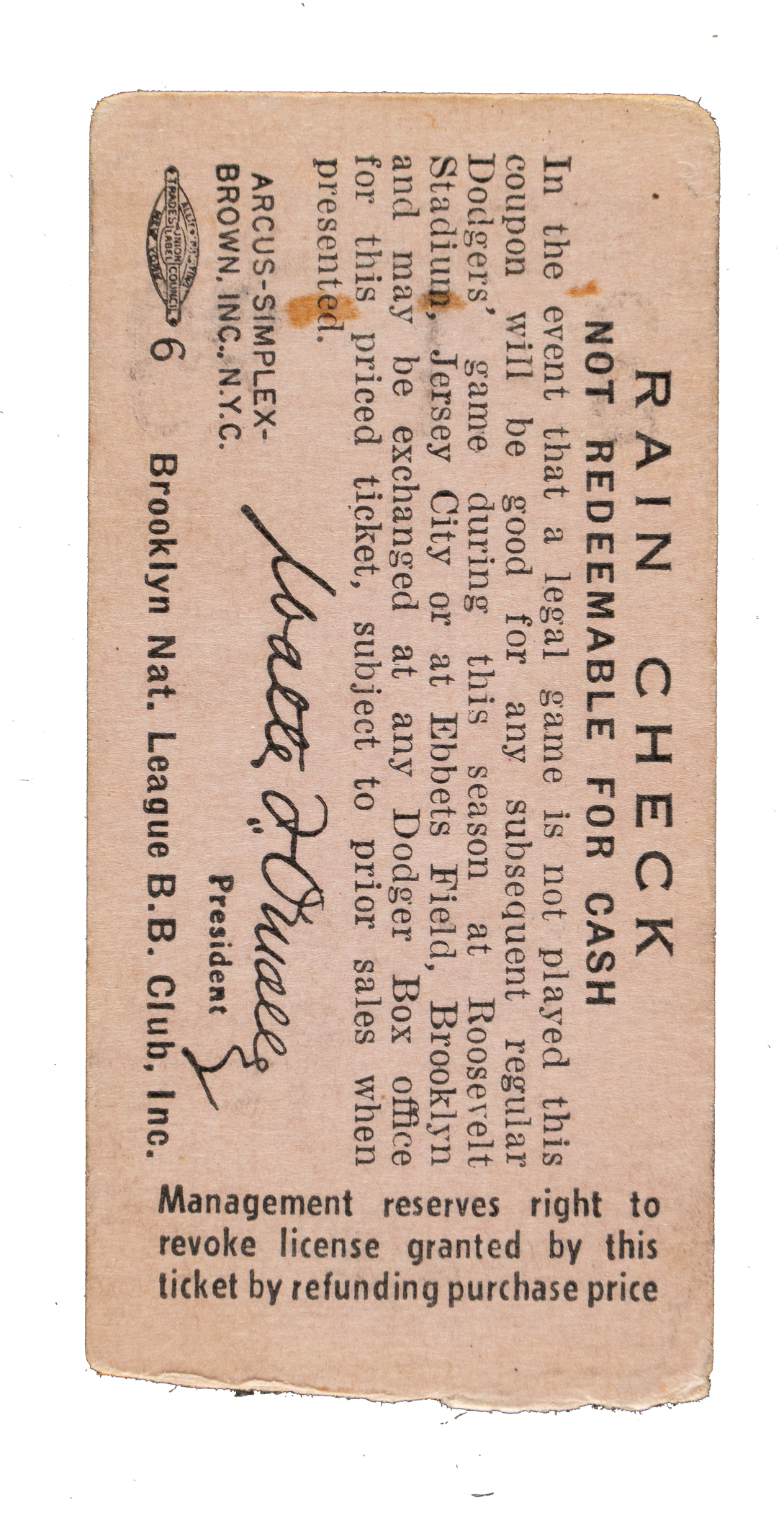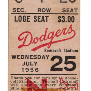 Brooklyn Dodgers regular-season ticket stub issued for a game against the Cincinnati Reds on July 25, 1956, played at Roosevelt Stadium in Jersey City, New Jersey. In an attempt to put pressure on the city of Brooklyn to build the Dodgers a new stadium, team owner Walter O'Malley had the Dodgers play 15 home games across the 1956 and 1957 seasons in New Jersey. Duke Snider hit a walk-off blast as the Dodgers beat the Reds 3-2. Frank Robinson homered for the Reds in the losing effort. The ticket stub (1.25 x 2.5 inches) has a small piece of tape affixed to the front and a tape stain just above. Fair condition overall.