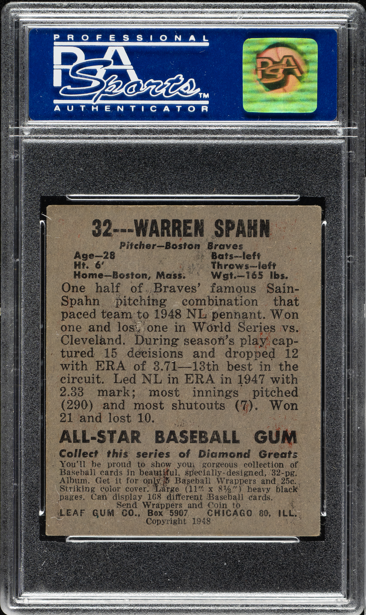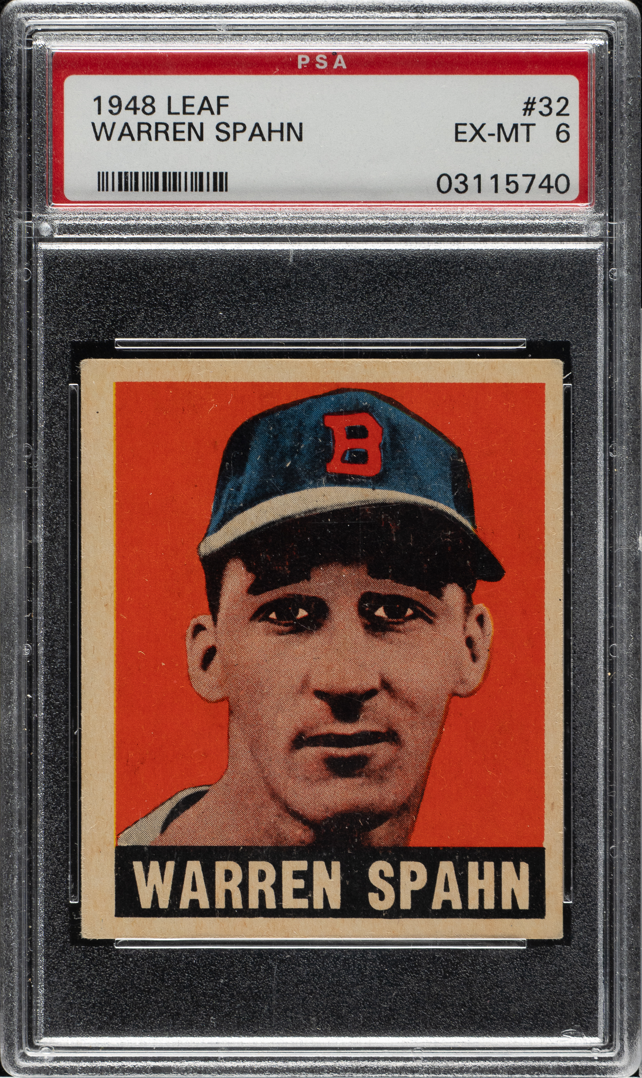 Graded EX-MT 6 by PSA. Boston Braves Hall of Famer Warren Spahn.
