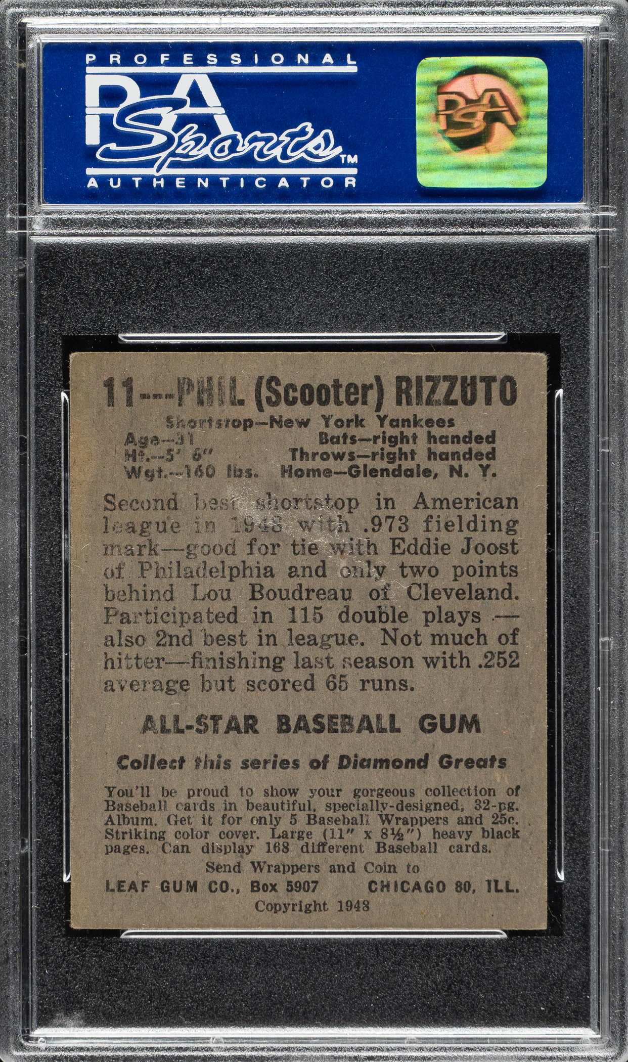 Graded VG-EX 4 by PSA. New York Yankees Hall of Famer Phil Rizzuto.
