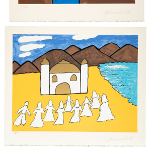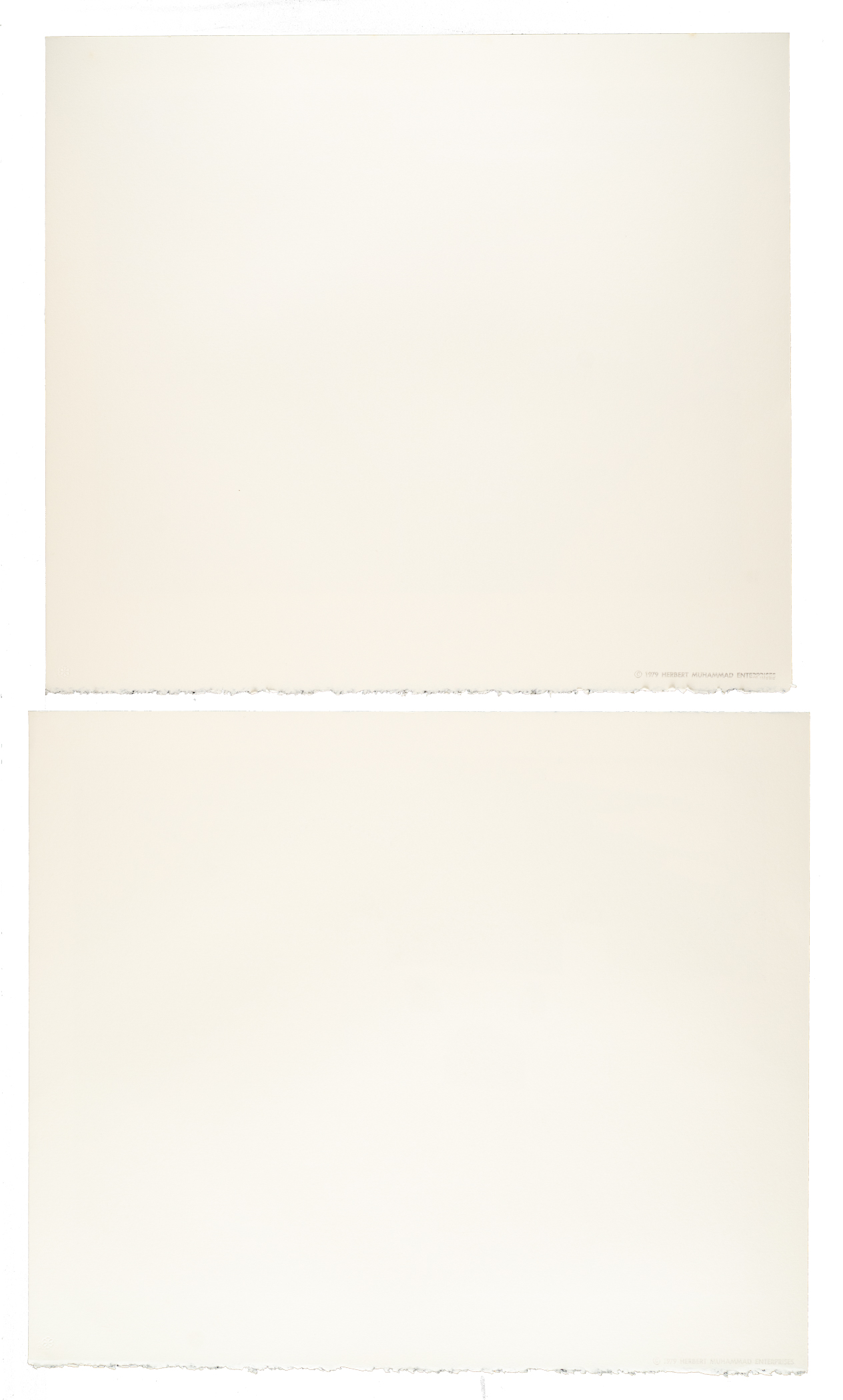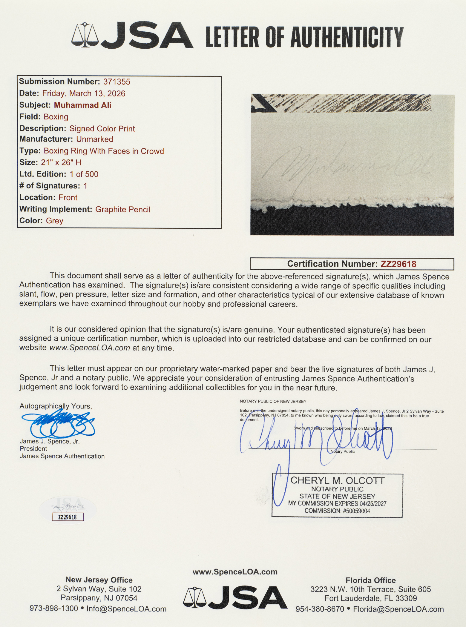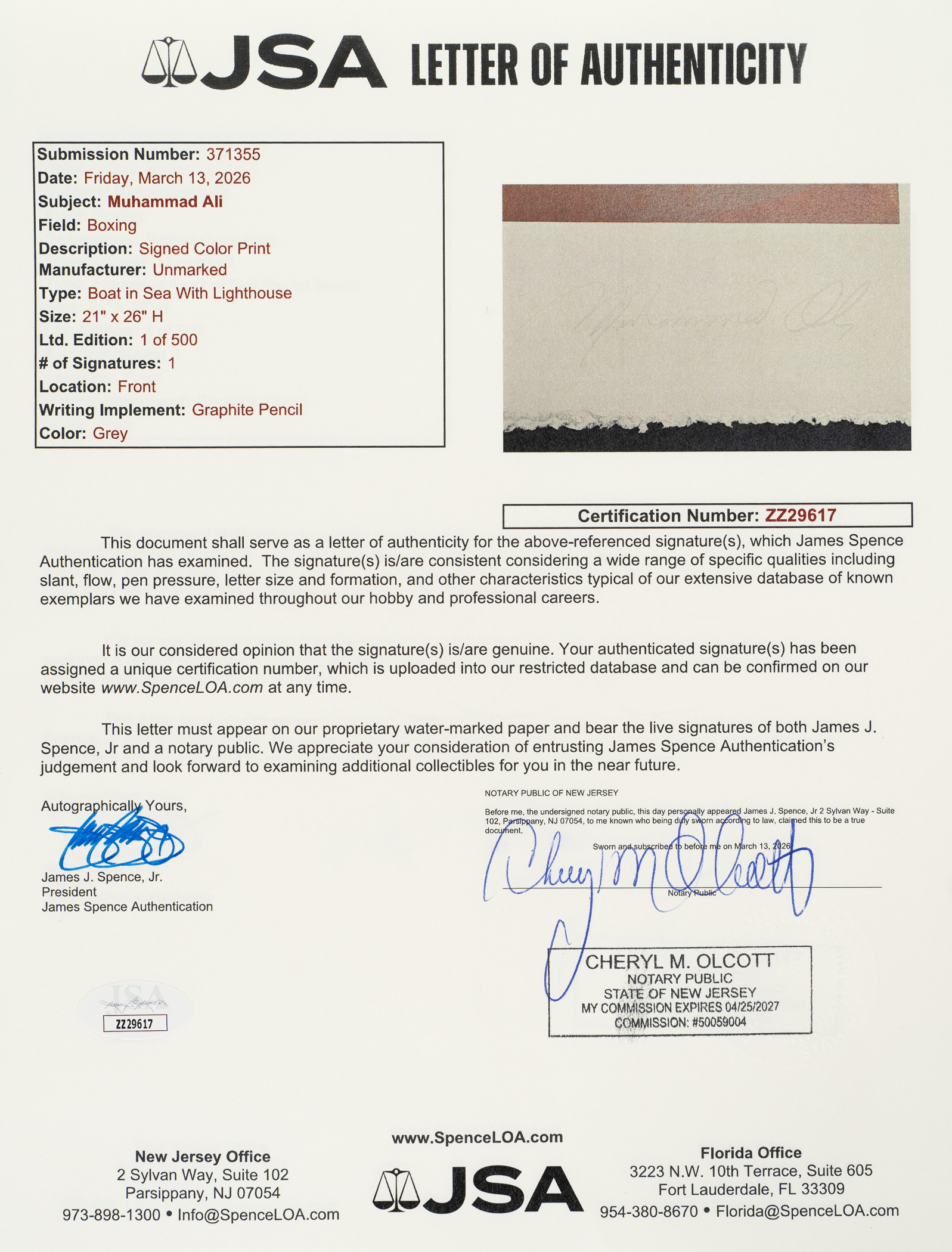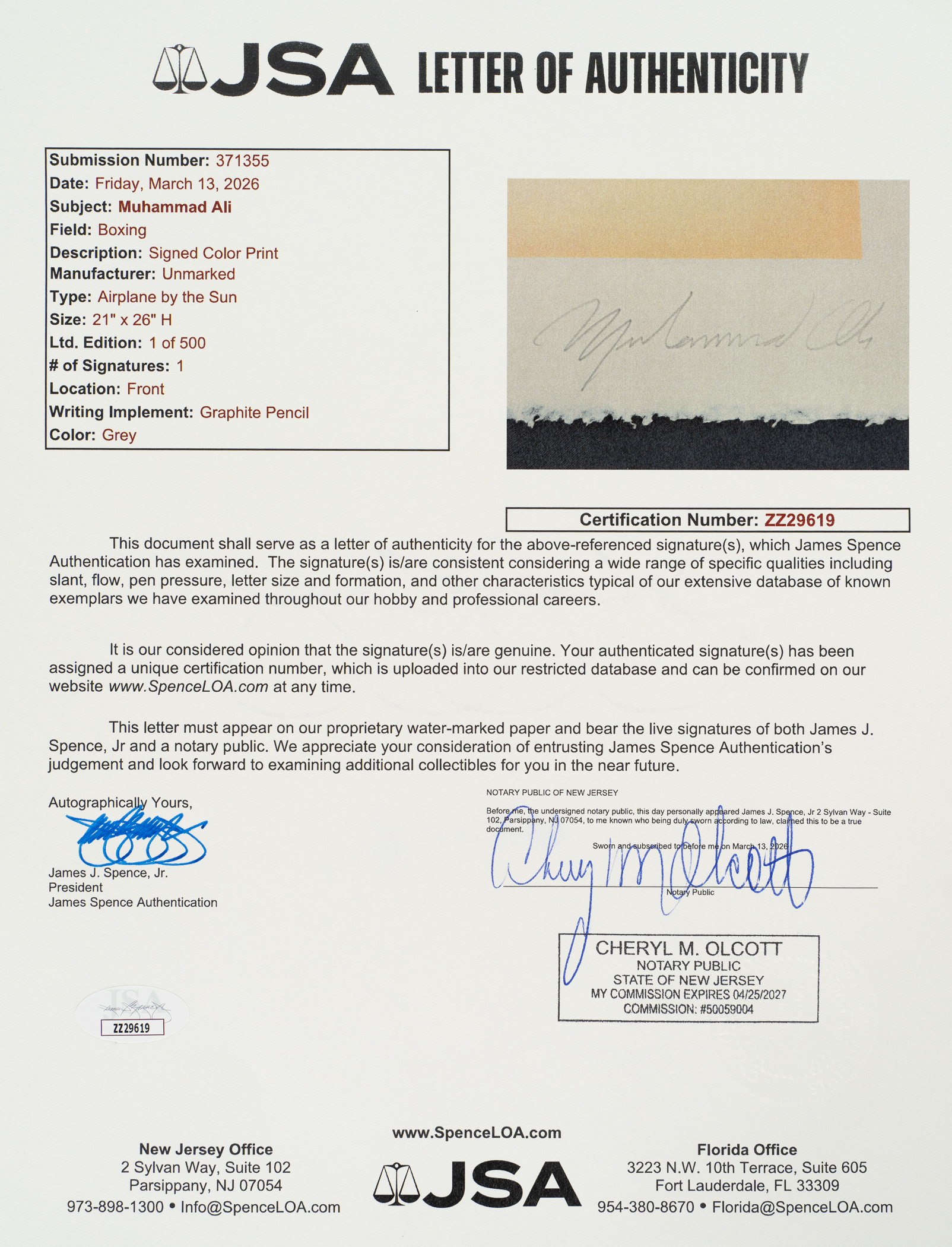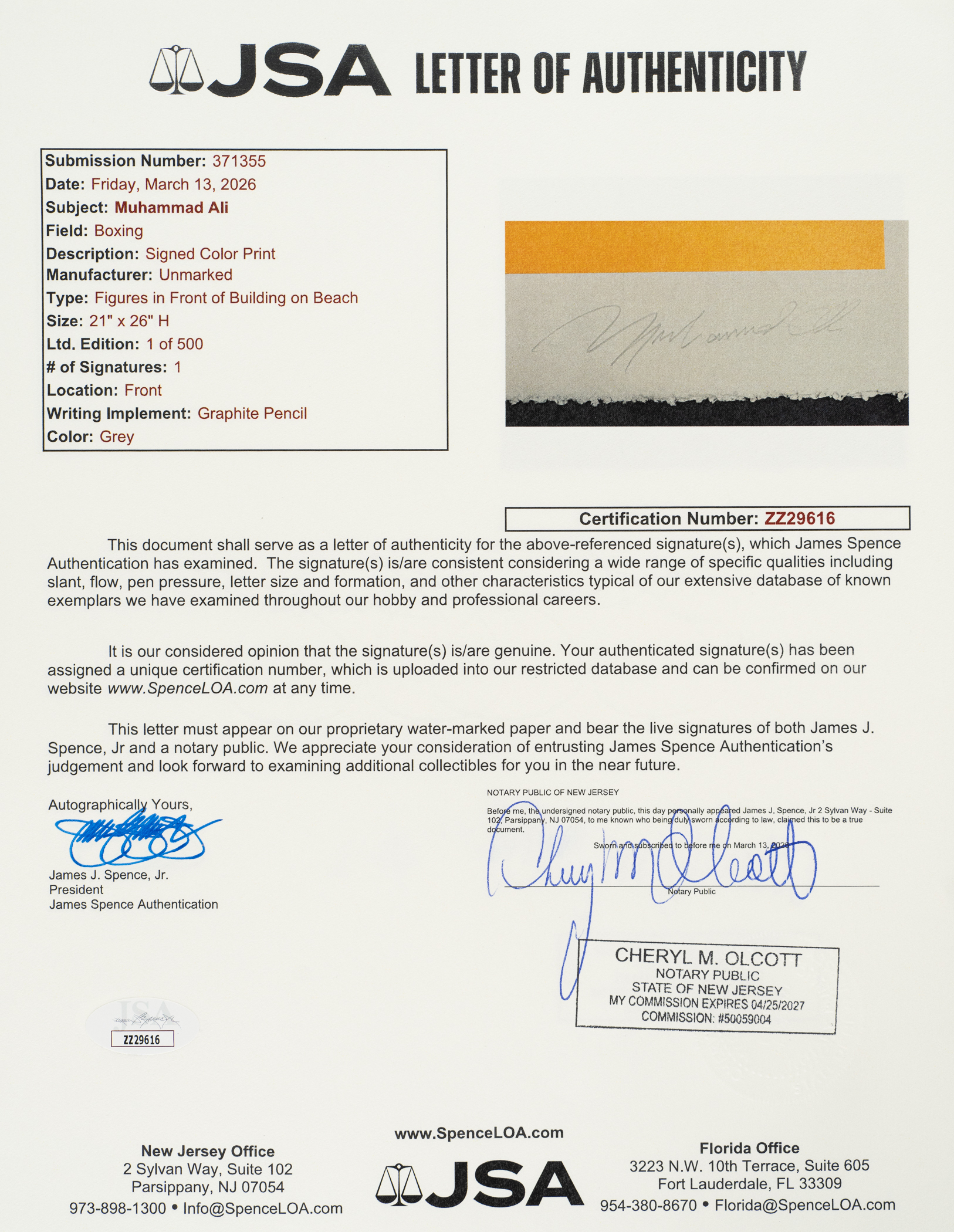 Complete set of four limited-edition silkscreen prints by Muhammad Ali, each signed by him in pencil in the lower-right margin. The prints are titled Sting Like A Bee, Under The Sun, Mosque II, and Guiding Light. The originals of these prints were part of an exhibition at the Roseland Grand Ballroom in New York in January 1979 that showcased several of Ali's art pieces. Each print's limitation number appears in the lower-left margin. Three of the prints measure 26 x 22 inches, while the other measures 27 x 22 inches. Near Mint condition overall. Total: 4 signed limited-edition prints. Full LOA from James Spence/JSA. The size/weight of this item requires that there will be an additional shipping charge for this lot.
