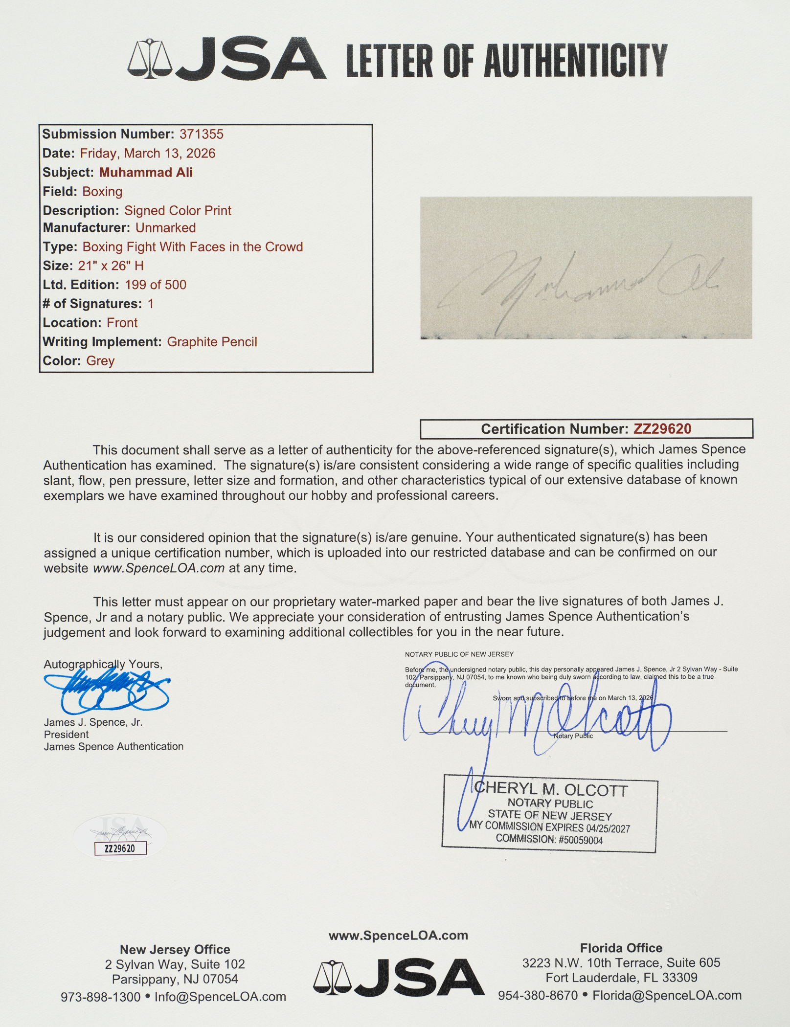 Limited-edition silkscreen print by Muhammad Ali, signed by him in pencil in the lower-right margin. Titled Sting Like A Bee, an original of this print was part of an exhibition at the Roseland Grand Ballroom in New York in January 1979 that showcased several of Ali's art pieces. Numbered "199/500" in the lower left margin. The print (26 x 22 inches) is in Near Mint condition overall. Full LOA from James Spence/JSA. The size/weight of this item requires that there will be an additional shipping charge for this lot.