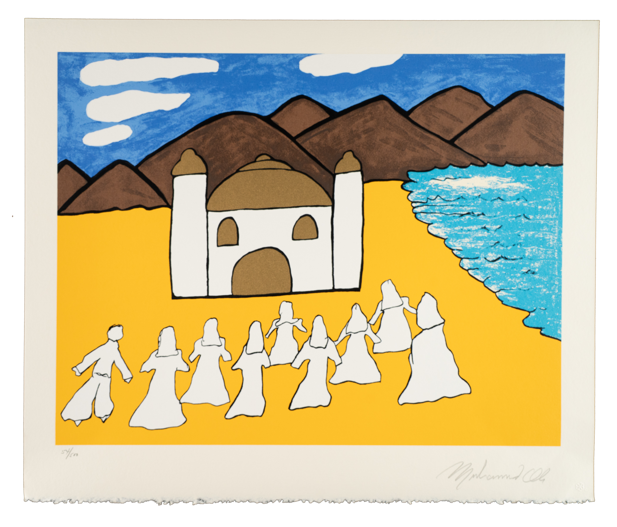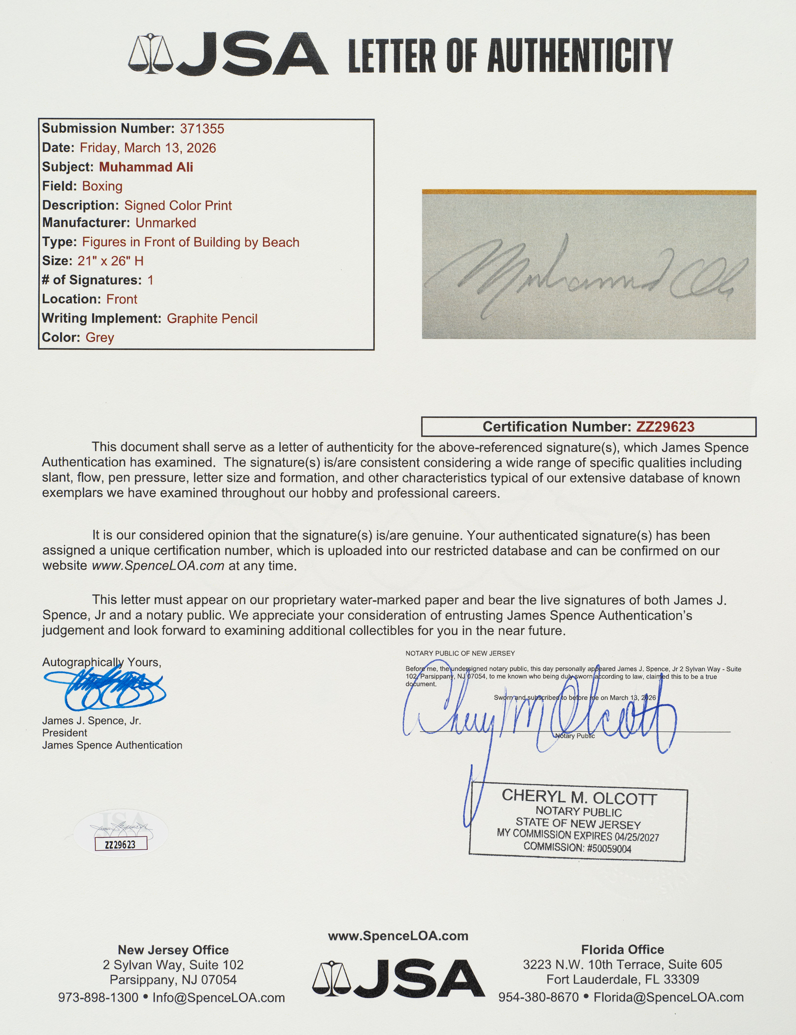 Limited-edition silkscreen print by Muhammad Ali, signed by him in pencil in the lower-right margin. Titled Mosque II, an original of this print was part of an exhibition at the Roseland Grand Ballroom in New York in January 1979 that showcased several of Ali's art pieces. Numbered "54/500" in the lower left margin. The print (26 x 22 inches) is in Near Mint condition overall. Full LOA from James Spence/JSA. The size/weight of this item requires that there will be an additional shipping charge for this lot.