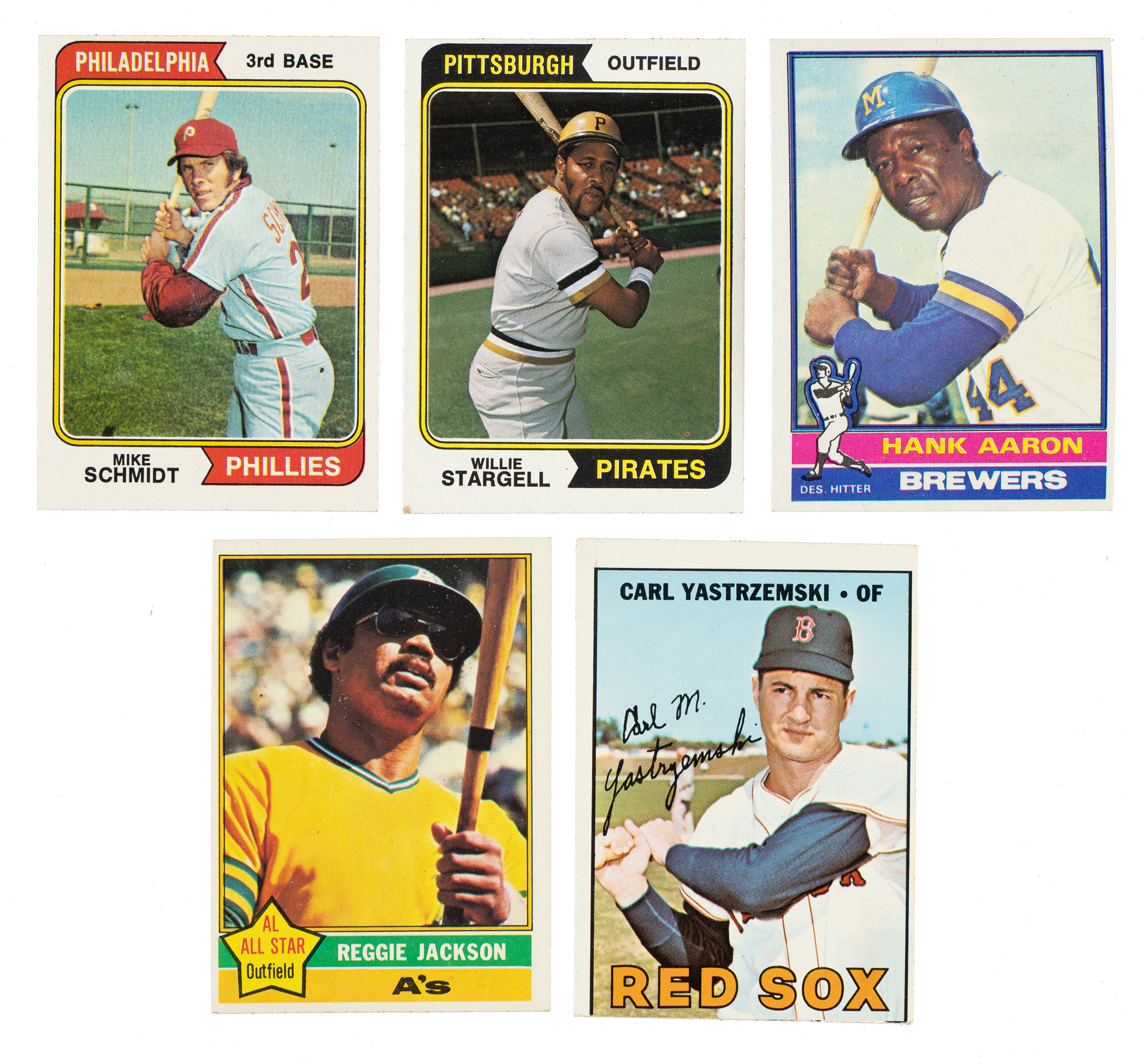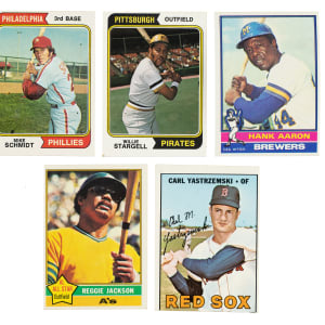 5) 1974 Topps (61 cards): #3 Aaron Special, 6 Aaron Special, 15 Torre, 51, 54, 55 F. Robinson (Ex-Mt), 60 Brock (Ex+), 68, 70 Allen, 74, 91, 100 Stargell (Vg-Ex), 114, 142, 143, 156, 169, 170, 171, 181, 184, 187, 236, 237, 283 Schmidt (Ex due mostly to centering), 310, 325, 331 Fisk/Bench AS (100/0 L/R, otherwise Nr/Mt), 336, 342, 352, 362, 377, 379, 380, 381, 395, 404, 407, 409, 428, 435, 444, 445, 446, 454, 467, 489, 517, 525, 527, 531, 535, 563, 581, 594, 596, 614, 617, 650, and 658.