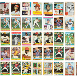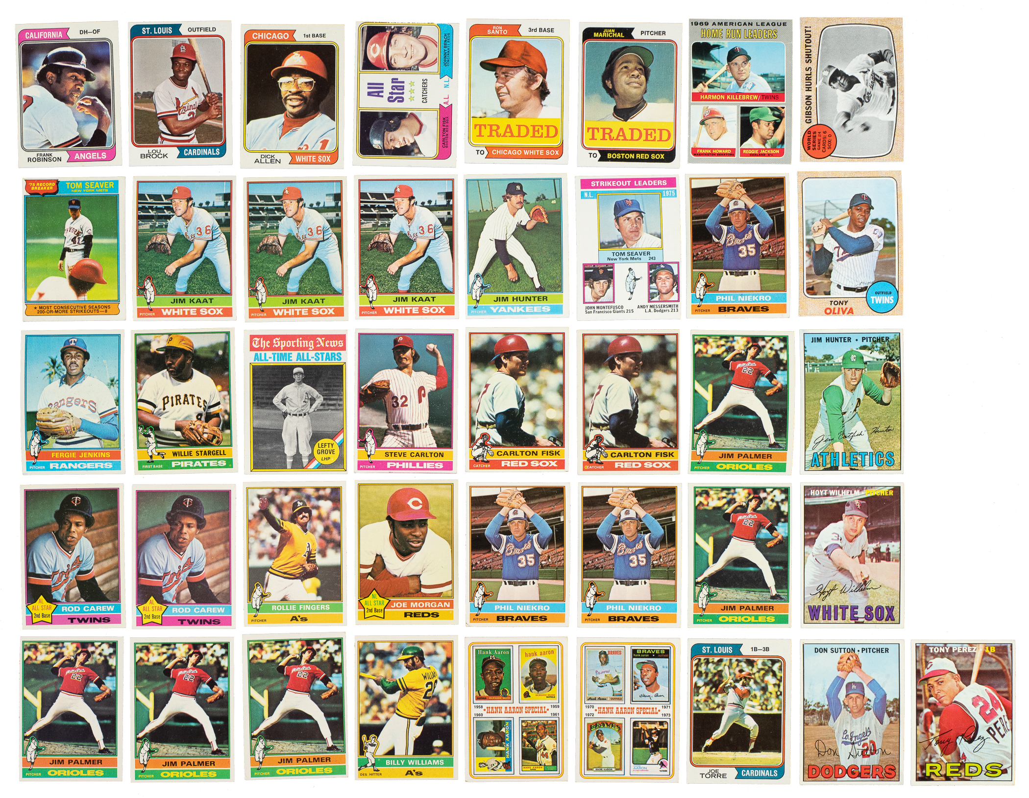 8) 1976 Topps (239 cards): #5 Seaver RB, 10 Brock (Nr/Mt), 17, two 20, 25, 28, 29, 33, 37, two 42, 43, 44, 45, 48, two 53, 54, 57, 59, 61, 64, 66, two 73, three 80 Kaat, three 81, 87, 88, 100 Hunter, two 104, 115, 119, 128, 130, 137, 141, 150 Garvey, 151, two 167, 187, 198, 203 NL Strikeout Leaders w/ Seaver, 215, 225, 229, 233, 236, 246, 248, 250 Jenkins, 255, 264, 265, 267, 270 Stargell (Ex), 273, two 274, 276, 278, 280, 281, two 283, 284, 296, 309, 310, 314, two 317, four 320, two 321, 324, 325 Perez, 329, 335, 337, 340 Rice (Ex-Mt), 350 Grove ATAS, 355 Carlton (Vg-Ex+), 357, two 358, three 359, 361, two 364, two 365 Fisk (both Ex), 366, two 368, 370, two 371, 376, 377, 379, two 380, two 381, 383, two 384, two 390, three 392, 394, two 396, two 397, two 400 Carew (Ex-Mt and Vg-Ex+), two 401, four 404, 405 Fingers, three 412, three 414, 415, 416, 420 Morgan, two 421, two 425, two 429, 430, three 435 Niekro, 437, two 438, 439, 440, 443, 445, two 447, five 450 Palmer (two Ex, two Vg-Ex, and Vg), two 455 Allen, two 460, 462, 464, 466, 470, 475, 476, 480 Schmidt (Vg-Ex), two 481, two 486, 494, 499, 500 Jackson (Ex), 515, 517, 522, 525 Williams, 526, 540, 544, 545, two 550 Aaron (Ex-Mt and Ex), two 565, two 570, 574, 581, 587, two 590, three 591, 595, two 596, two 597, 598, three 615, 617, 618, four 620, two 630, 631, 637, 640, 649, 651, and 657.