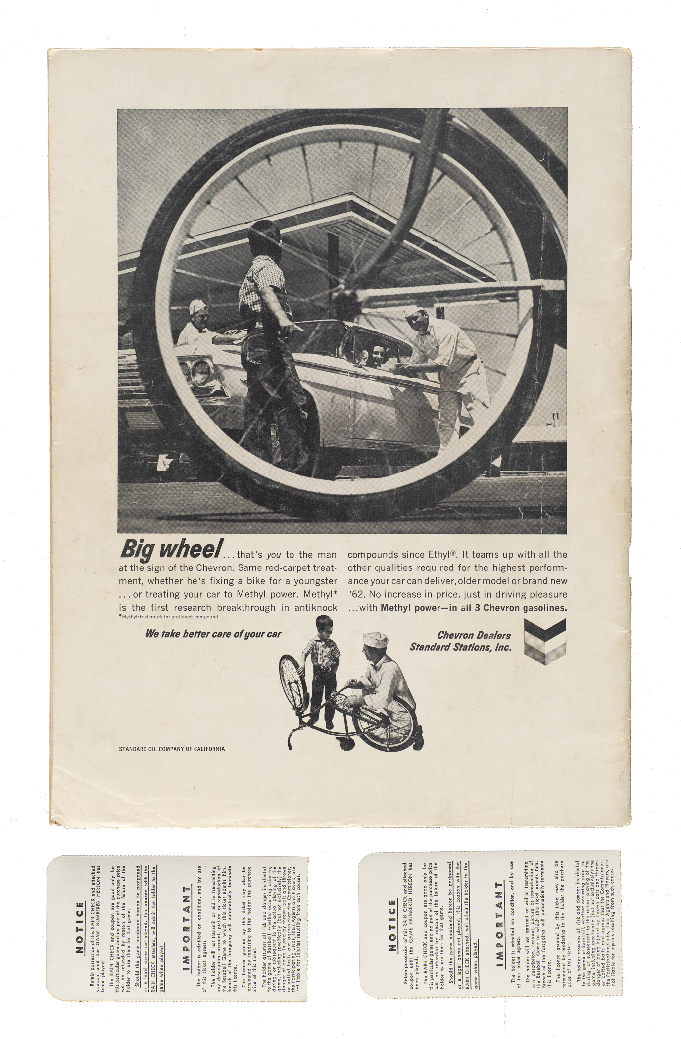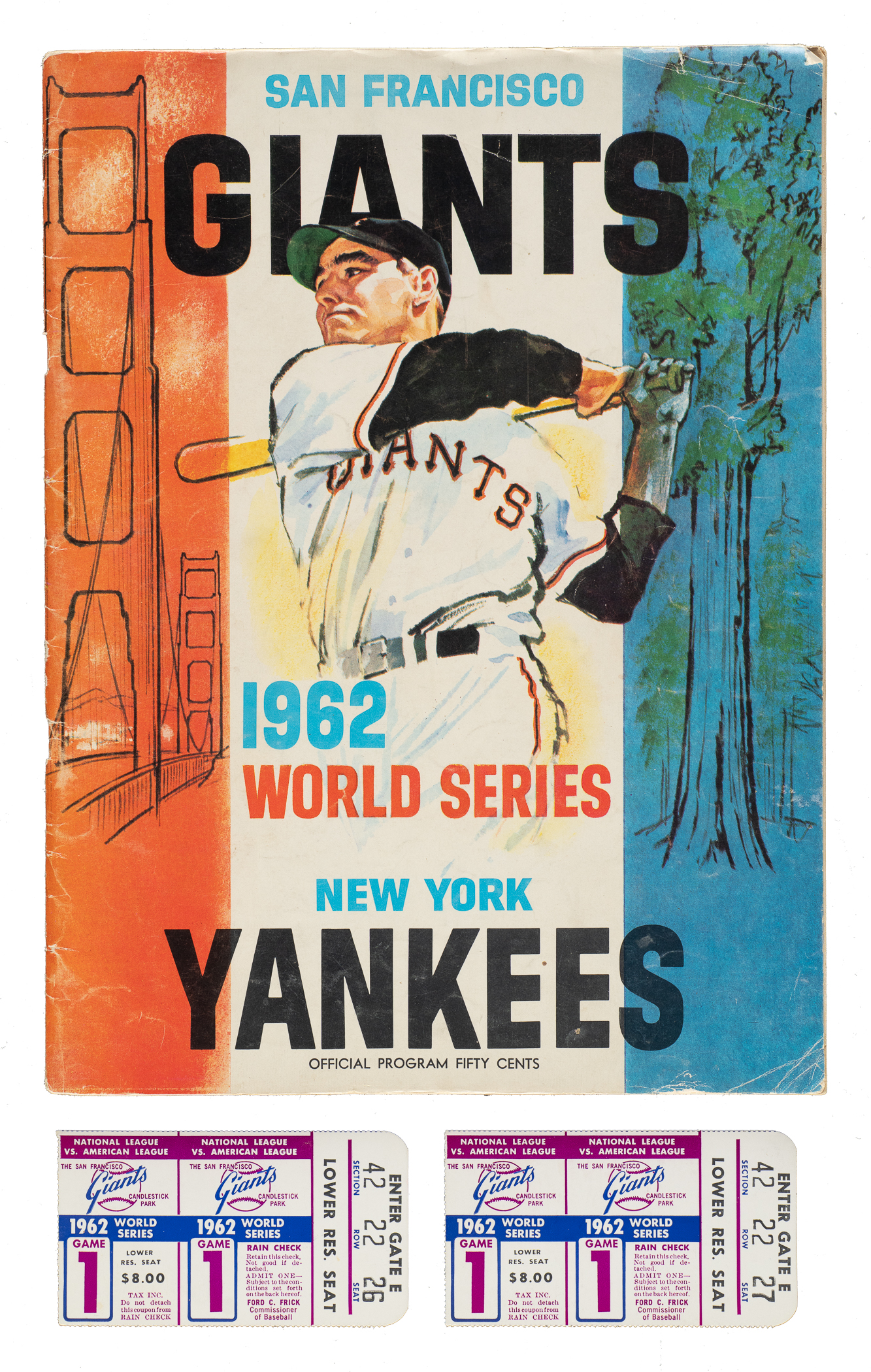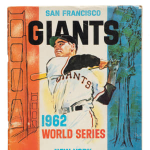 San Francisco Giants program issued for the 1962 World Series against the New York Yankees. The program (8 x 11 inches; unscored) is in Good to Very Good condition overall. Accompanied by a pair of ticket stubs (4 x 2.25 inches) to Game 1 at Candlestick Park. Excellent condition overall. Total: 3 items (1 program and 2 ticket stubs).