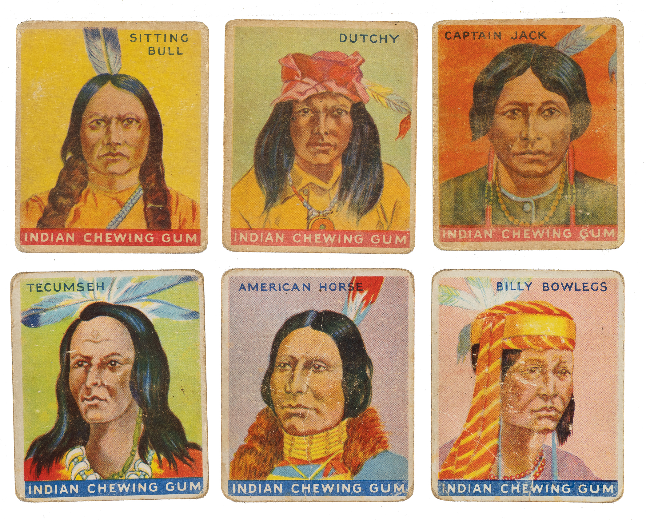 Collection of six 1933 R73 Goudey "Indian Gum" cards. This collection consists of the following: #38 Sitting Bull (Gd, Series of 96), 40 (Vg, Series of 96), 41 (partially erased marks on reverse, otherwise Gd, Series of 96), 42 (Gd, Series of 48), 43 (Fr, Series of 48), and 44 (Pr-Fr, Series of 48). Total: 6 cards.