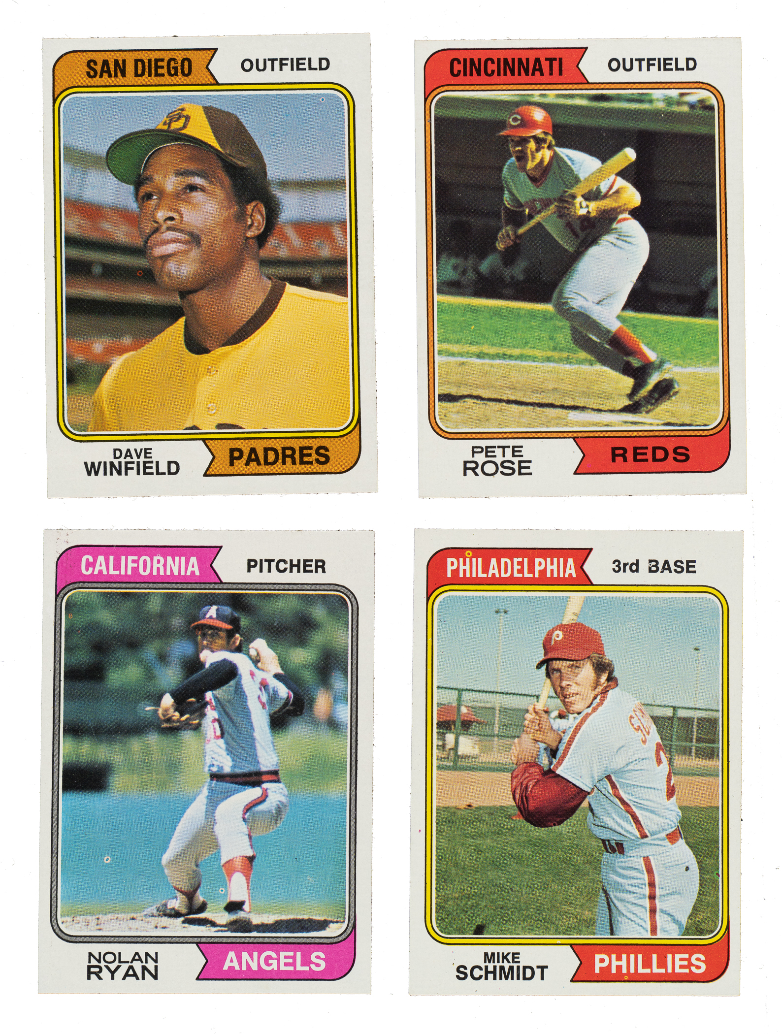 Presented is a very attractive and mostly high-grade collection of 1974 Topps baseball cards consisting of all 660 basic cards, a complete Traded set of forty-four cards, and a complete Team Checklist set of twenty-four cards. Included are four "Washington, Nat'l" variations (#148, 250, 309, and 387) and both variations of 654 Alou. Condition is 46% Nr/Mt to Nr/Mt-Mt, 48% Ex to Ex-Mt, and 6% Vg to Vg-Ex. Keys: #1 Aaron (Ex+), 10 Bench (Vg-Ex), 20 Ryan (Nr/Mt), 250a McCovey (Ex), 252 Parker RC (Ex-Mt due to small stain), 283 Schmidt (Nr/Mt), 300 Rose (30/70 T/B, otherwise Nr/Mt-Mt), and 456 Winfield RC (miscut centering on reverse, otherwise Nr/Mt-Mt). Condition of the Traded series ranges from Ex to Nr/Mt-Mt (averaging Ex-Mt+), with a few slightly lesser. Condition of the team checklists ranges from Vg-Ex to Ex-Mt (averaging Ex), with a couple lesser. This is a superior, mostly high-grade 1974 Topps complete set with numerous highlights. Total: 733 cards.
