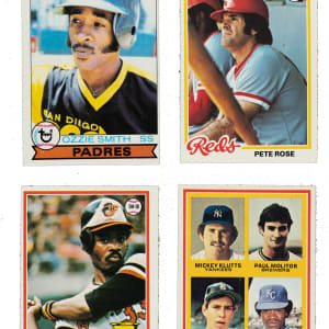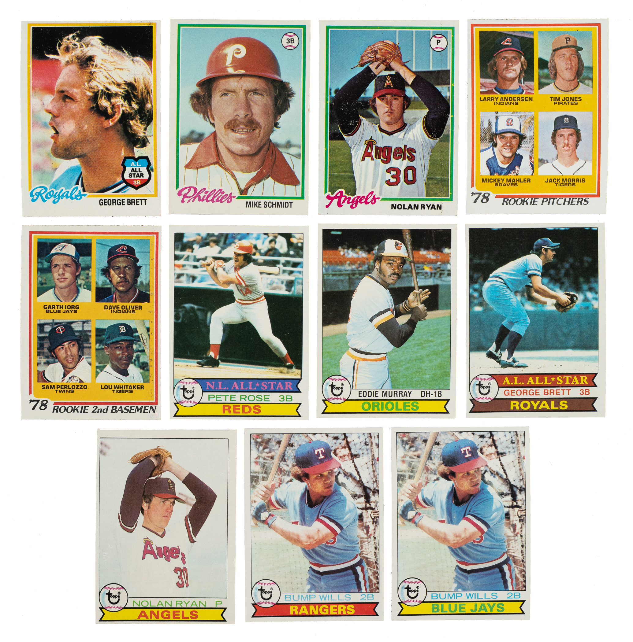 Presented are two complete sets of Topps baseball from 1978 and 1979, highlighted by numerous stars and rookie cards, including those of Hall of Famers Eddie Murray, Jack Morris, Paul Molitor, and Ozzie Smith. 1) 1978 Topps Complete Set (726): Condition is 57% Nr/Mt to Nr/Mt-Mt, 33% Ex to Ex-Mt, and 10% Vg to Vg-Ex (including a couple Gd). Keys: #20 Rose (Nr/Mt-Mt), 36 Murray RC (Ex due solely to centering), 100 Brett (Ex due to centering), 360 Schmidt (Vg-Ex), 400 Ryan (Ex-Mt), 703 Morris RC (Ex-Mt+), 704 Whitaker RC (Vg-Ex+), and 707 Molitor/Trammell RC (Nr/Mt-Mt). 2) 1979 Topps Complete Set (727) Plus One Variation: Condition is 36% Nr/Mt to Nr/Mt-Mt, 52% Ex to Ex-Mt, and 12% Vg to Vg-Ex. Keys: #115 Ryan (Vg-Ex), 116 Smith RC (80/20 L/R, otherwise Vg-Ex), 330 Brett (Ex+), 640 Murray (Vg+), and 650 Rose (Ex+). Includes both variations of #369 Wills. This is a very attractive mid- to high-grade grouping of classic 1970s sets with numerous highlights. Total: 1,453 cards. The size/weight of this item requires that there will be an additional shipping charge for this lot.