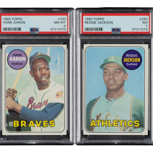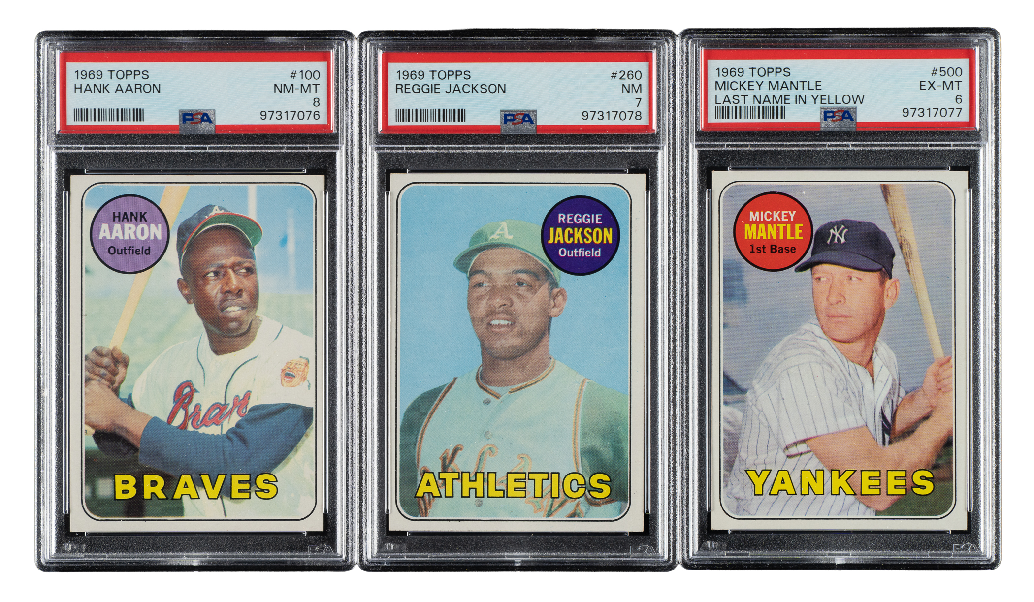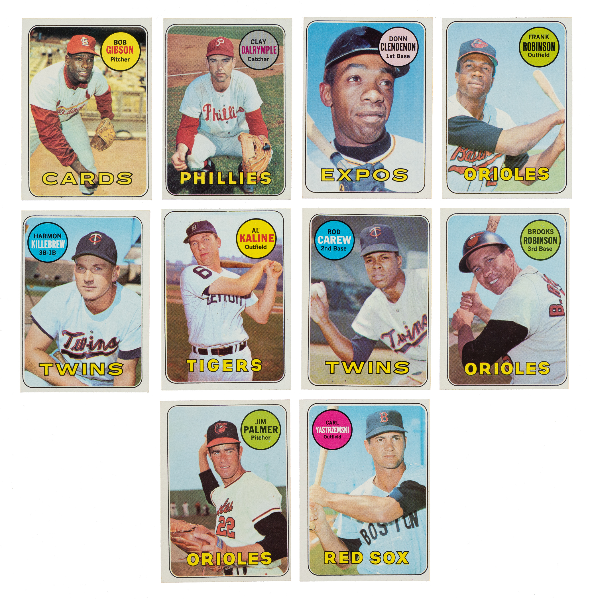 Complete set of one of the great classics of the 1960s! Included are 27 variations (including 20 of the 23 scarce "white letters"), which makes this a near-complete master set of 691 cards (missing only variations for #49a, 441a WL, 468a WL, 500a Mantle WL, and 567a). Also included are seven duplicate "white letter" variations (#440, 454, 461, 470, 471, 485, and 505). The 1969 Topps set is highlighted by the rookie cards of Oakland A's HOFers Reggie Jackson and Rollie Fingers, plus the last card of Mickey Mantle. This final card of "The Mick," who retired March 1, 1969, contains his complete statistical record on the reverse. Fourteen cards are graded and encapsulated by PSA. Condition is 30% Nr/Mt (including some Nr/Mt-Mt), 64% Ex to Ex-Mt, and 6% Vg to Vg-Ex (including a couple with a slight miscut and a few that measure small). Keys: #20 Banks (NM-MT 8), 50 Clemente (NM-MT 8), 95 Bench (MINT 9 [OC]), 100 Aaron (NM-MT 8), 120 Rose (EX-MT 6), 130 Yastrzemski (Ex due to centering), 151a Dalrymple/Phillies (Ex), 190 Mays (EX-MT 6), 200 Gibson (Ex+), 208a Clendenon/Expos (Vg-Ex+), 250 F. Robinson (Nr/Mt-Mt), 255 Carlton (NM-MT 8), 260 Jackson RC (NM 7), 375 Killebrew (15/85 L/R, otherwise Ex), 410 Kaline (Ex), 440a McCovey/last name in white (NM-MT 8 [OC]), 480 Seaver (NM-MT 8 [OC]), 485a Perry/last name in white (EX-MT 6), 500 Mantle (EX-MT 6), 510 Carew (Ex), 533 Ryan (EX-MT 6), 550 B. Robinson (Ex due to centering), 573 Palmer (Ex due to centering), and 597 Fingers RC (MINT 9 [OC]). The following variations are included: #47, 77, 99, 107, 151, 208, 440 McCovey WL, 444 WL, 447 WL, 451 WL, 452 WL, 454 WL, 461 WL, 464 WL, 470 WL, 471 WL, 473 WL, 476 WL, 482 WL, 485 WL, 486 WL, 491 WL, 493 WL, 501 WL, 505 WL, 511 WL, and 582. This near-complete master set of one of the great 1960s Topps issues, loaded with Hall of Famers, represents an outstanding collecting value. The SMR value for just eight of the graded cards (not including the four PSA-qualified cards) is $4,260. Total: 698 cards (complete set of 664 plus 27 variations and 7 duplicates). The size/weight of this item requires that there will be an additional shipping charge for this lot.